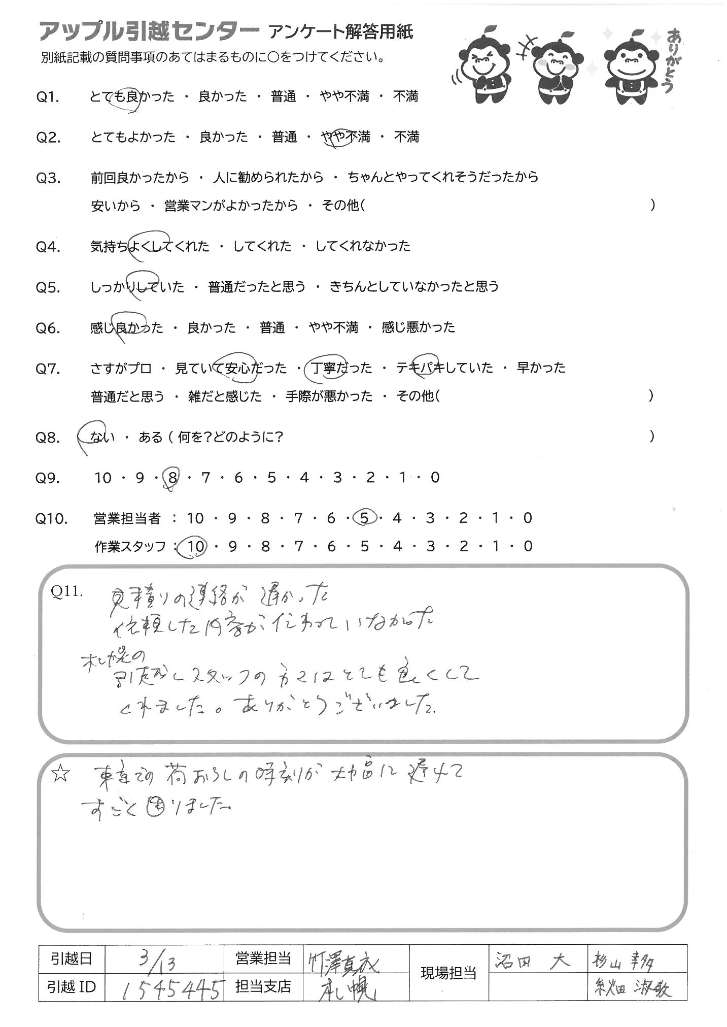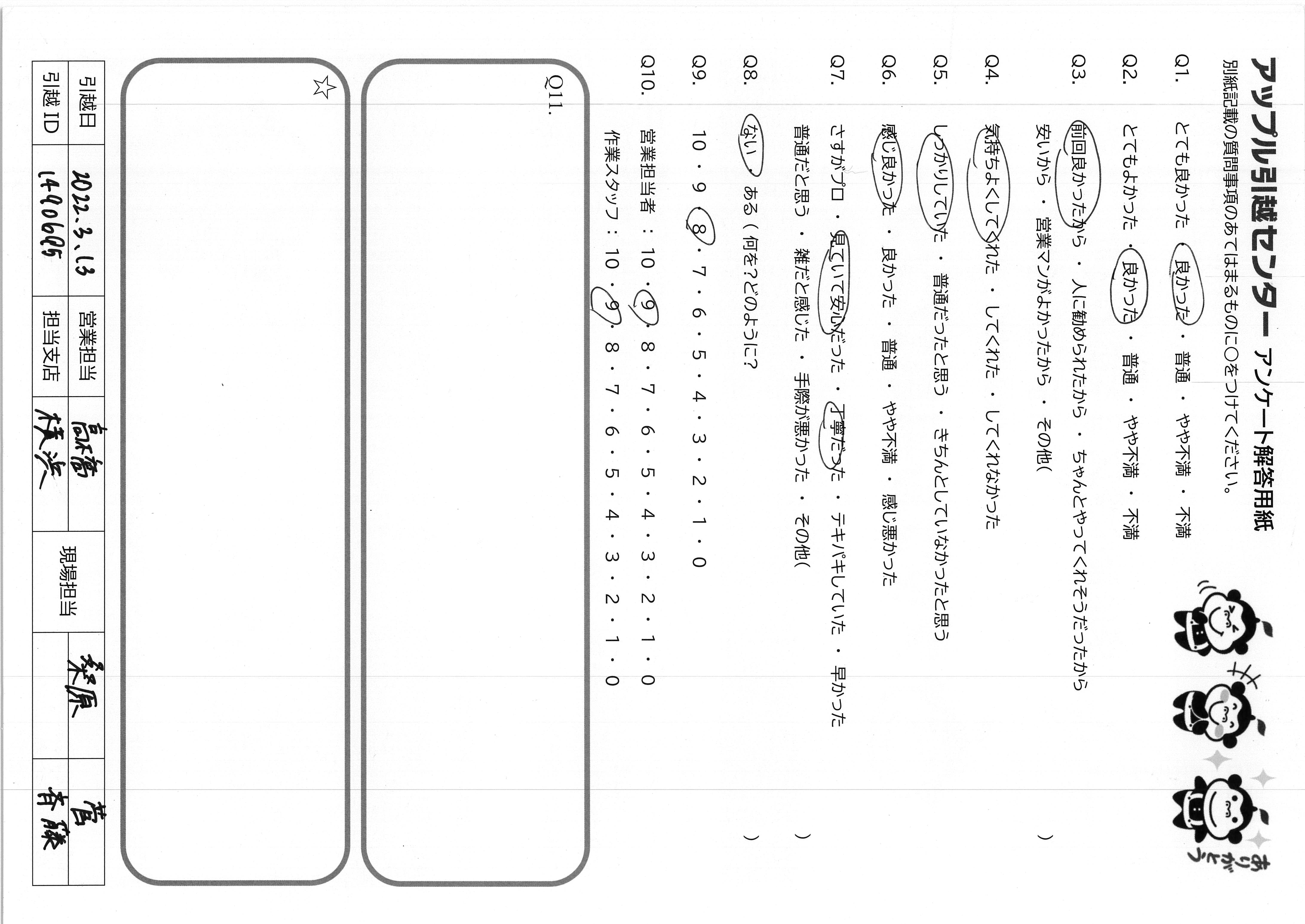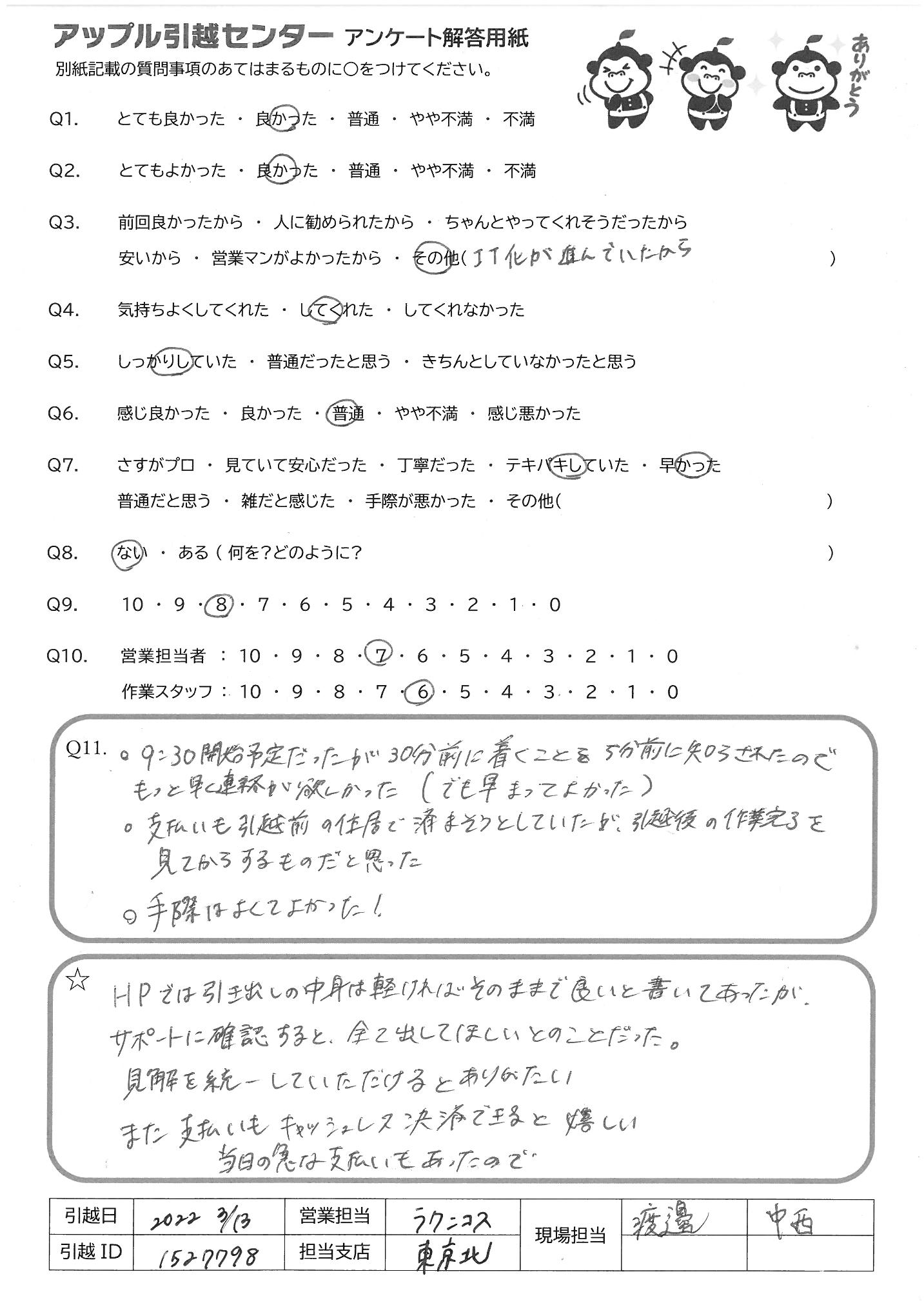 A.・9:30開始予定だったが、30分前に着くことを5分前に知らされたので もっと早く連絡が欲しかった(でも早まってよかった) ・支払いも引越前の住居で済まそうとしていたが、引越後の作業完了を 見てからするものだと思った ・手際はよくてよかった