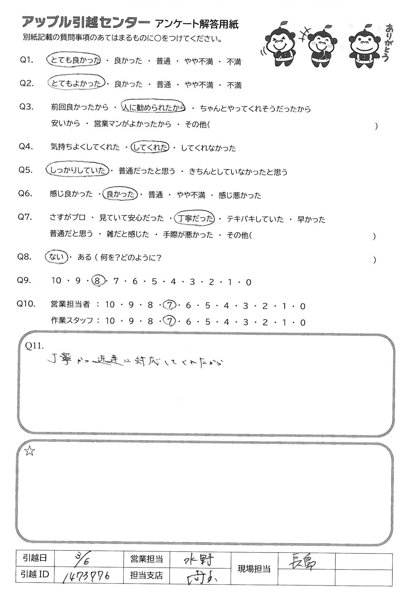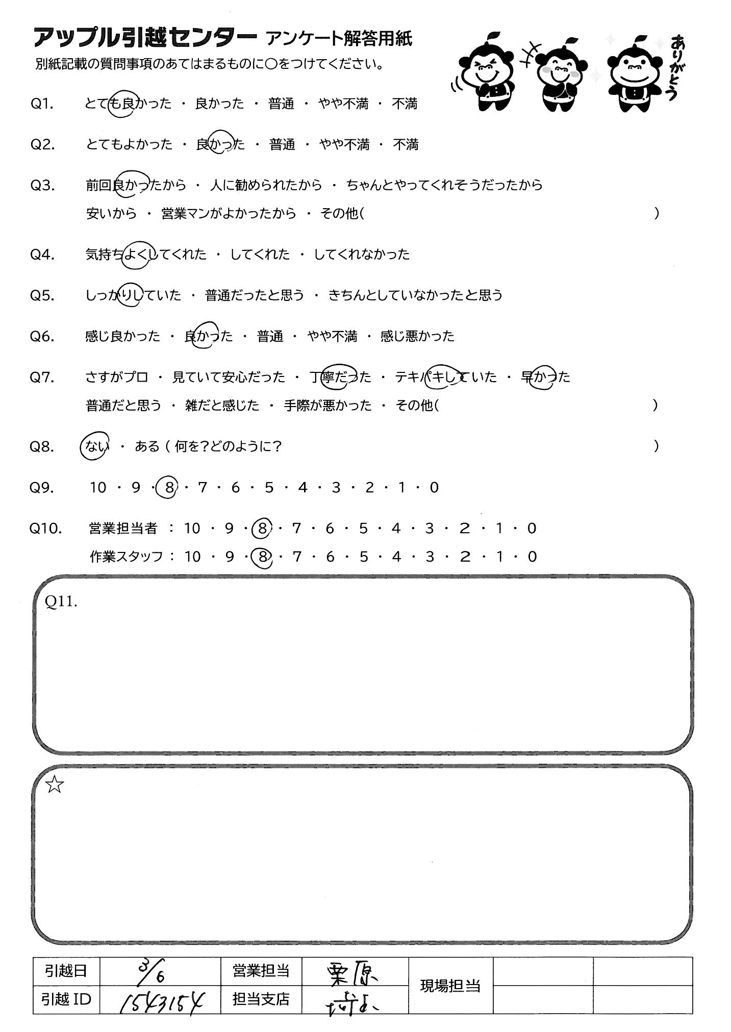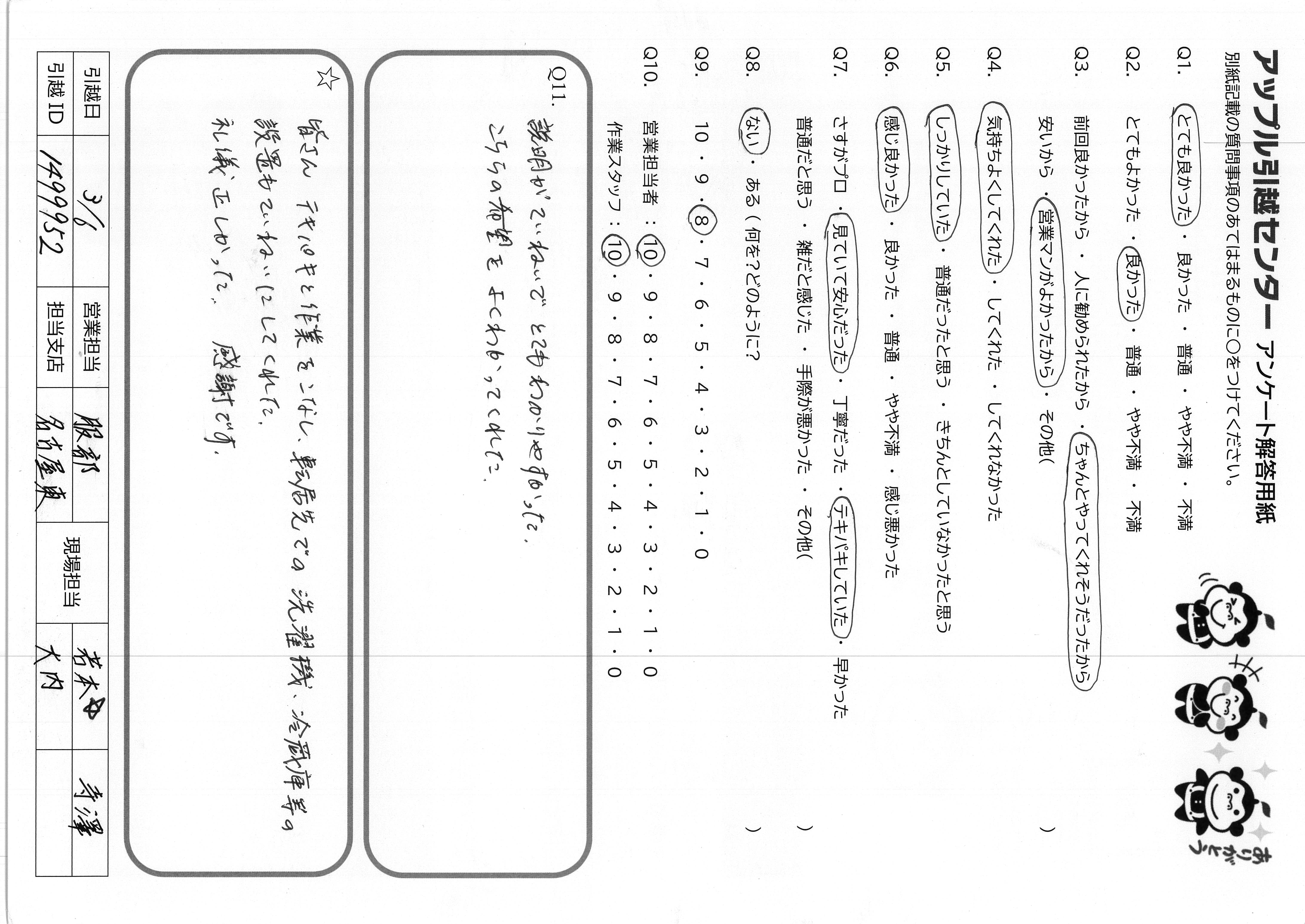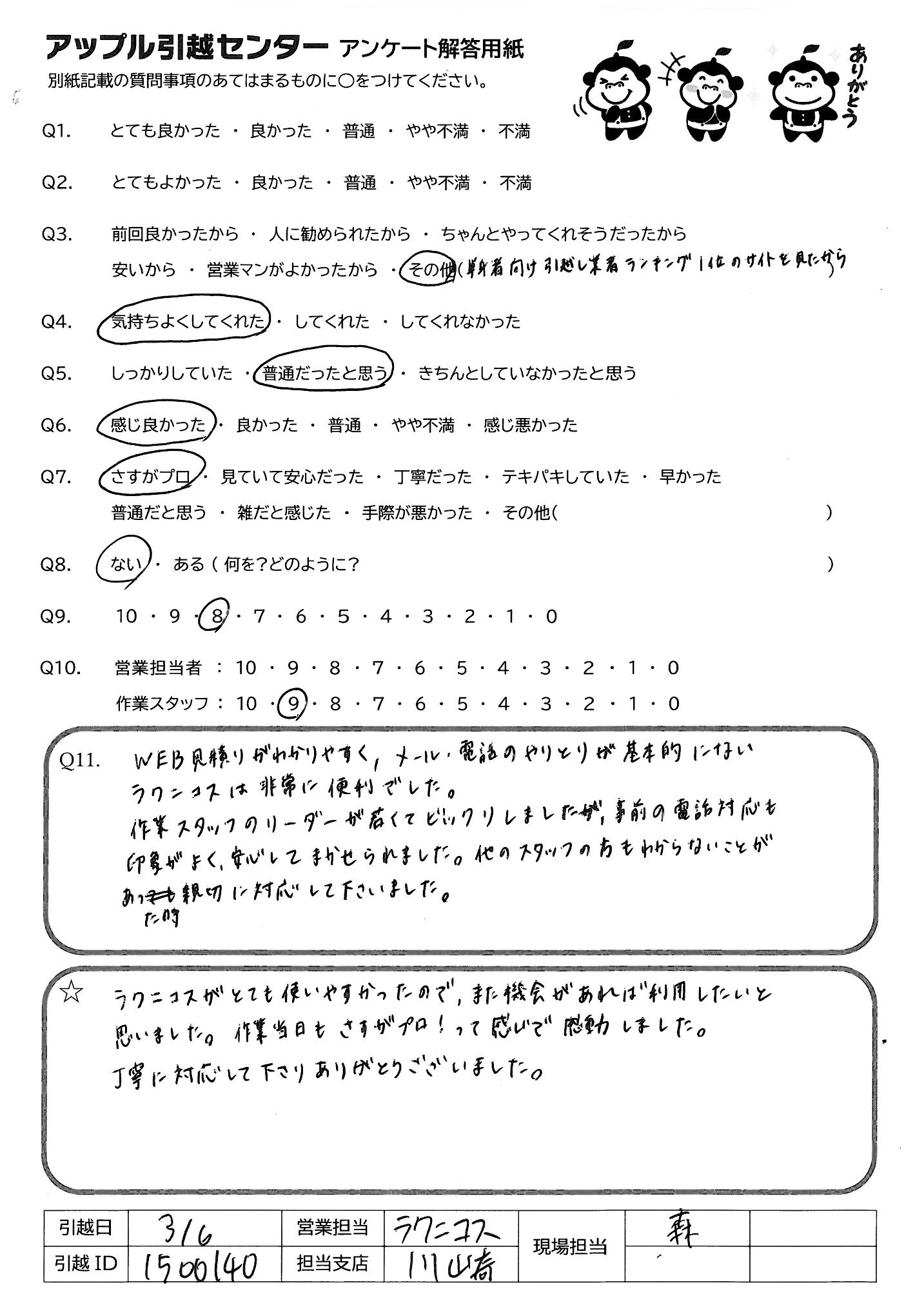 A.当日のご担当責任者の方はとても丁寧で、みなさんテキパキしてらっしゃいましたし、急かされることもなく、気持ちよく引っ越しできました。
