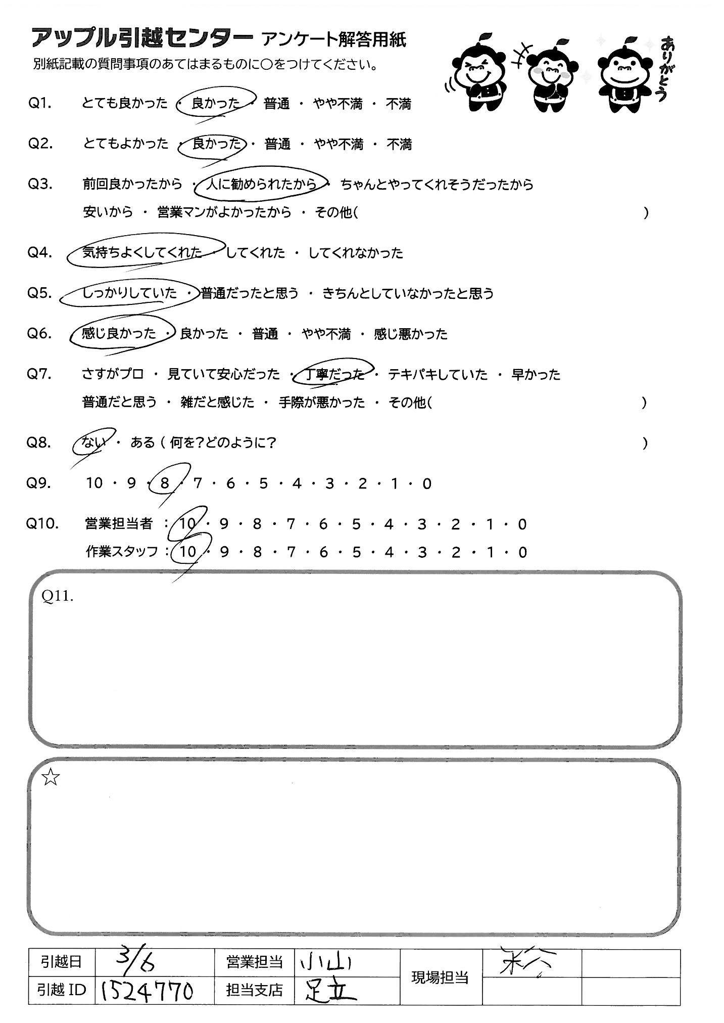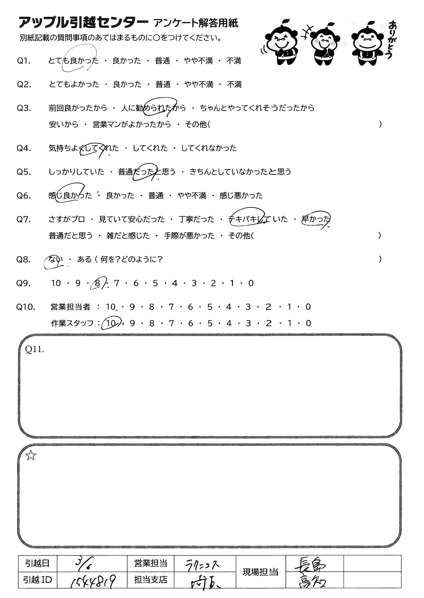 A.急いで作業されてるにも関わらず、ポイントポイントで家具の 位置だったり、あとで私達が困らないように、やさしく きれくれた。困っている事も考え方を提案してくれたり 心のある対応でとても良い引っ越しになりました
