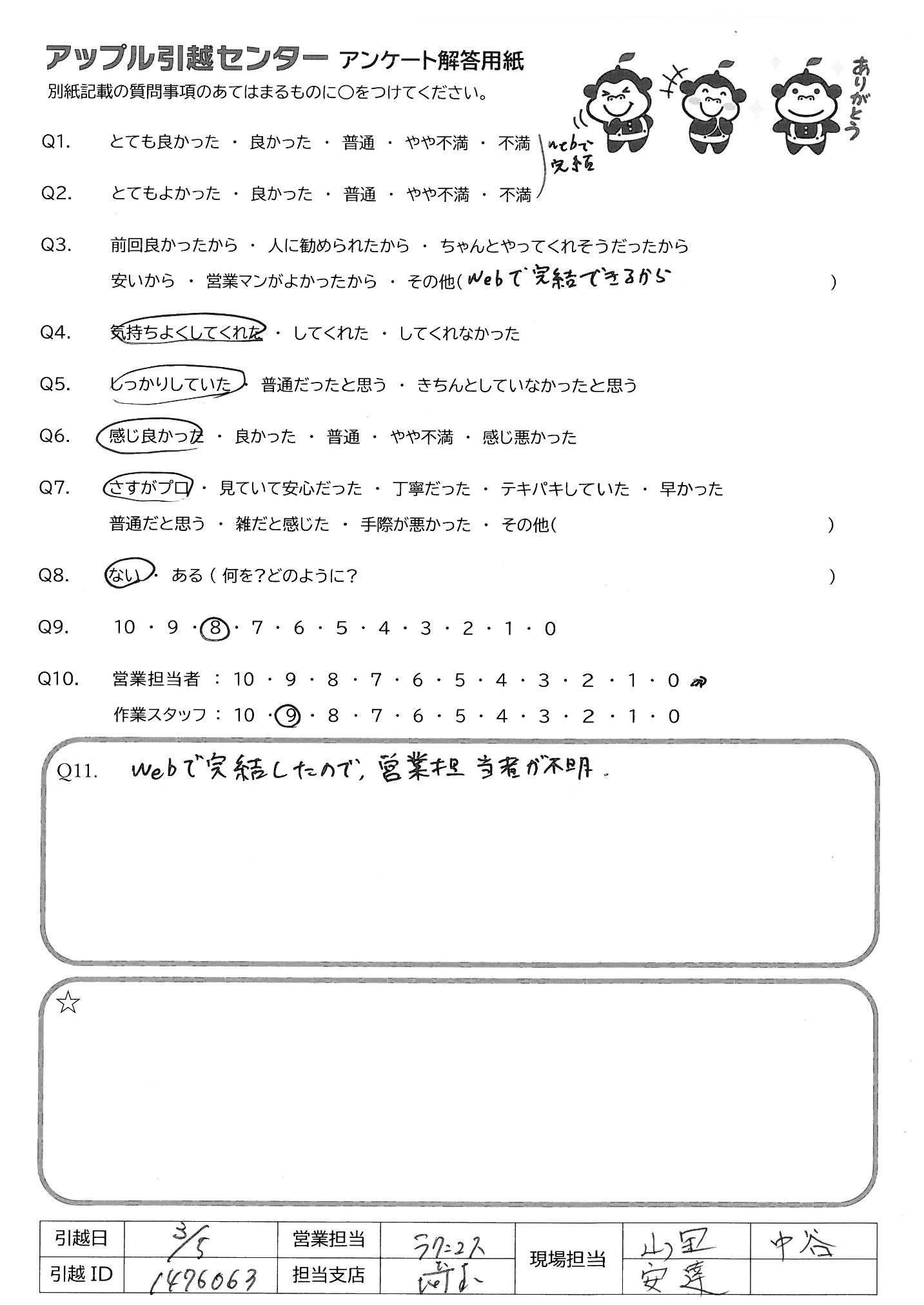 A.営業担当者には追加作業の依頼等も含めとても丁寧な対応をしていただいた。 作業スタッフにも手際よく作業にしていただき、スムーズに引越しを完了できた。あえて一点指摘するとすれば、家具に直接貼られたガムテープに剥がしにくいものがあったので、養生テープ等にしていただければさらに良いと感じた。