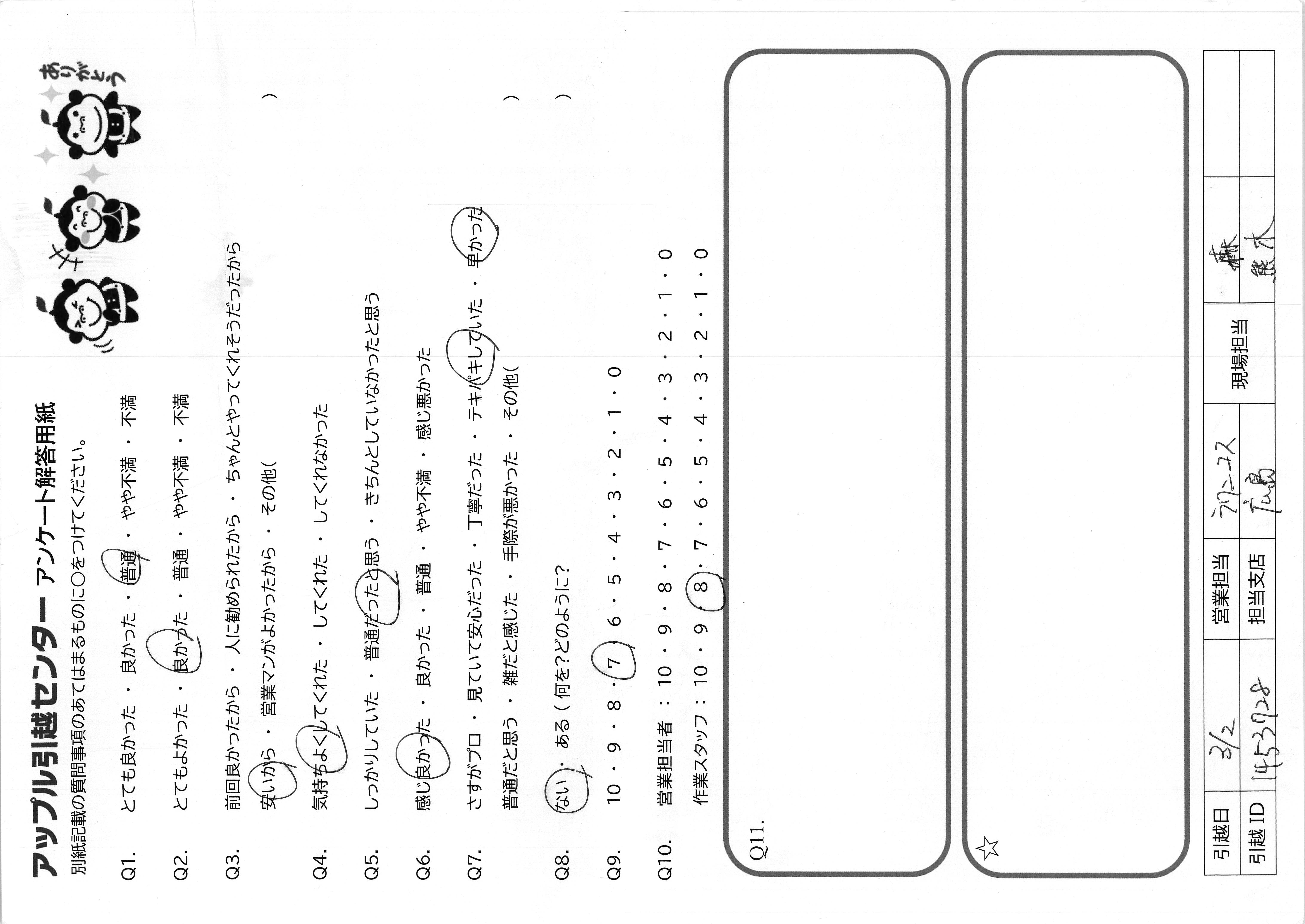A.引越しは楽しいものではないですが、だからこそ 今度また引越すことがあれば、アップルさんに お願いしたいと思います ありがとうございました