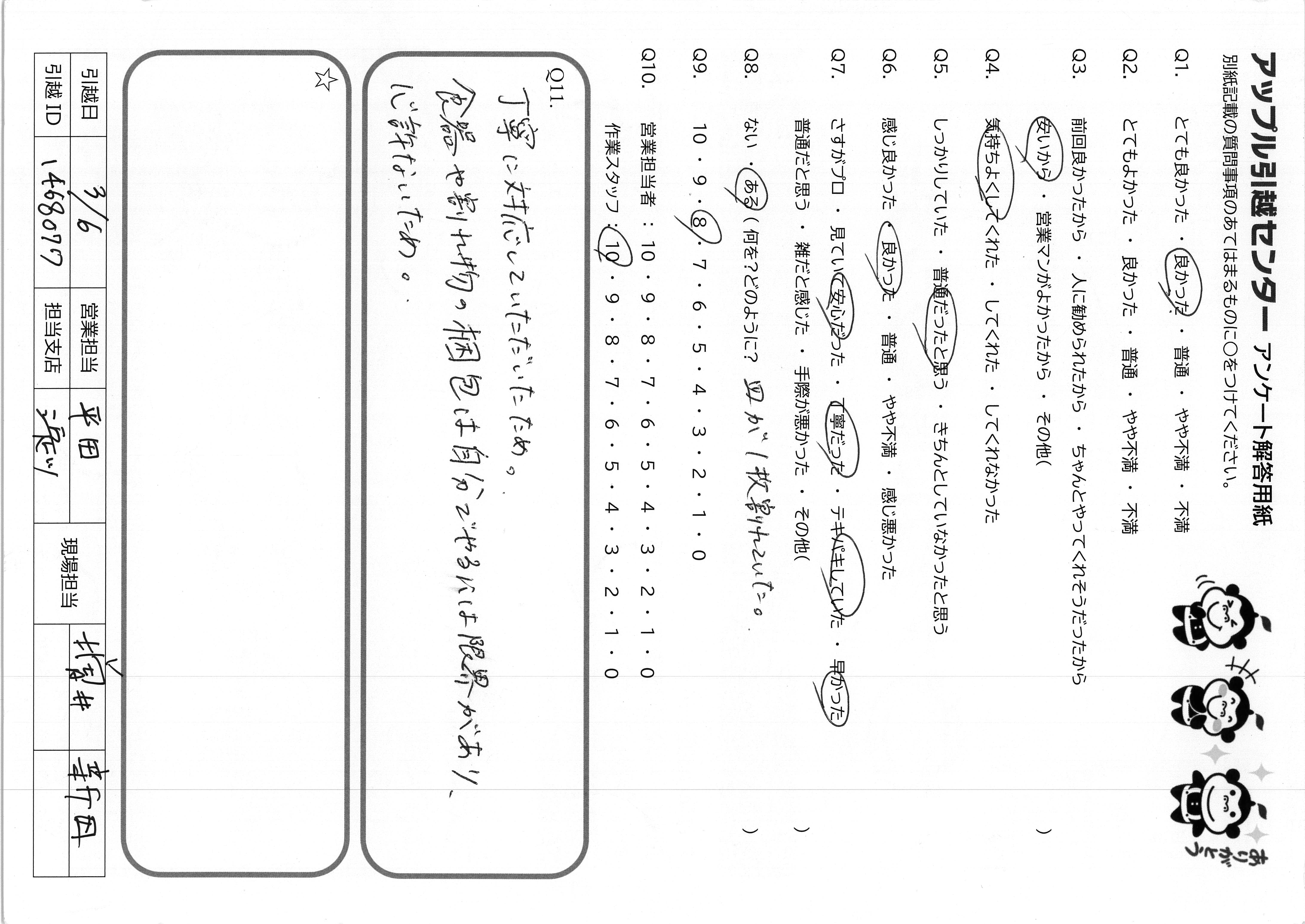 A.引越しスタッフはリーダー中心にスピーディかつていねいな作業をして頂き 文句なしの100点満点だと感じた。同じスタッフならばまた頼みたいし 他の人にもすすめたい 素晴らしかった。 何度も引越しているが ダントツの一番だった。最高評価をあげて欲しい