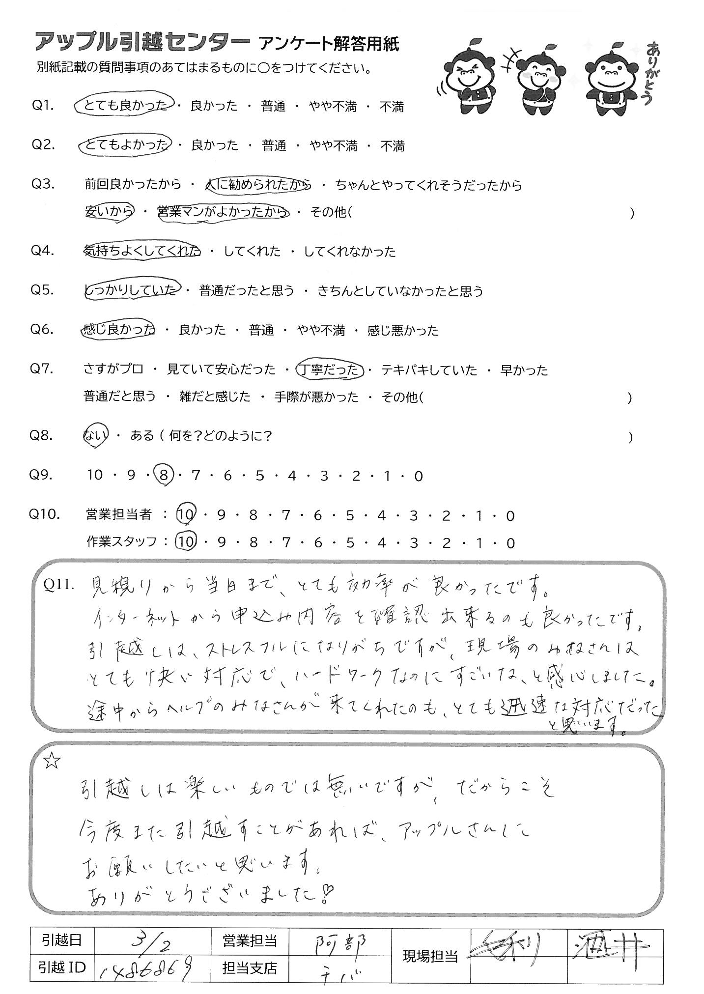 A.今回、引っ越し侍の一括見積もりで値段も押さえられて評判のいいところで探していましたが、貴社にしてよかったと思います。 早速の知り合いの引っ越し検討している人に勧めました。また機会があれば利用したいと思います。ご対応ありがとうございました。