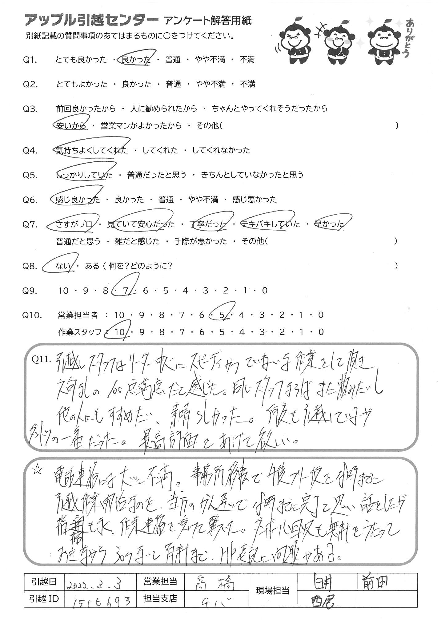 A.これまでの経験で、他社さんですがスタッフさん3人中一人が女性(しかも女性がリーダー)ということはありましたが、やはり力仕事なので、お二人のうち一人が女性であることに不安はありました(すみません)。もちろん問題はなかったのですが、正直もう少し早く終わるかなと思っていました。前回アップルさんを利用した際は、梱包もお願いし、男性3名で「早い」っていう印象だったので。ありがとうございました。また利用されていただきたいです。