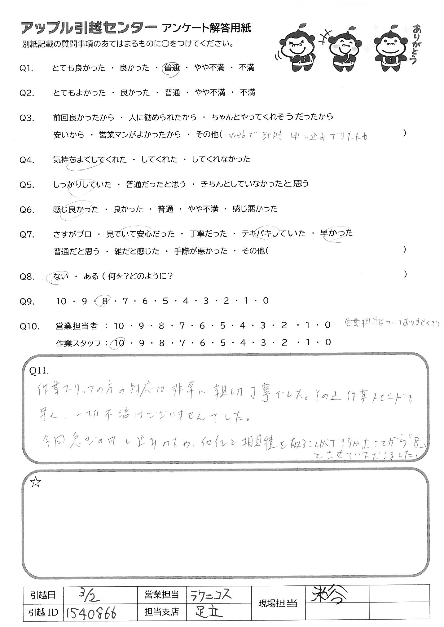 A.営業→見積もり連絡対応の女性や、そのあと担当の男性も丁寧に対応してくれた。また段ボールの配送についても、きちんと連絡説明をくれた 作業者→二人できてくれたが、リーダー?のかたが指示の際にきちんとしてお礼などもしているのが好感を持てた。作業もてきぱきしていた
