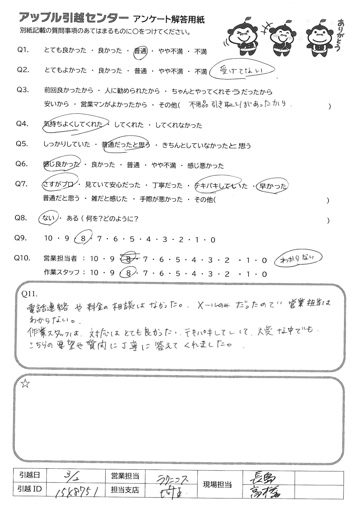 A.作業スタッフの方の対応は非常に親切丁寧でした。その上、作業スピードも 早く、一切不満はございませんでした。 今回急ぎの申し込みのため、他社と相見積を取ることができなかったから「8」とさせていただきました