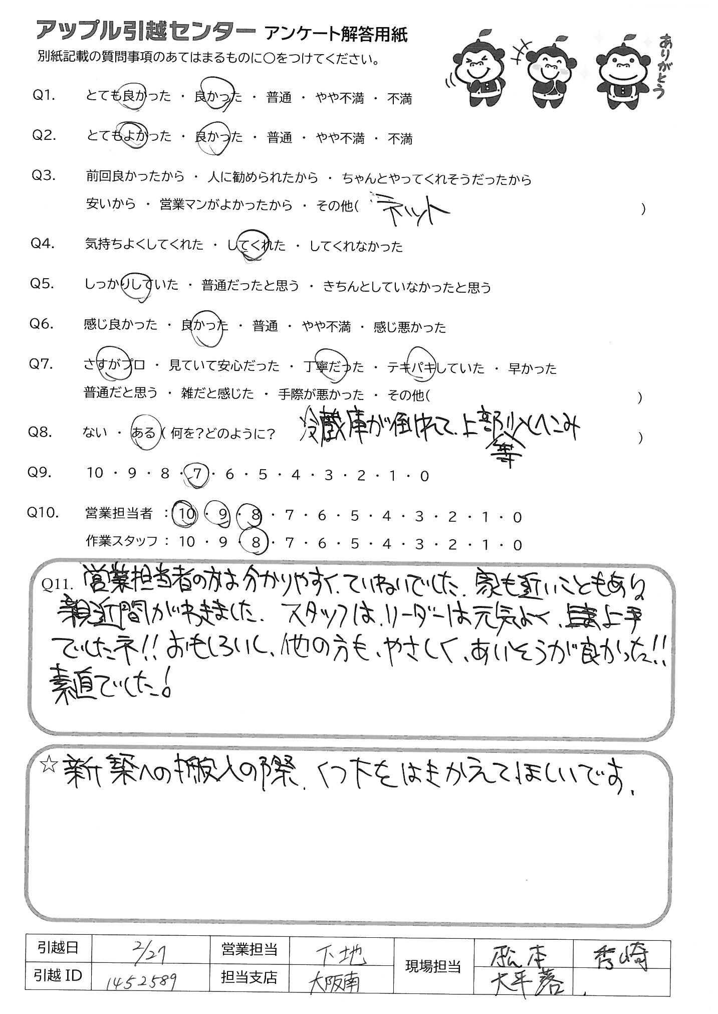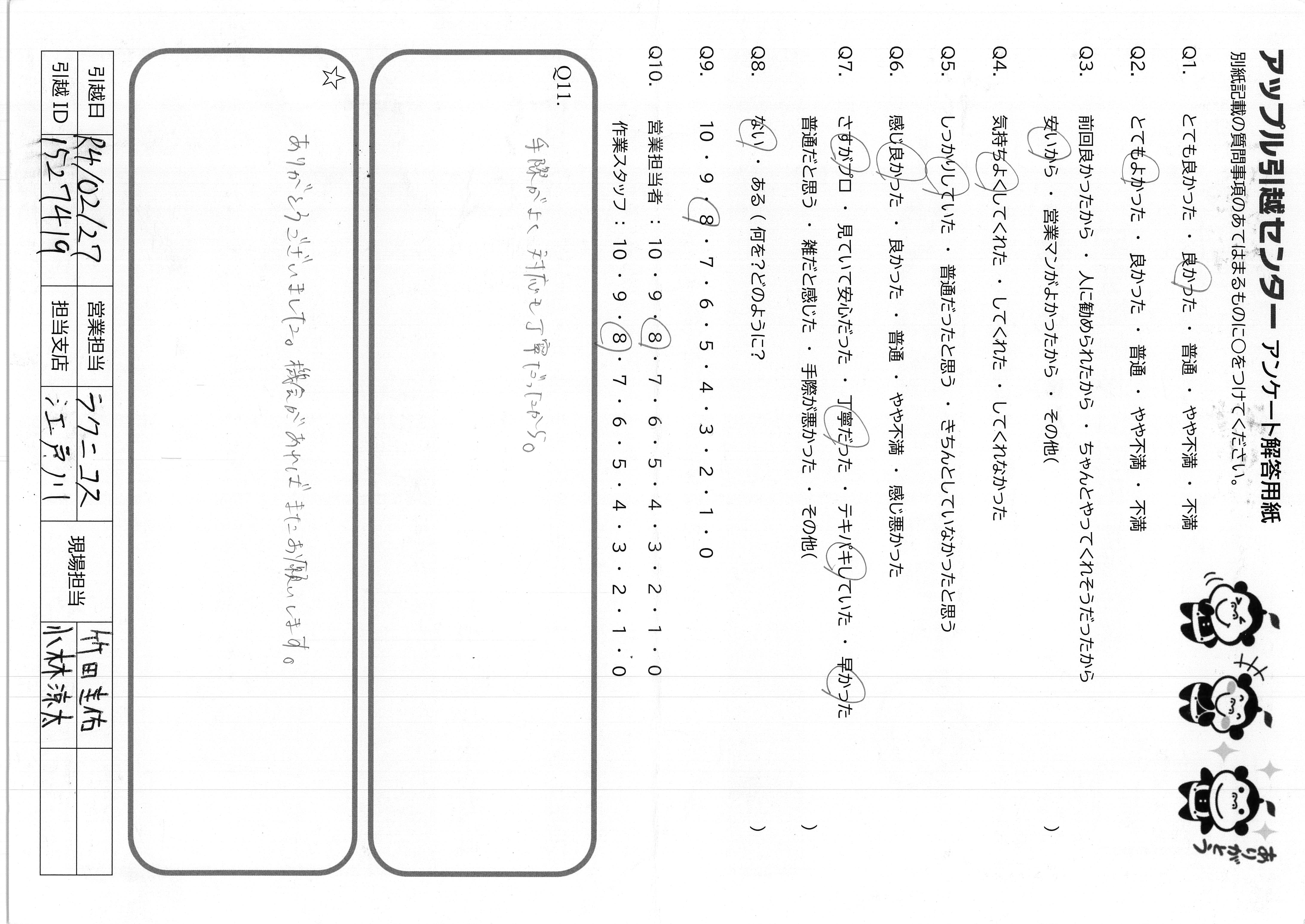 A.多少のトラブルはあったが、全体的に大変満足しました。また引越しがあるときは是非利用を検討したい。
