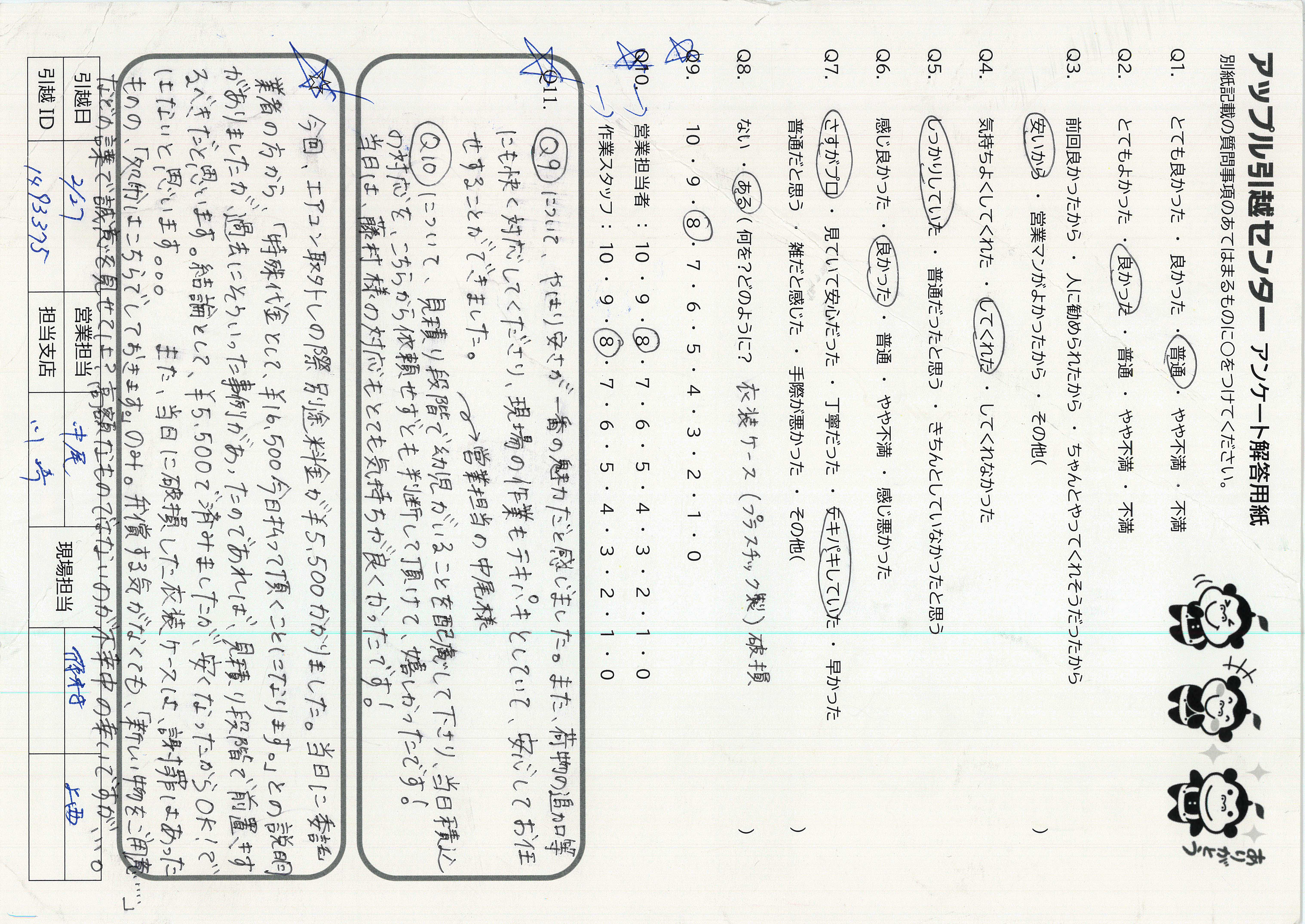 A.この度はありがとうございました。 街で見かけたアップルゴリラのキャラクターが可愛く、検索したのがきっかけでした。 サービスも充実しており、とても快適に引越しができました。 ただ、2点気になったことがあります。 一つは、テレビ機器類の梱包の際にコードが絡まったまま、機器も斜めの状態でダンボールに入れられたのが不安でした。 こちらで梱包することが前提だったため、サービスして頂いたことは大変ありがたく思います。回線を整えてくださいなど一言欲しかったところです、、 もう一つは、洗濯機ホースの排水側について詳しくご説明頂けたのですが、洗濯機側のホース付け根が緩んでいたようで、その後使用した際に水が漏れてしまいました。 引越しの際に外したのかは不明ですが、そこもご確認いただきたかったです。 ご担当の方には梱包サポートや、細かな気遣いを多くして頂き、とても好印象でしたので、2点については少し気になった程度です! その他大きな問題などなくとても快適でした。 ありがとうございました。