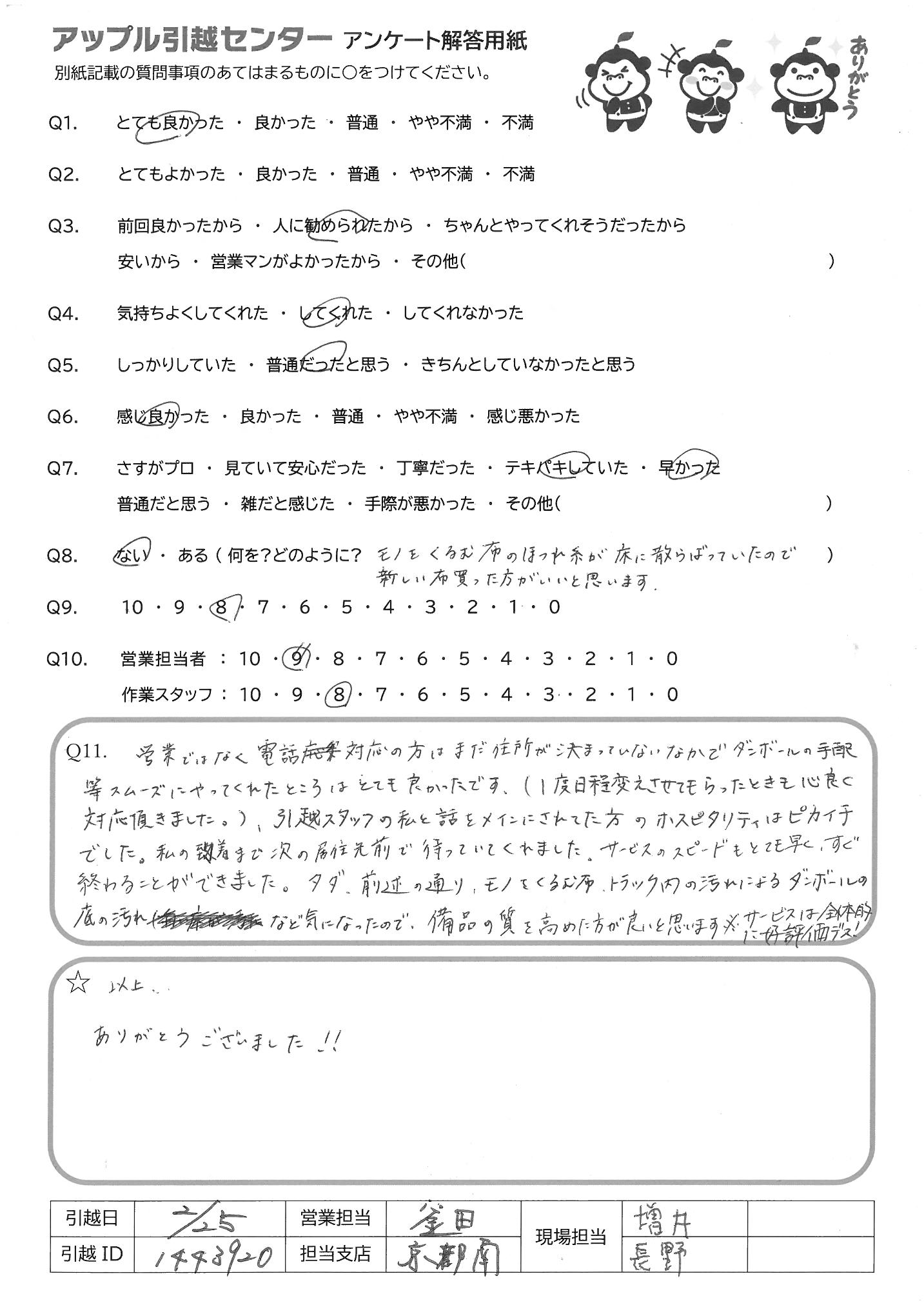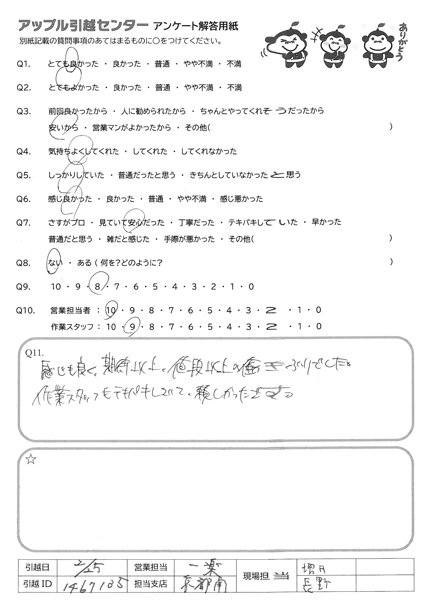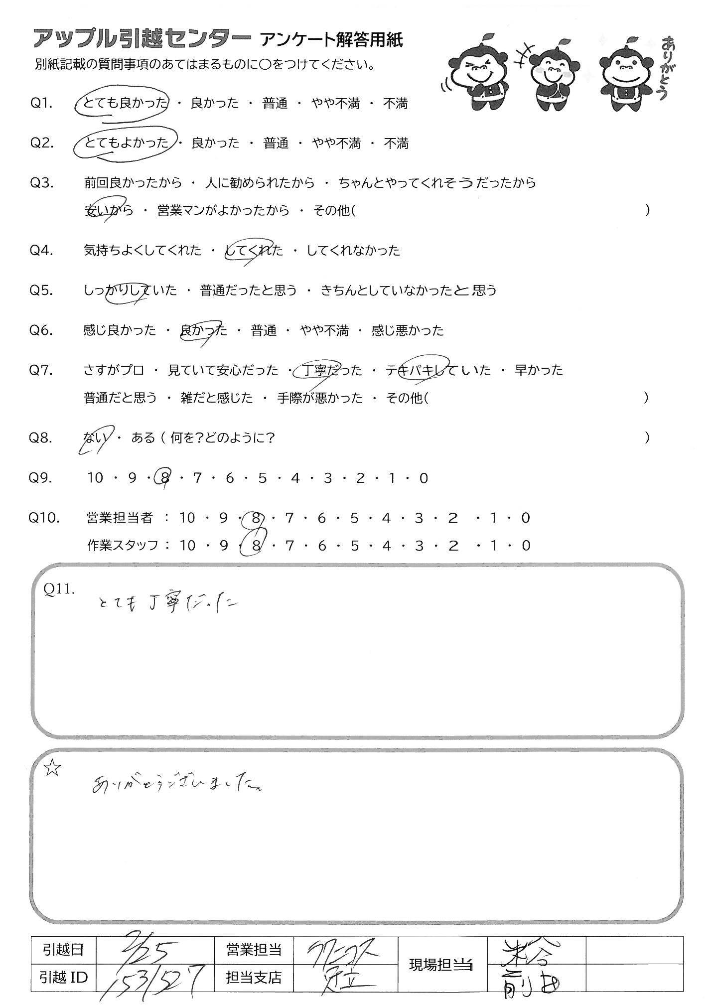 A.今回は手際の良い作業とご対応ありがとうございました。引越し時間も早い時間のご案内をして頂くなど色々行って頂き非常に助かりました。 また機会がありましたらよろしくお願い致します。