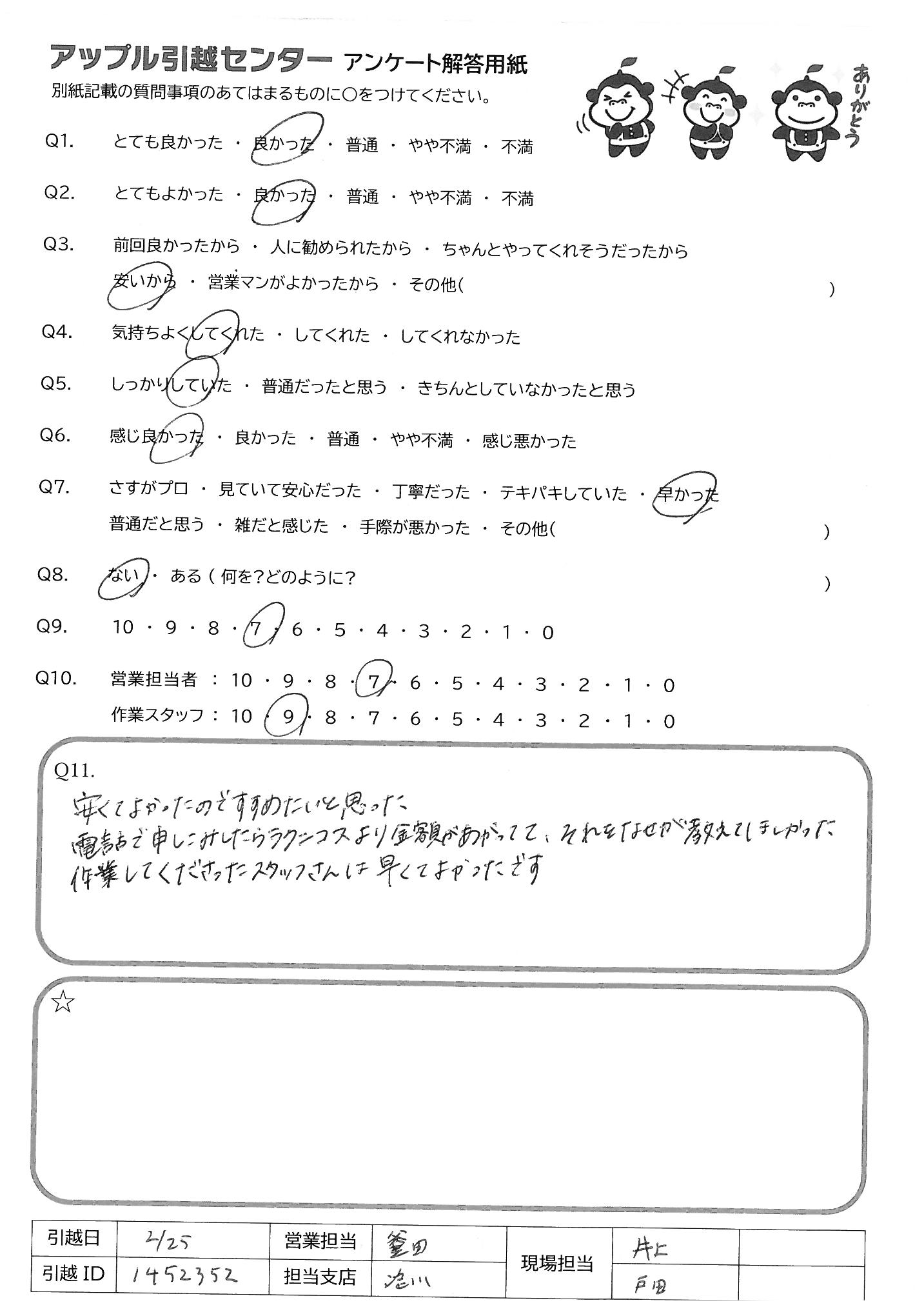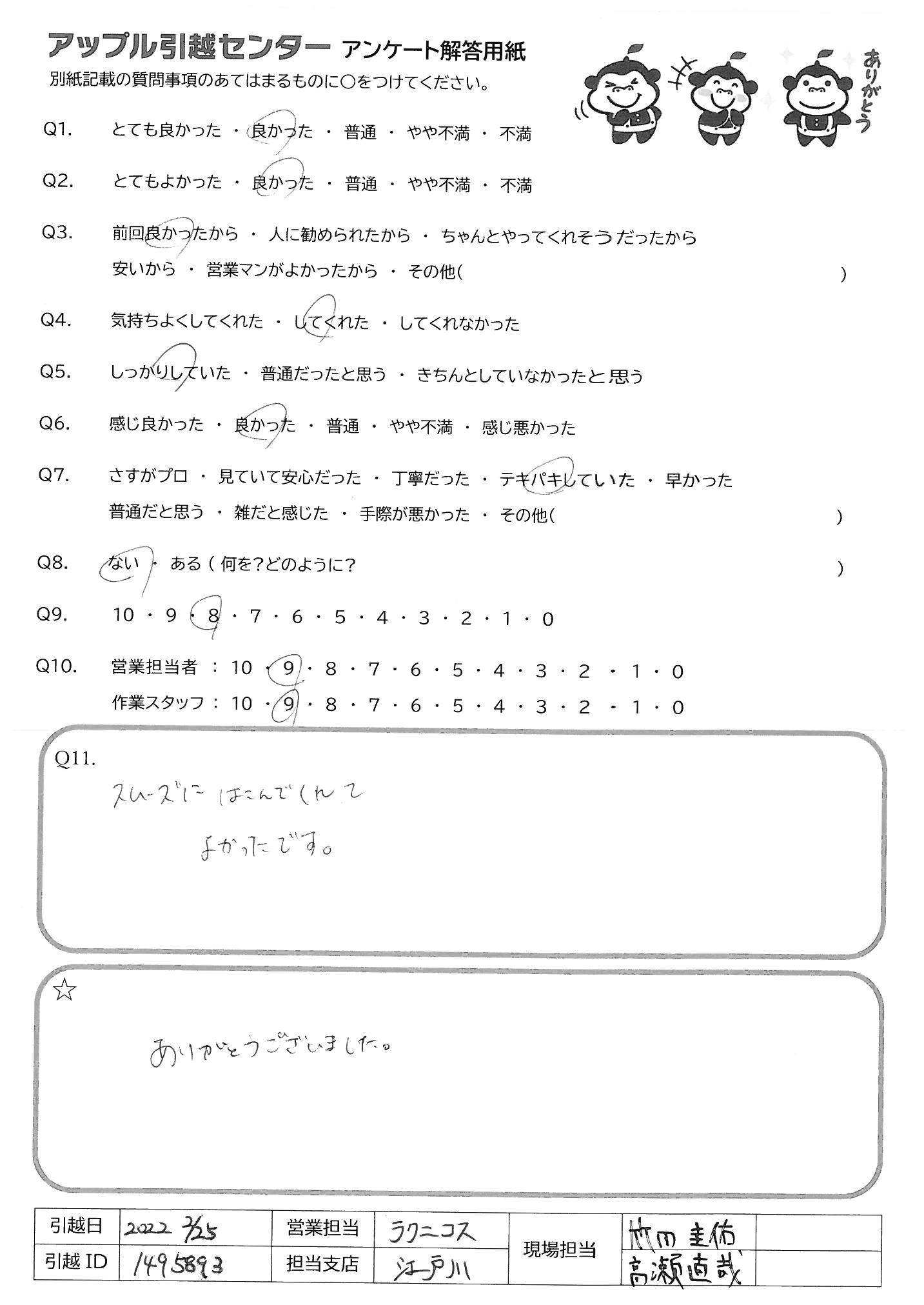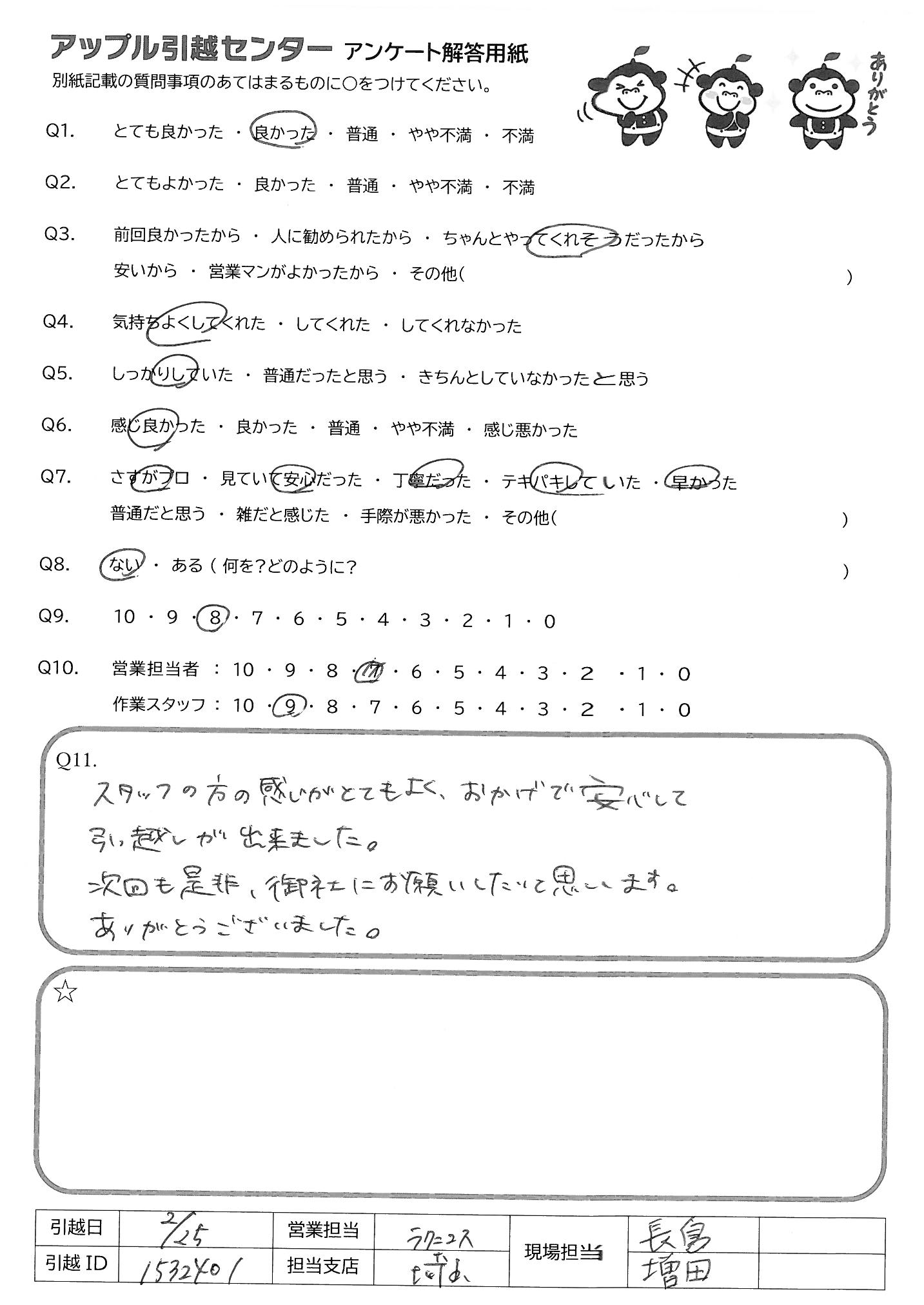 A.今回は手際の良い作業とご対応ありがとうございました。引越し時間も早い時間のご案内をして頂くなど色々行って頂き非常に助かりました。 また機会がありましたらよろしくお願い致します。