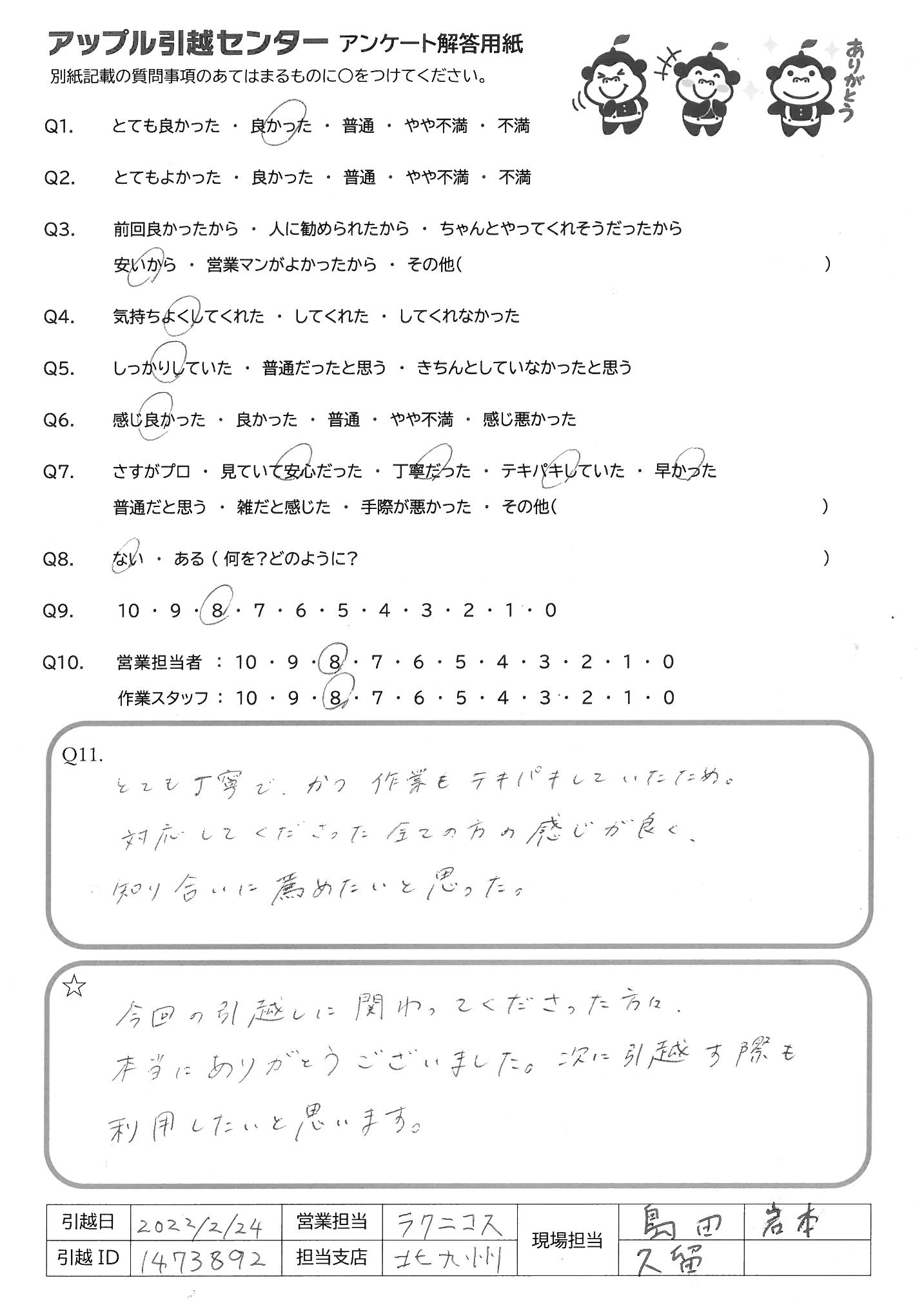 引越し日:2022年02月24日 エリア:福岡県北九州市小倉北区