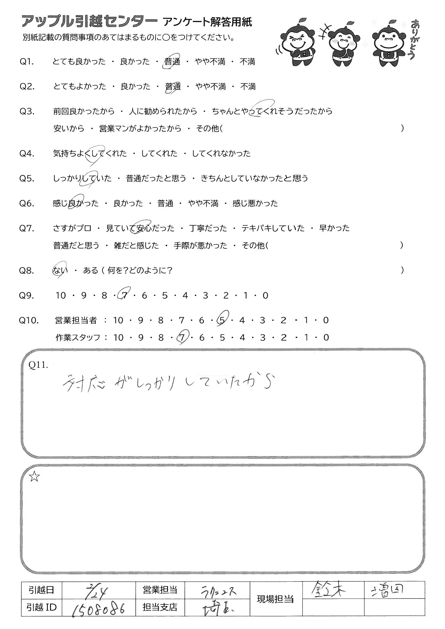 A.他者と比較してもとても安いお値段で、様々なことをお願いしても対応してくださり、本当にありがたかったです。 ただ、今回の引っ越しではもともといらっしゃる予定だった地区の方々が忙しく、別の部署からスタッフさんを派遣してくださいました。その中で、もともと伝えていた内容が共有されていないなと感じることがいくつかありました。当日担当してくださったスタッフさんが逐一お話を聞いて対応してくださったので、困った事態にはなりませんでしたが、 プラスαで伝えていた内容などは引き継いで頂けるとありがたいと感じました。 お世話になりました。本当にありがとうございました。