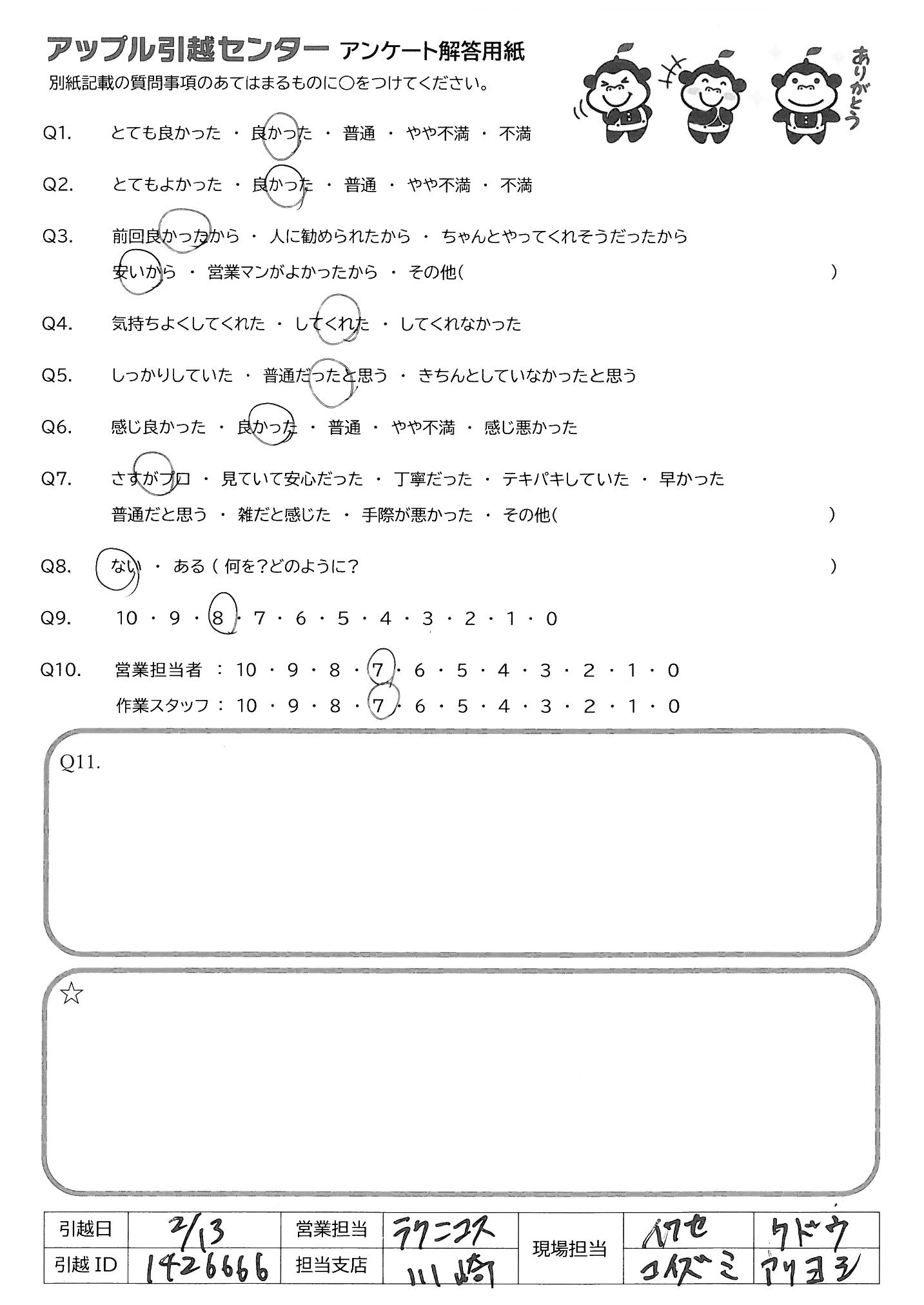 A.今回2度目の利用でしたが、次引っ越しをする際もお願いしたいと思うくらい、丁寧で早くて助かっています。ありがとうございました!