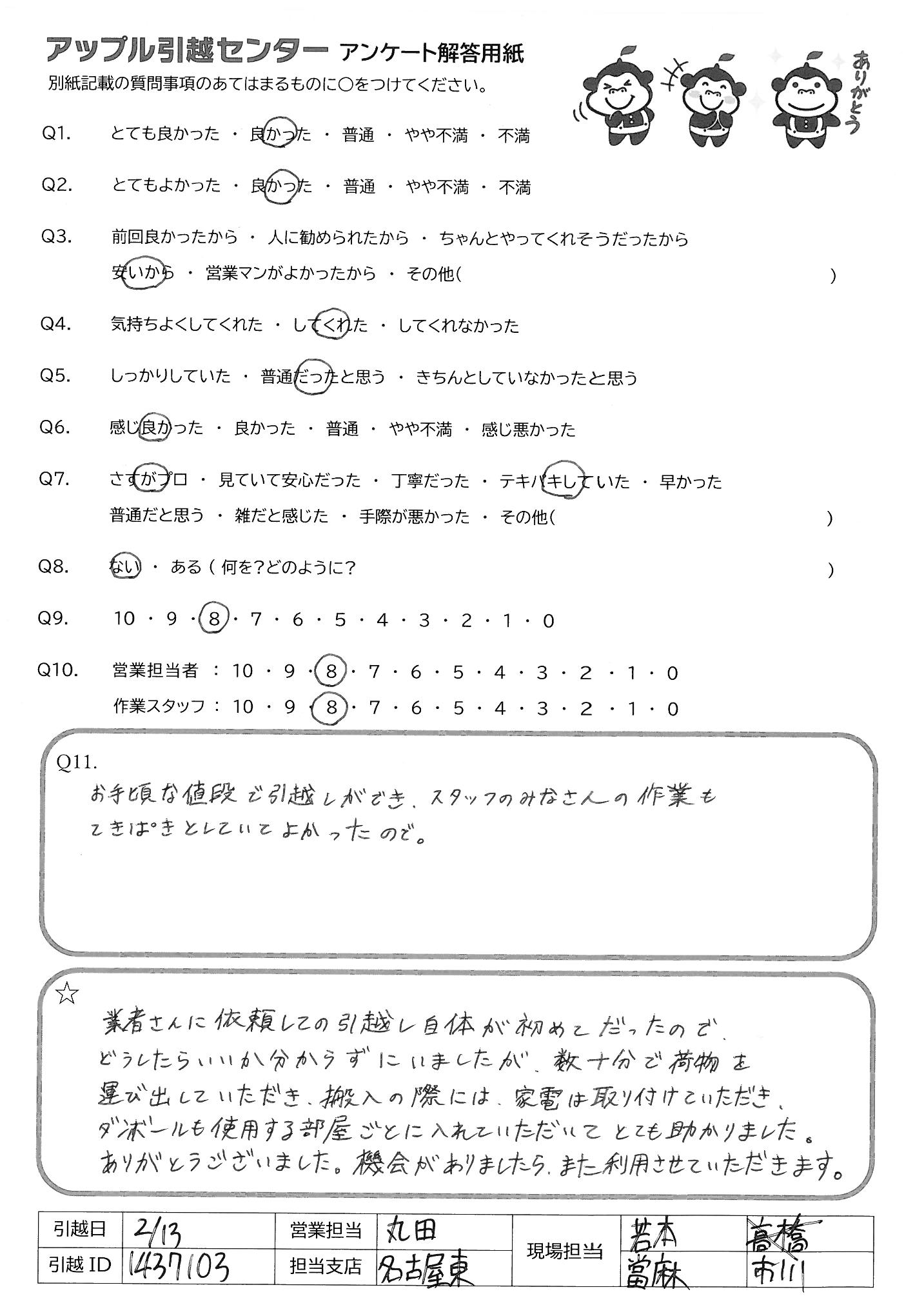 引越し日:2022年02月13日 エリア:愛知県名古屋市千種区