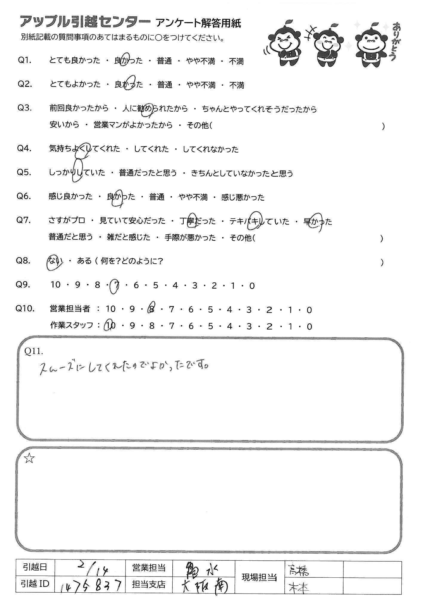 引越し日:2022年02月14日 エリア:大阪府大阪市鶴見区