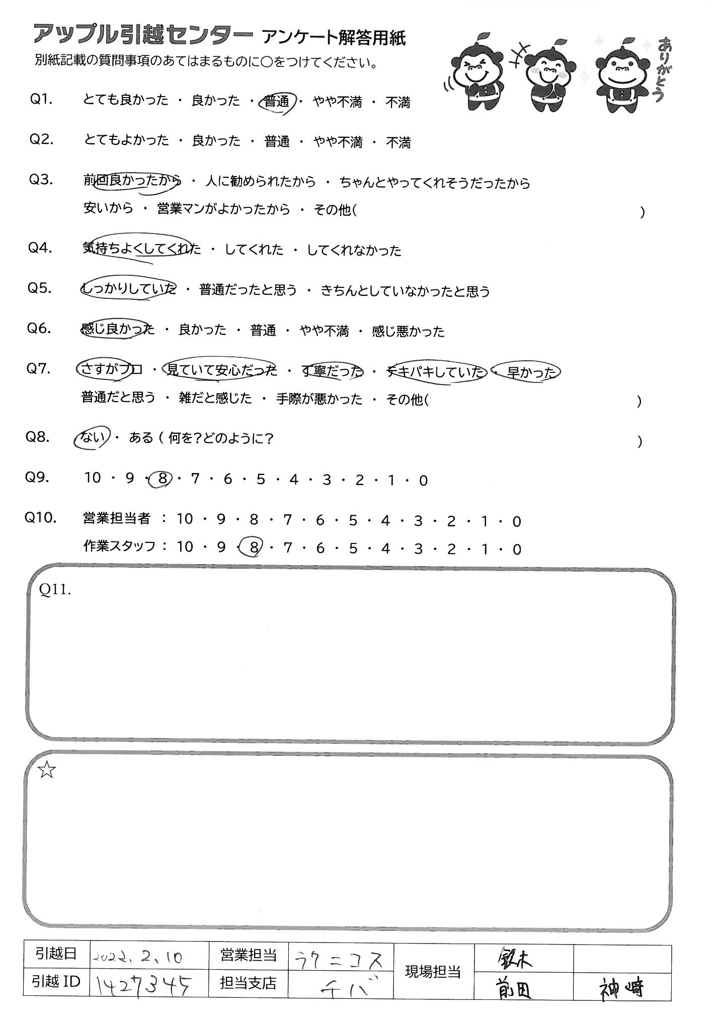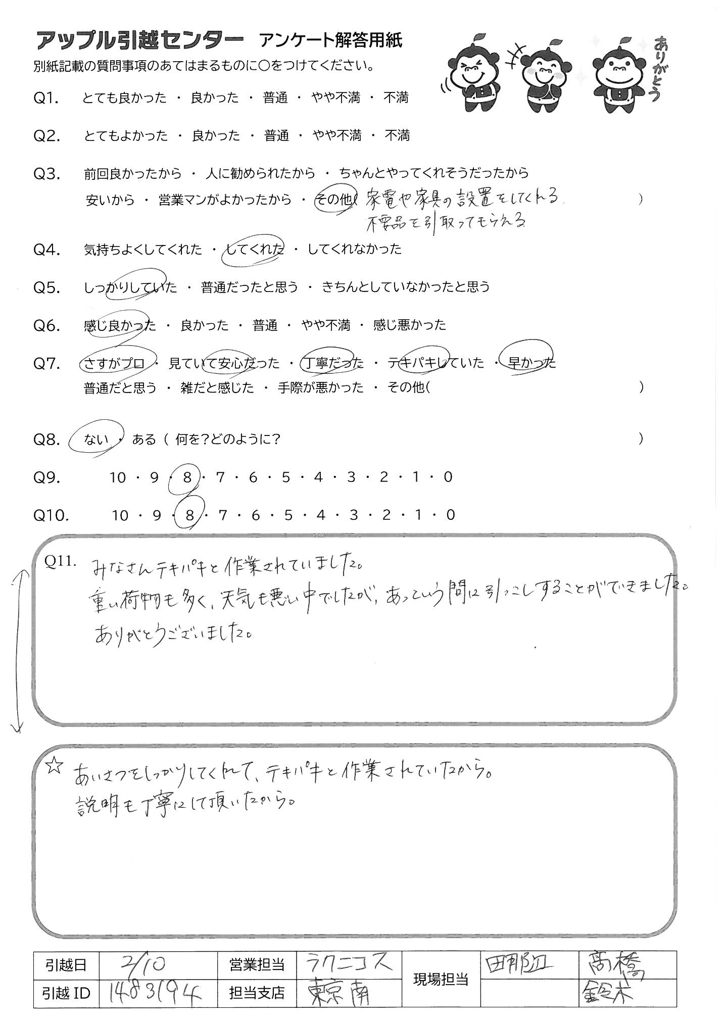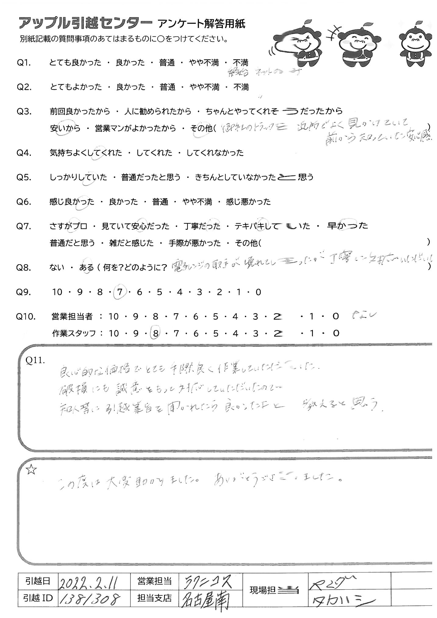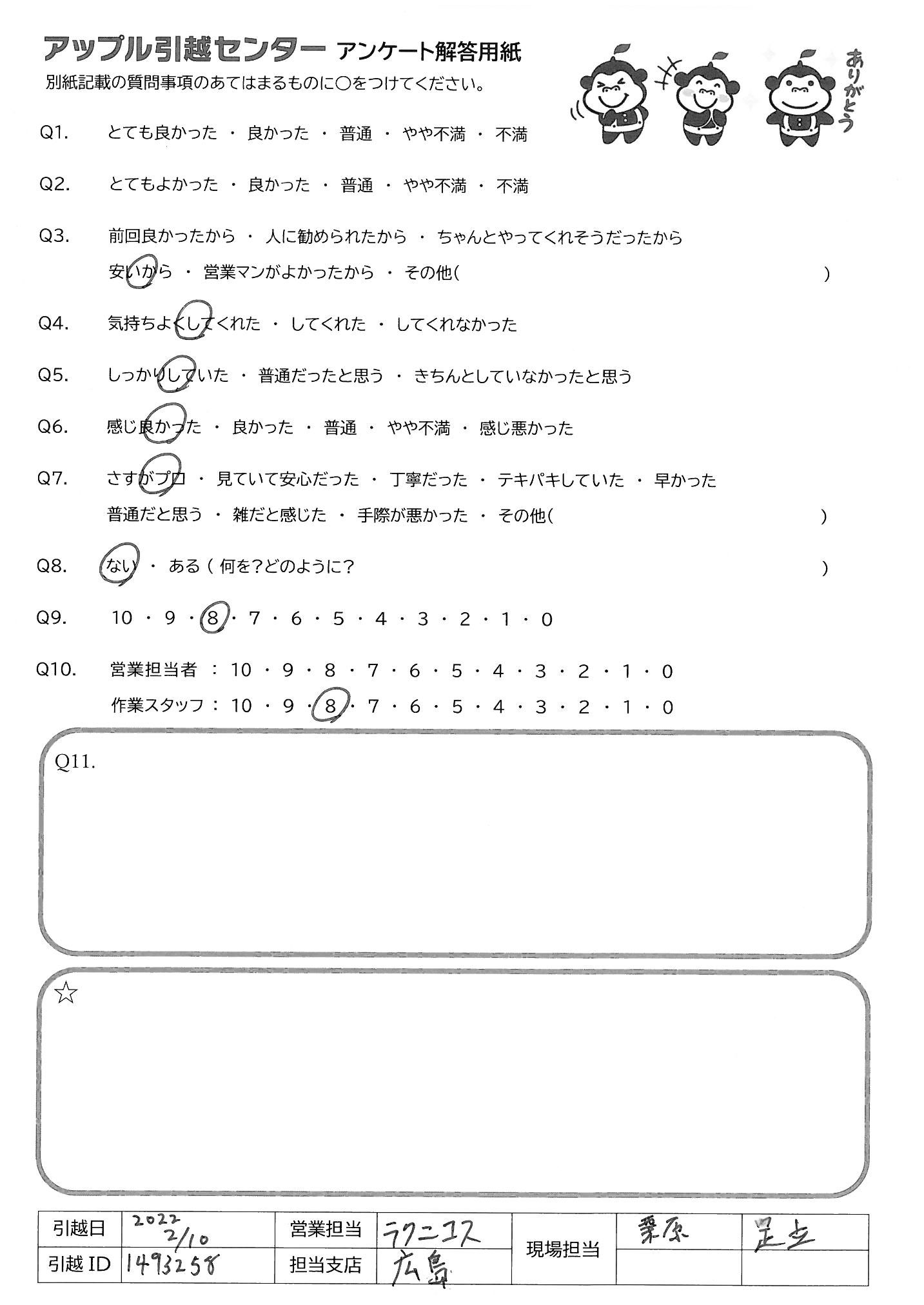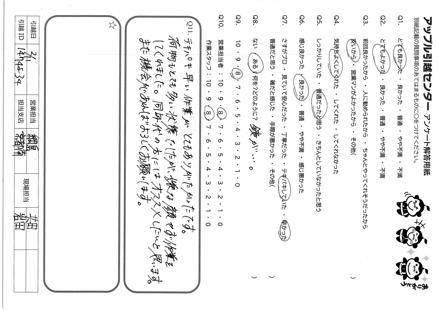 A.テキパキ早い作業がとてもありがたかったです 荷物もとても多い状態でしたが、嫌な顔せず、作業を してくれました。同年代の方にはオススメしたいと思います また機会があればよろしくお願します。