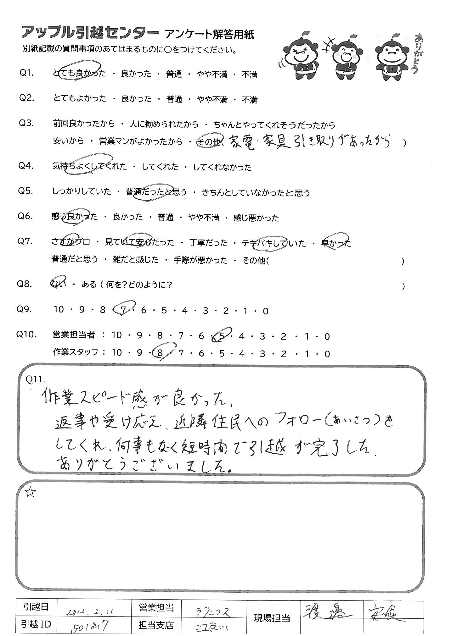 A.作業スピード感が良かった 返事や受応え、近郊住民へのフォロー(あいさつ)を してくれ、何事もなく短時間で引越が完了した ありがとうございました