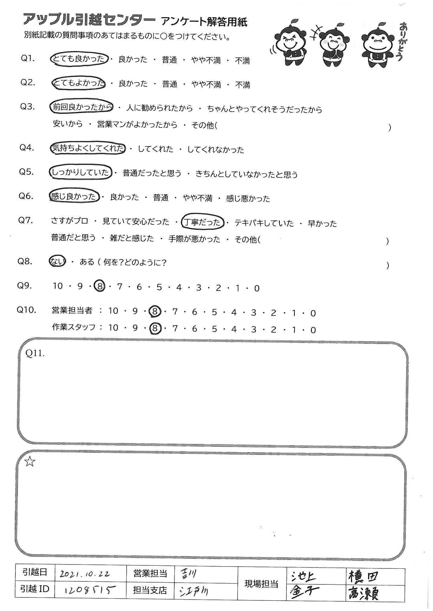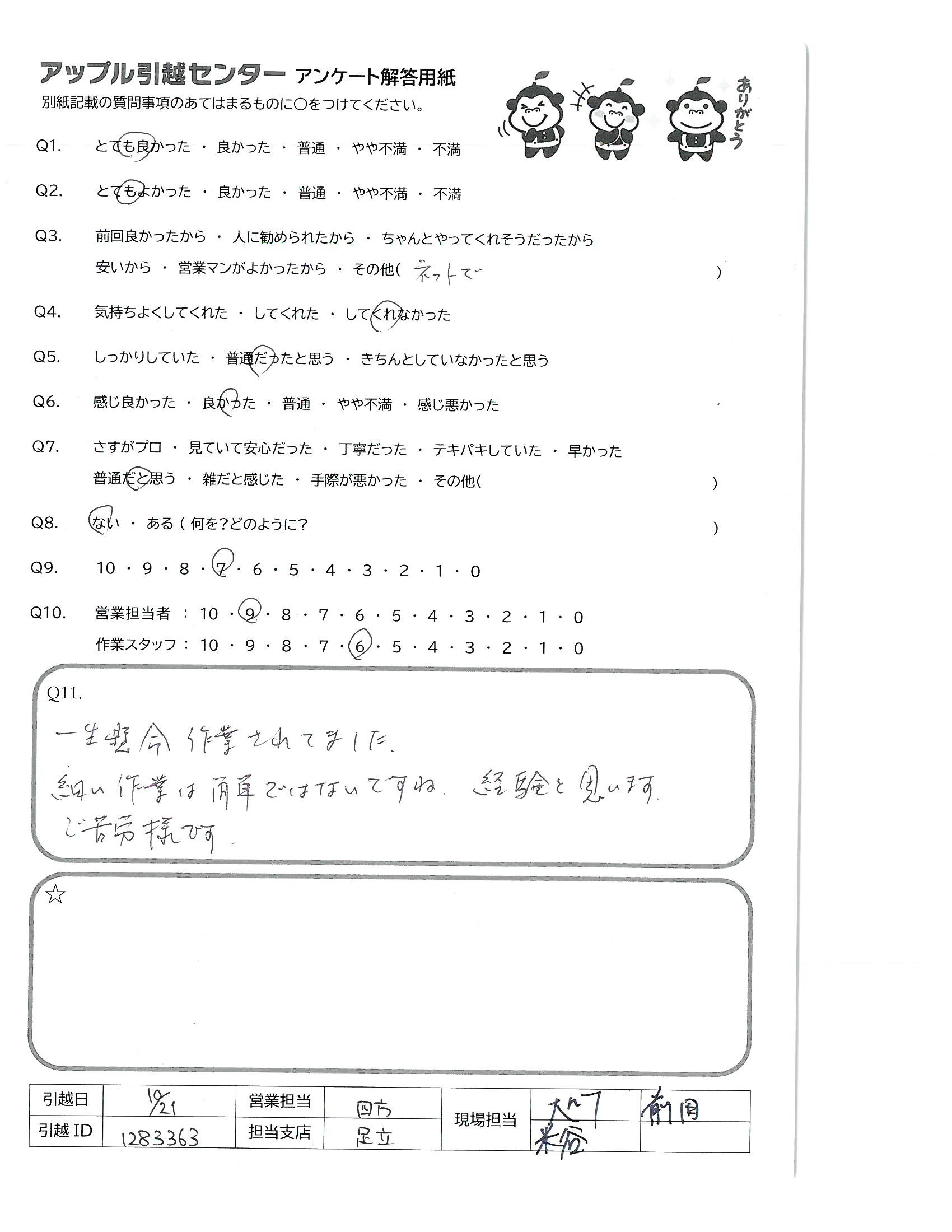 A.Q9:安いし、作業がスピーディーだったから Q10:営業の人とは話していないので。メールの返信も普通でした。作業スタッフの方は、仲が良さそうで話した感じもとてもよかったです。何か手伝う事ありますか?と声をかけてもらえてありがたかった!(1人の引越しだったので)
