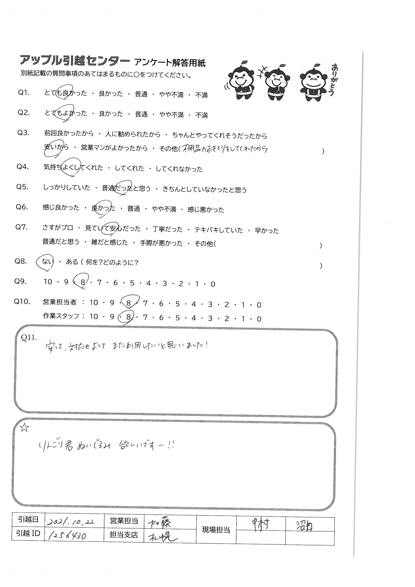 引越し日:2021年10月22日 エリア:北海道札幌市中央区