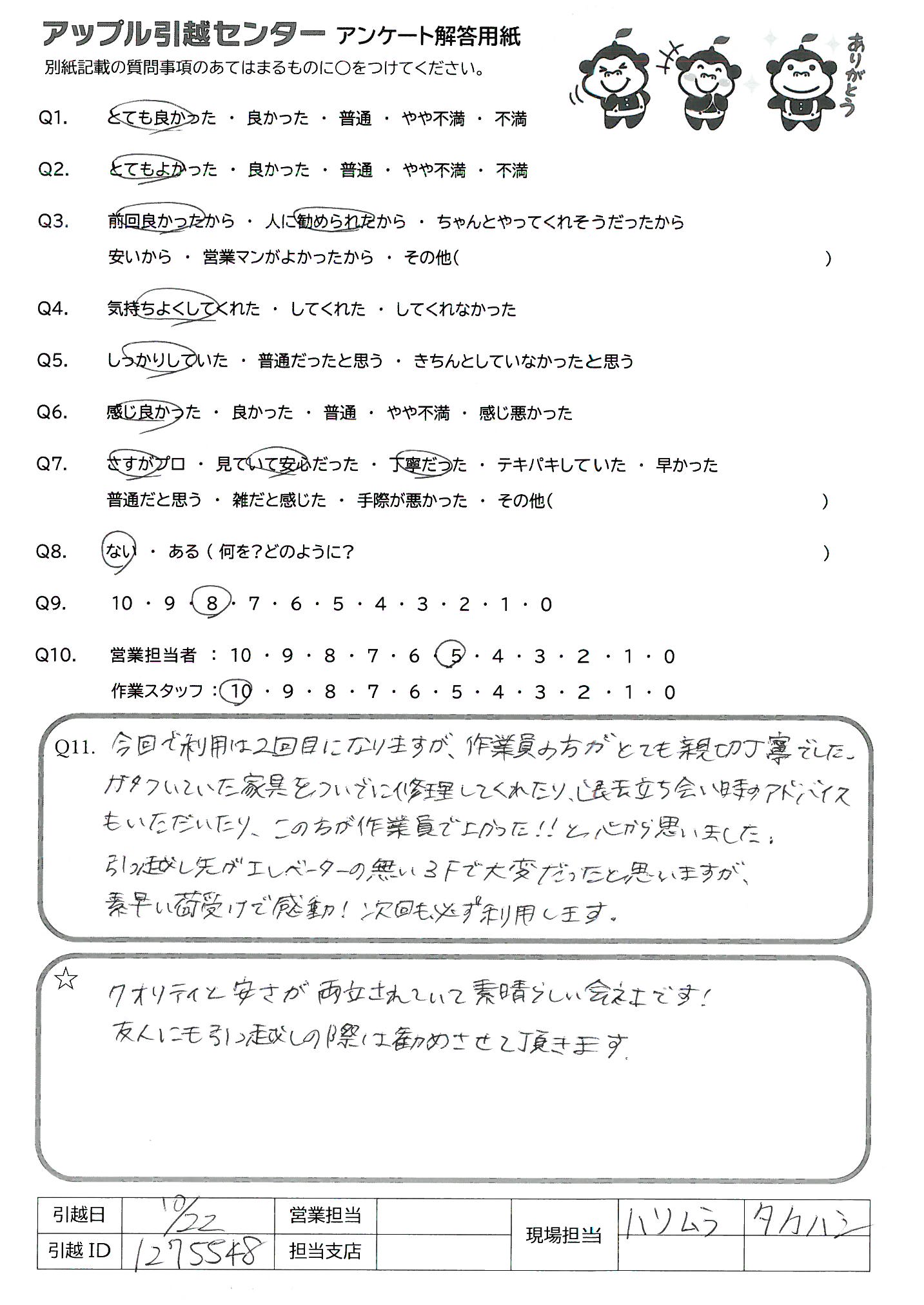 A.作業スタッフの方はとてもテキパキしており、挨拶も含めコミュニケーションも好印象だったから、知り合いにも勧めたいと思います。 次回、引っ越しする際もお願いしたいと思います。