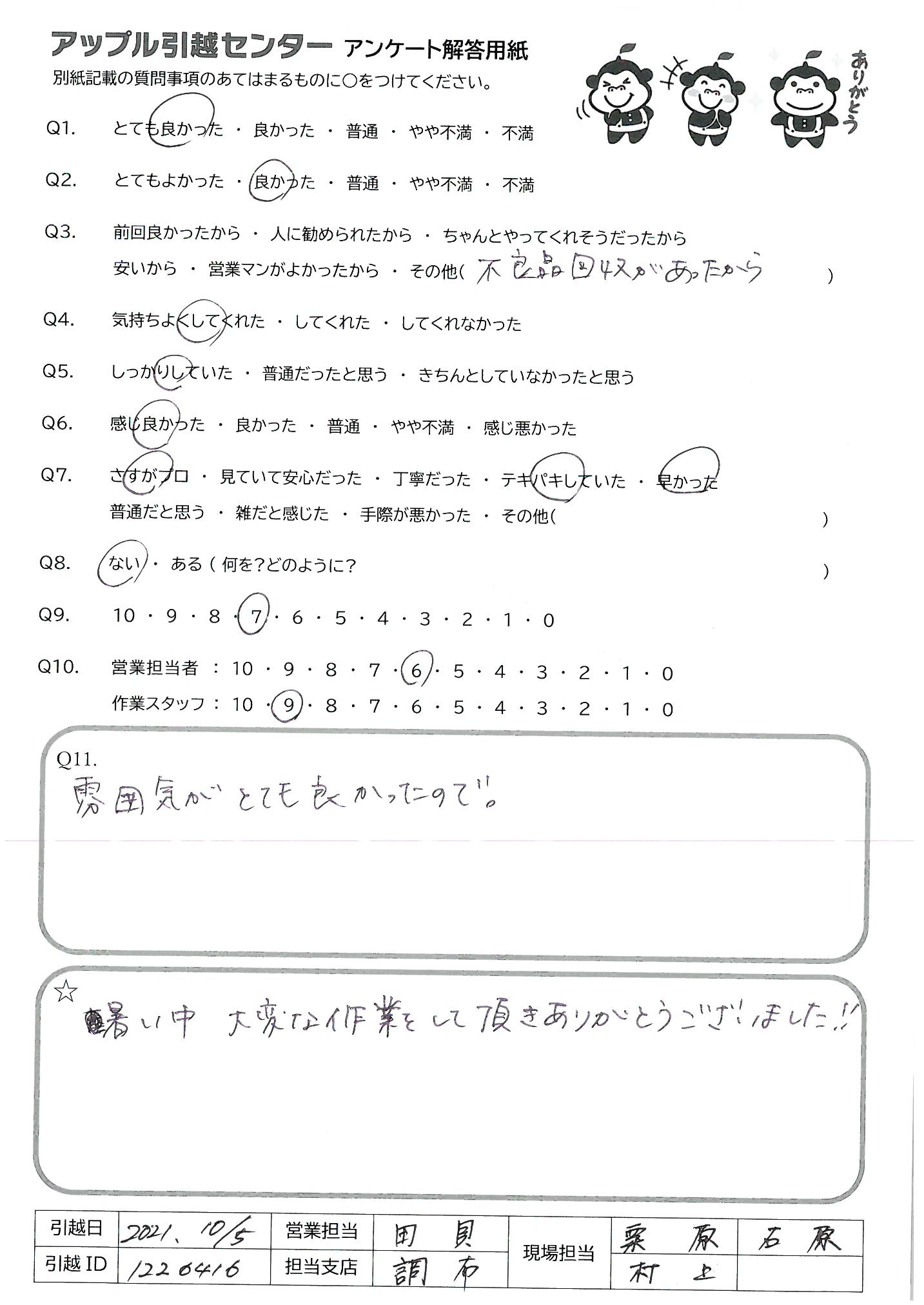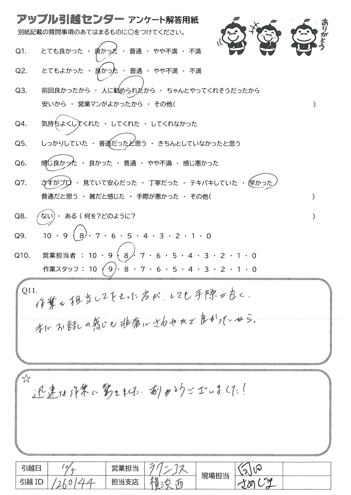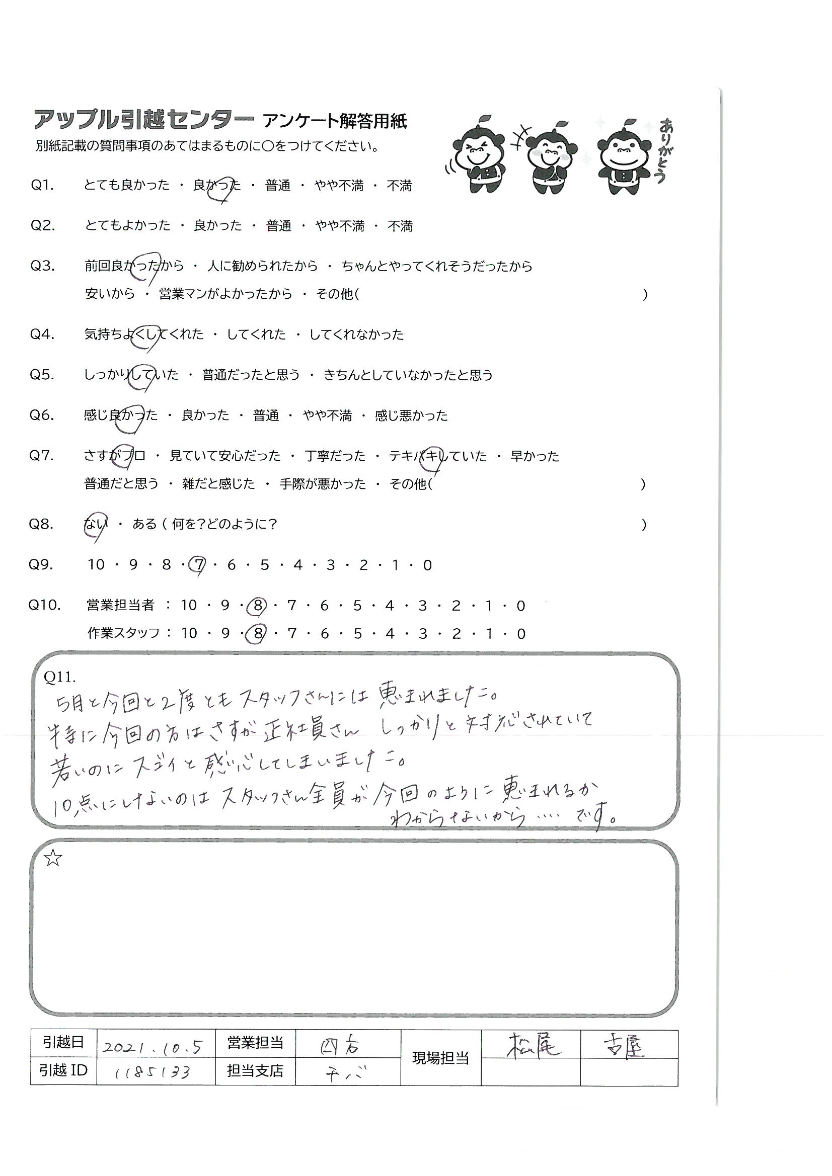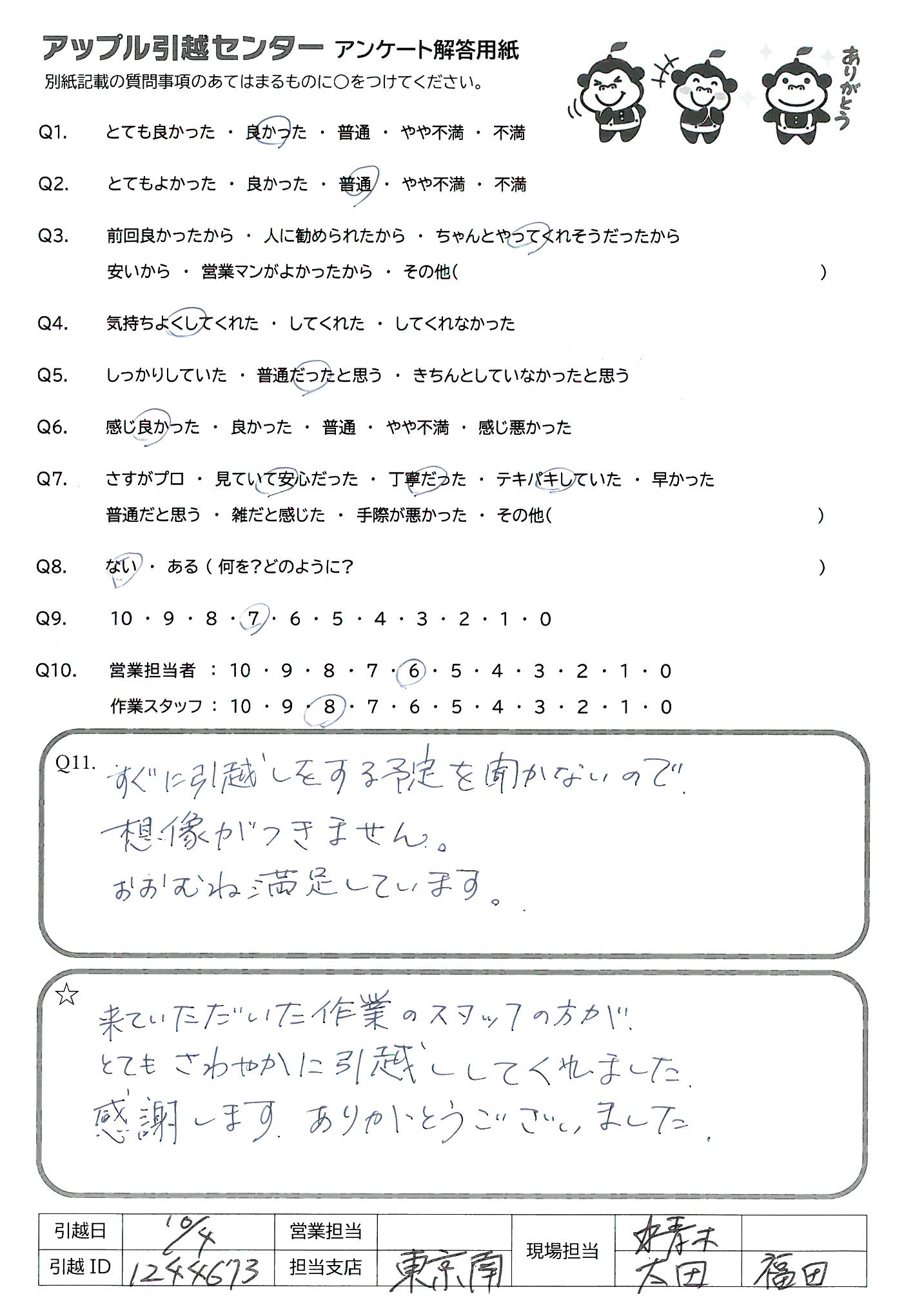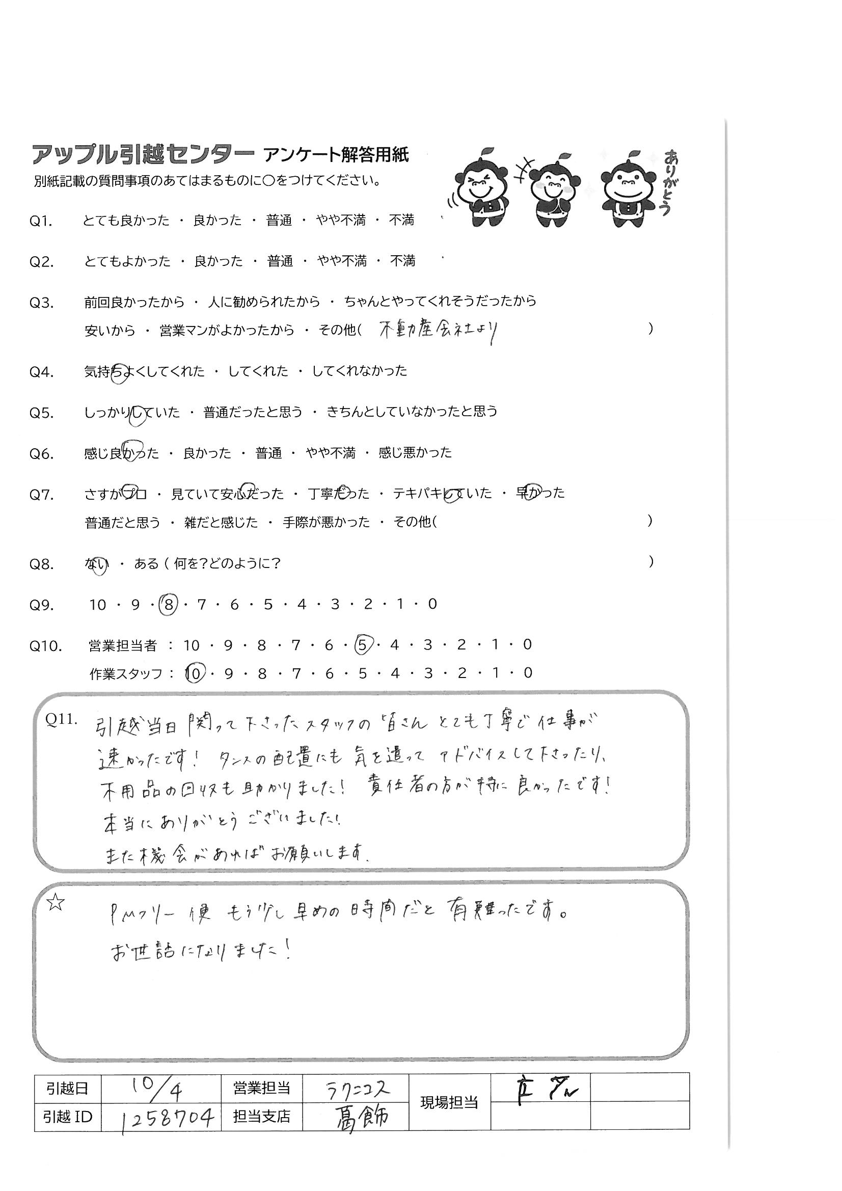 A.引越当日関って下さったスタッフの皆さんとても丁寧で仕事が速かったです!タンスの配置にも気を遣ってアドバイスして下さったり、不用品の回収も助かりました!責任者の方が特に良かったです! 本当にありがとうございました!また機会があればお願いします。