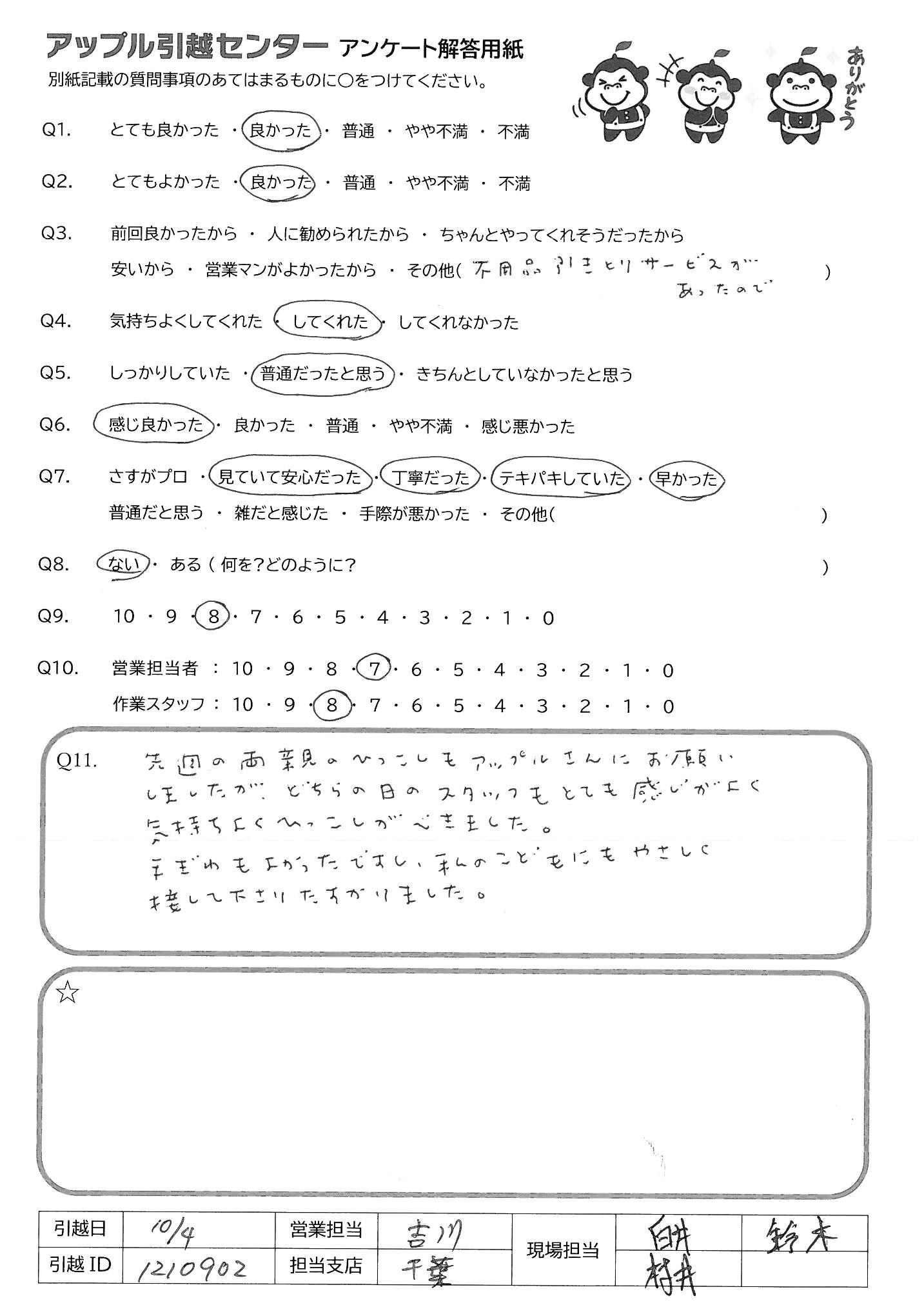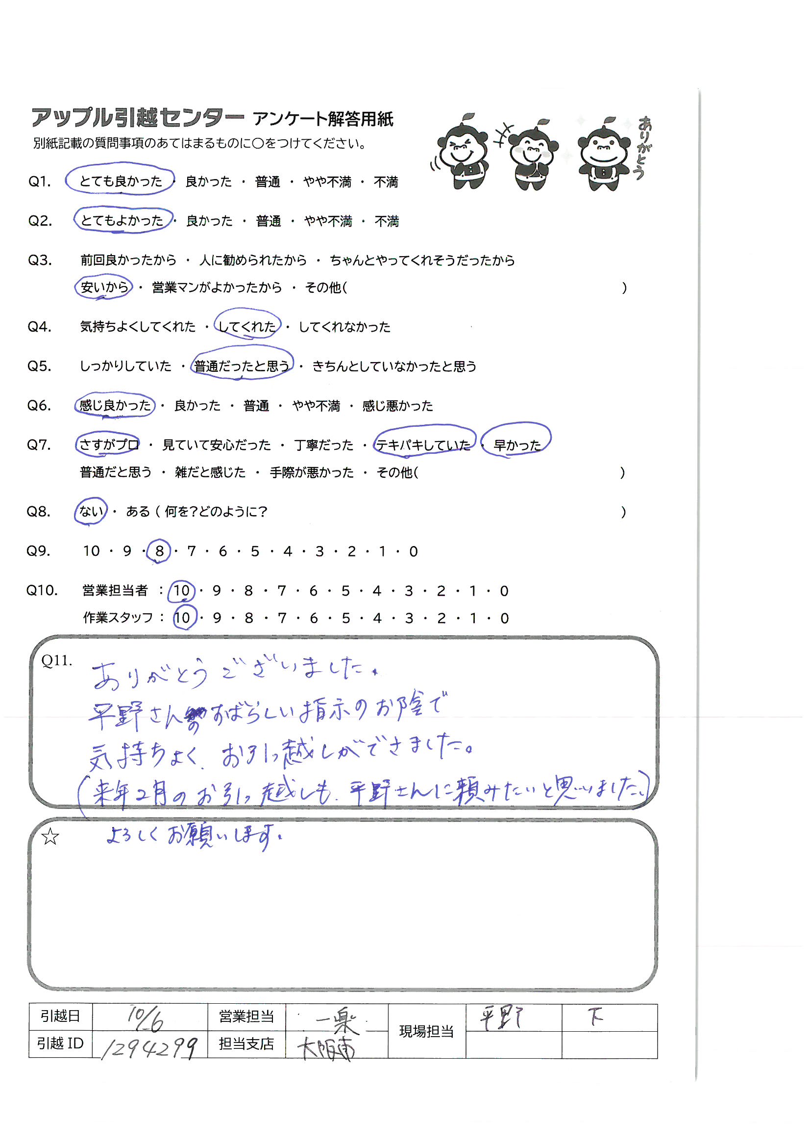 A.ありがとうございました。 平野さんのすばらしい指示のお陰で気持ちよく、お引っ越しができました。 (来年2月のお引っ越しも、平野さんに頼みたいとおもいました。)