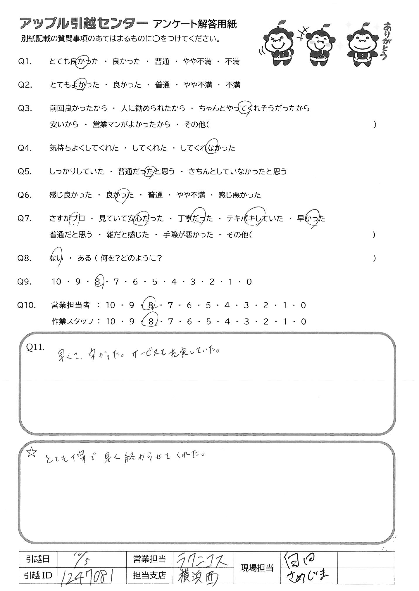A.来ていただいた作業のスタッフの方が、とてもさわやかに引越ししてくれました。 感謝します。ありがとうございました。
