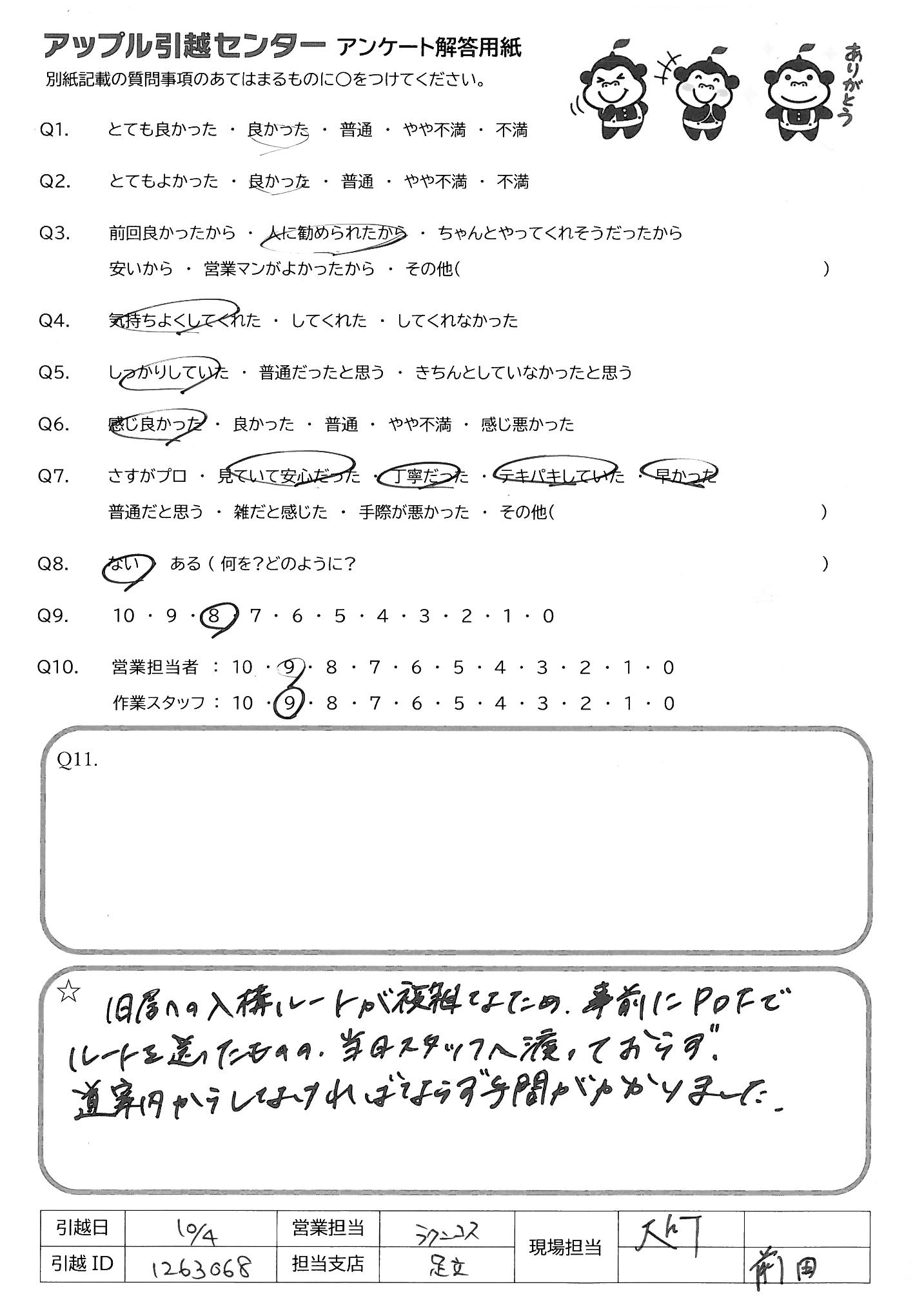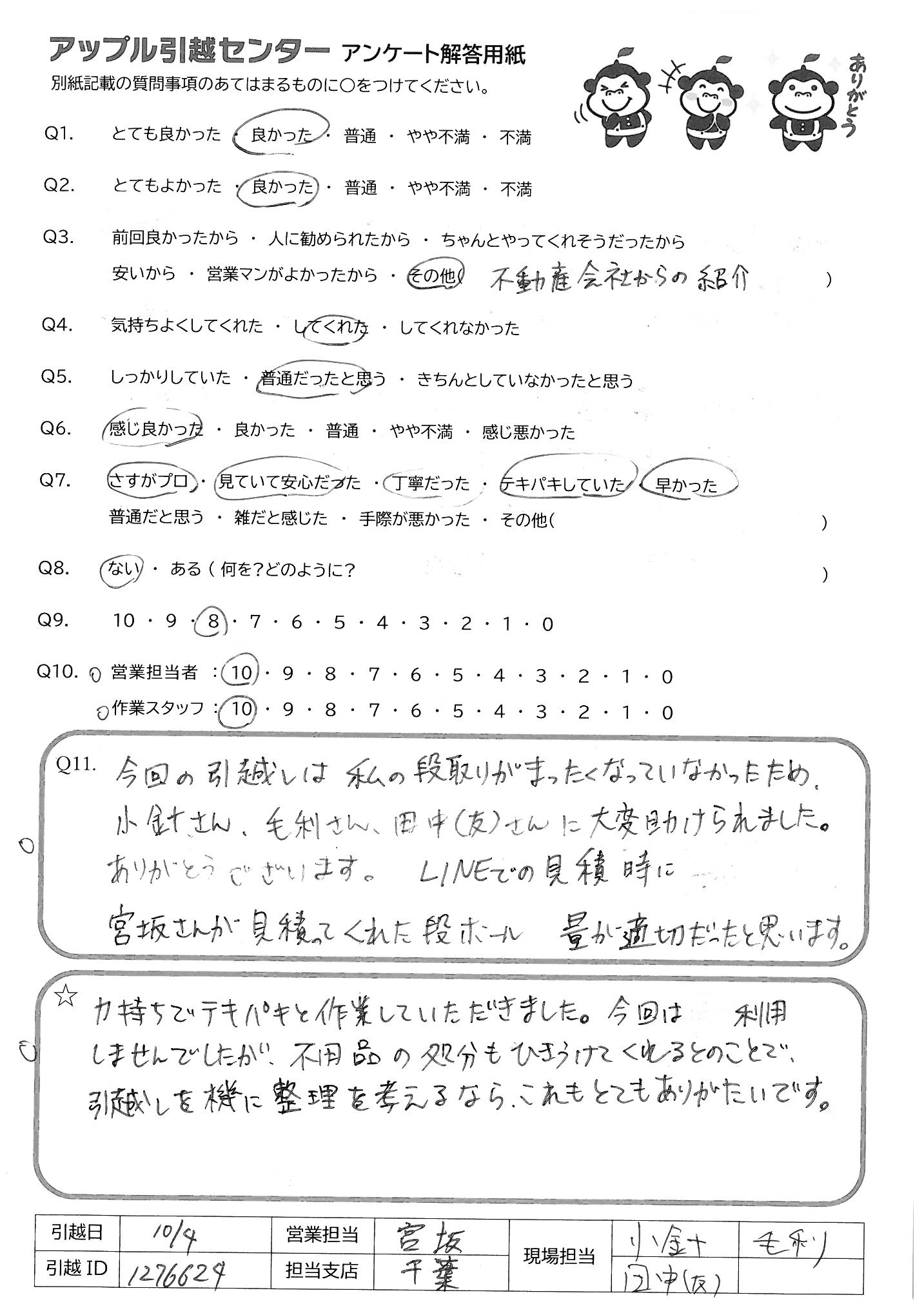 A.今回の引越しは私の段取りがまったくなっていなかったため、 小針さん、毛利さん、田中(友)さんに大変助けられました。 ありがとうございます。LINEでの見積時に宮坂さんが見積ってくれた段ボール量が適切だったと思います。