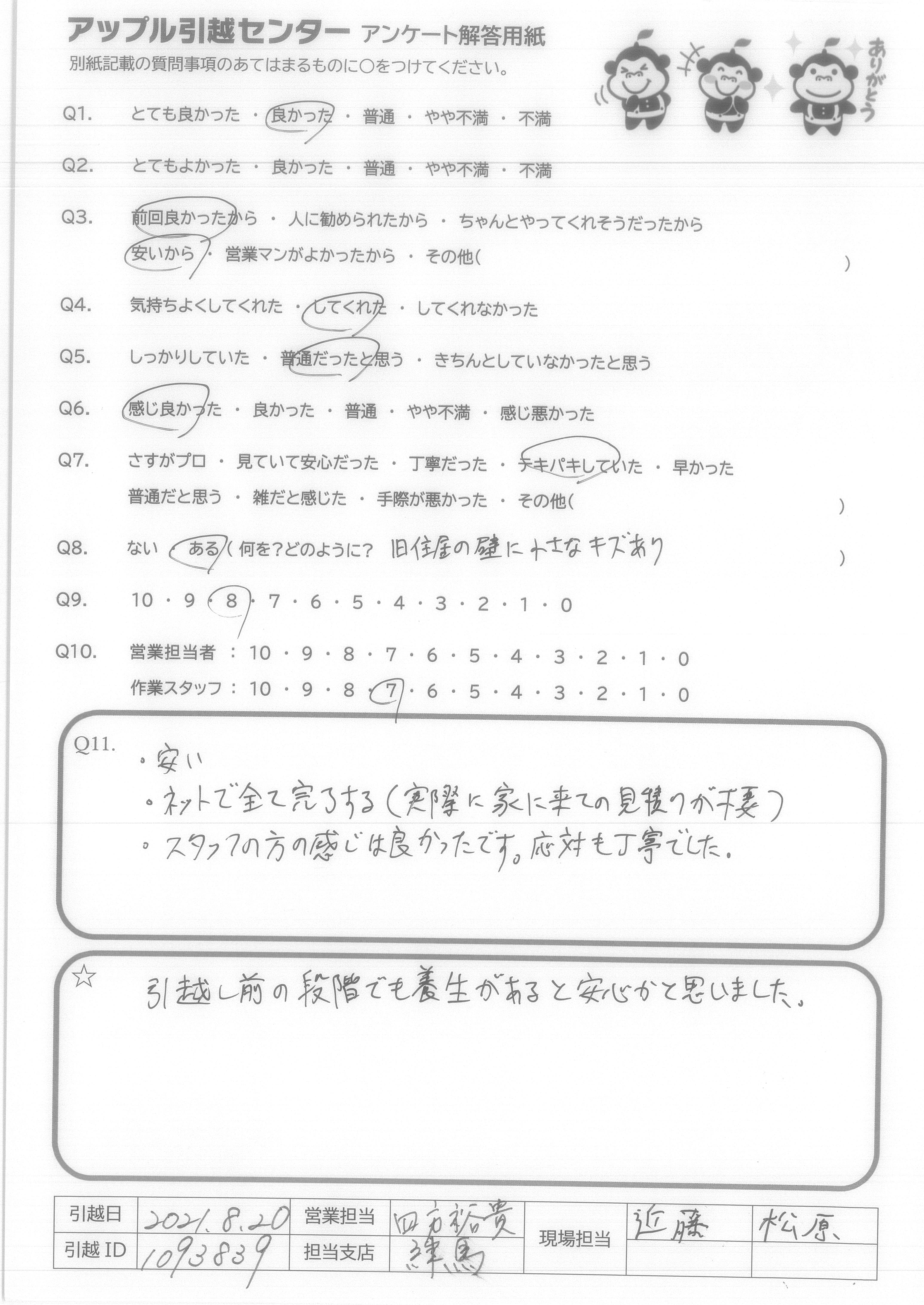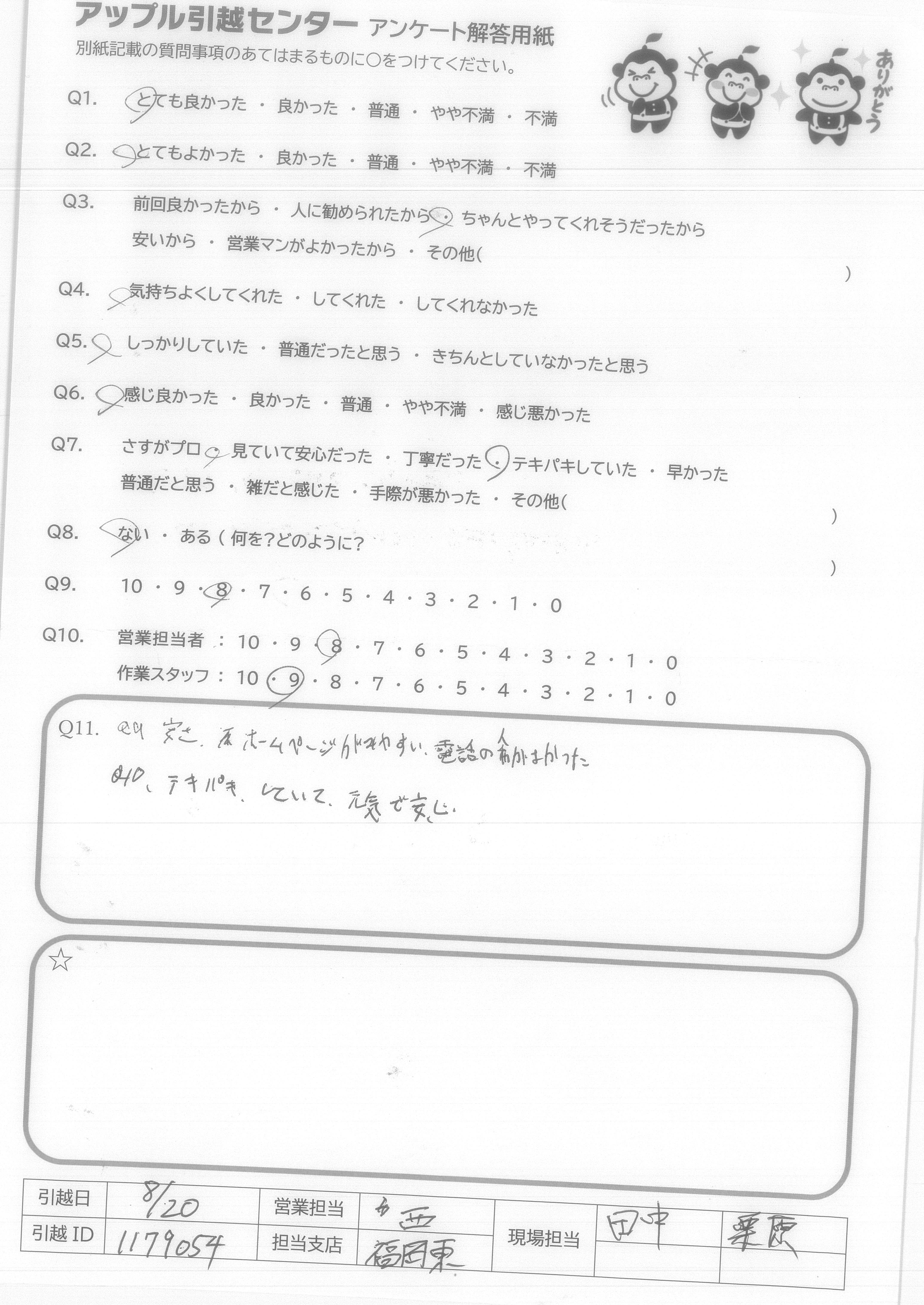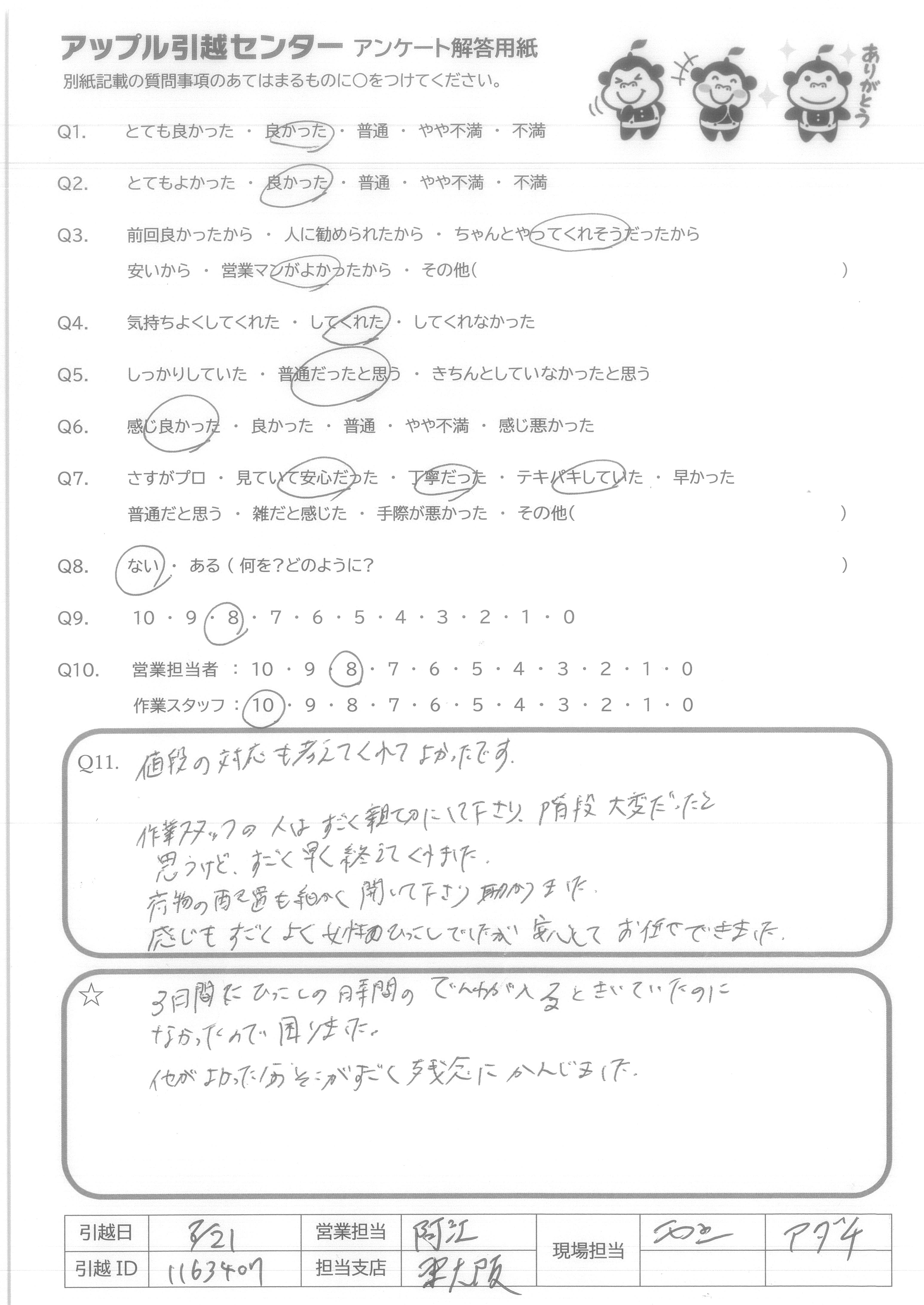 A.営業のご担当者は、どの方が担当者かがわからなかったので、中間点。 作業スタッフは、基本的に問題なし。外国人の方も含めてマナーも全く問題なし。 梱包運送も問題なし。減点分は、①洗濯機の排水ホースからの汚れ処理で床が汚れてしまったがすぐやりますとおっしゃって頂きましたが、結局残ってしまったことと、新居側の扉を養生で開いて固定した際に金具が外れてしまっていただのですが、最後そのまま残ってしまったこと。帰られた後の確認で判明したので、作業スタッフの方への指摘は行っておりません②旧居前の通りが狭いのですが、もう少し寄せていただくと、すれ違い上問題ないのですが、まだ余裕がある状態でしたので。結局宅配トラックとのすれ違いで車両を擦りながらとなっておりました。突っ込んできた宅配便側に非があるところかと思いますが、配慮は必要であったかと思います。 全体的には、非常に満足しています。 家族全体の引っ越し含めて回数はこなしておりますが、家族時だと7~8人来られると、その中に不安な方が含まれ、たいてい家具に傷をつけてしまう等々やらかしてしまうのですが、今回の3名にはそういった感じはなかったので、その意味では安心できました。