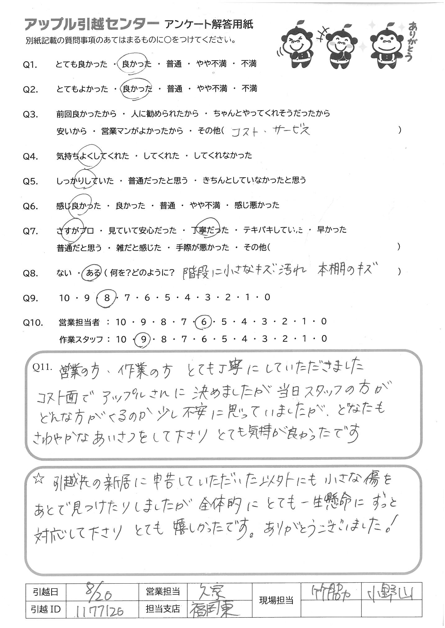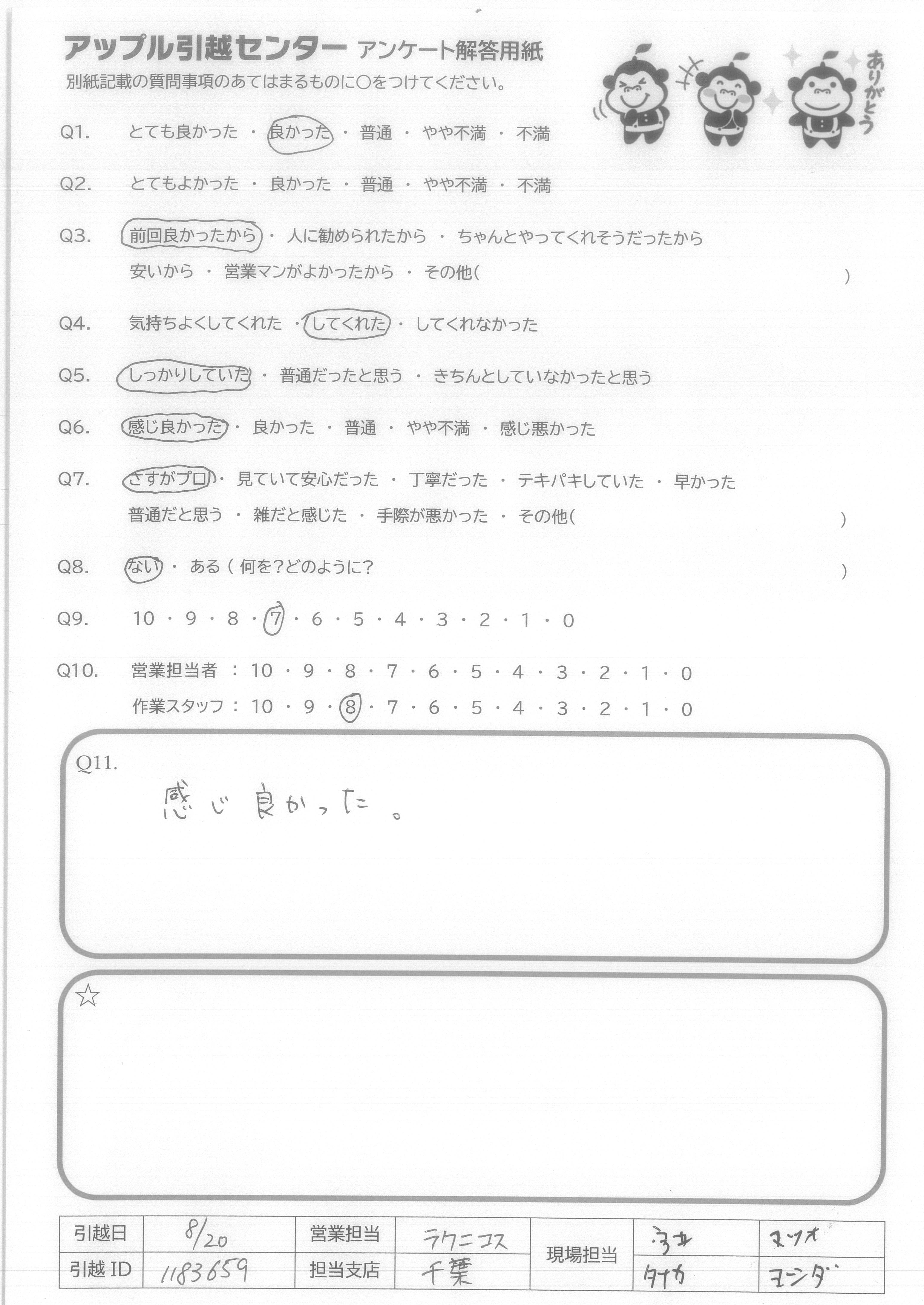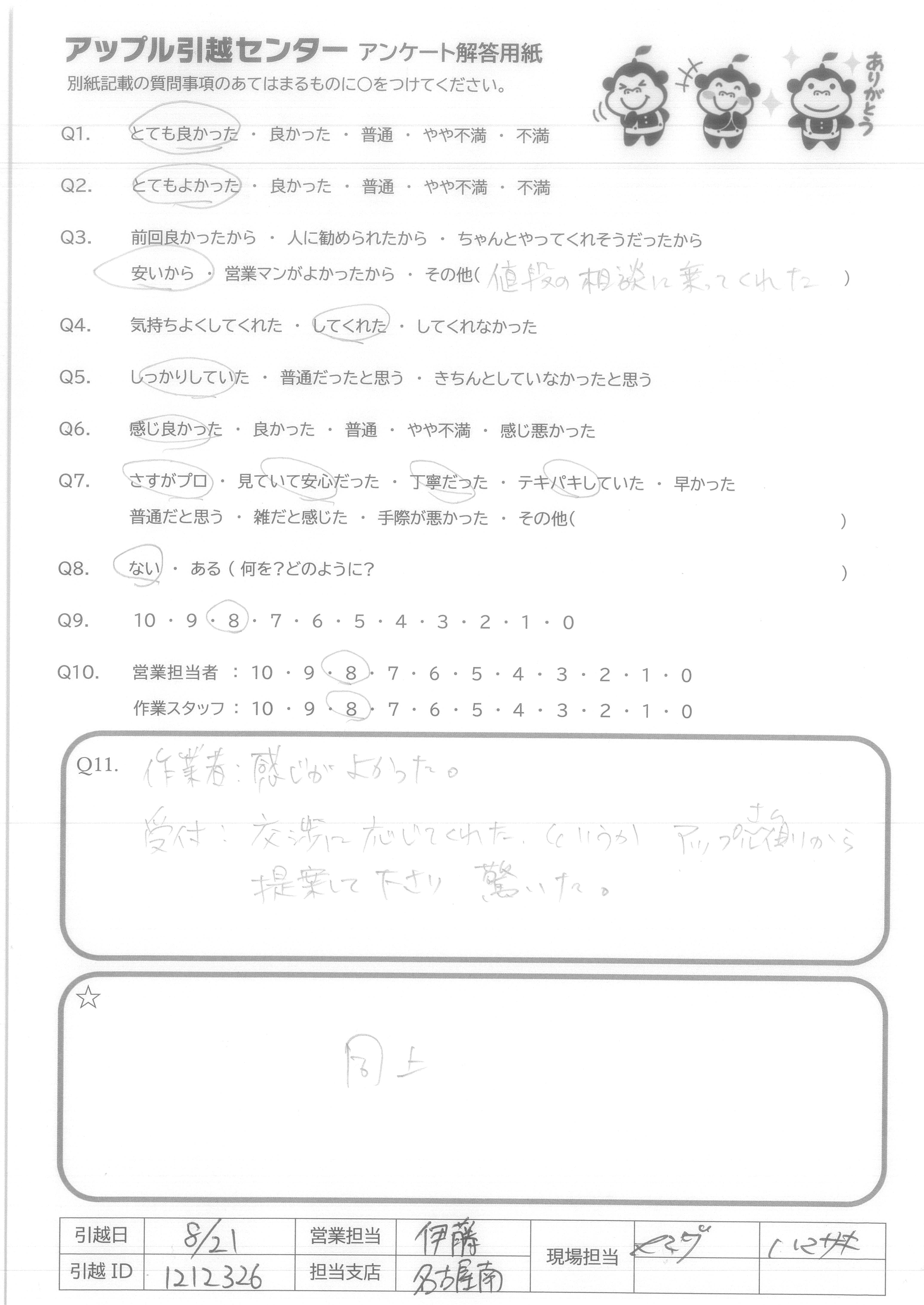 A.営業のご担当者は、どの方が担当者かがわからなかったので、中間点。 作業スタッフは、基本的に問題なし。外国人の方も含めてマナーも全く問題なし。 梱包運送も問題なし。減点分は、①洗濯機の排水ホースからの汚れ処理で床が汚れてしまったがすぐやりますとおっしゃって頂きましたが、結局残ってしまったことと、新居側の扉を養生で開いて固定した際に金具が外れてしまっていただのですが、最後そのまま残ってしまったこと。帰られた後の確認で判明したので、作業スタッフの方への指摘は行っておりません②旧居前の通りが狭いのですが、もう少し寄せていただくと、すれ違い上問題ないのですが、まだ余裕がある状態でしたので。結局宅配トラックとのすれ違いで車両を擦りながらとなっておりました。突っ込んできた宅配便側に非があるところかと思いますが、配慮は必要であったかと思います。 全体的には、非常に満足しています。 家族全体の引っ越し含めて回数はこなしておりますが、家族時だと7~8人来られると、その中に不安な方が含まれ、たいてい家具に傷をつけてしまう等々やらかしてしまうのですが、今回の3名にはそういった感じはなかったので、その意味では安心できました。