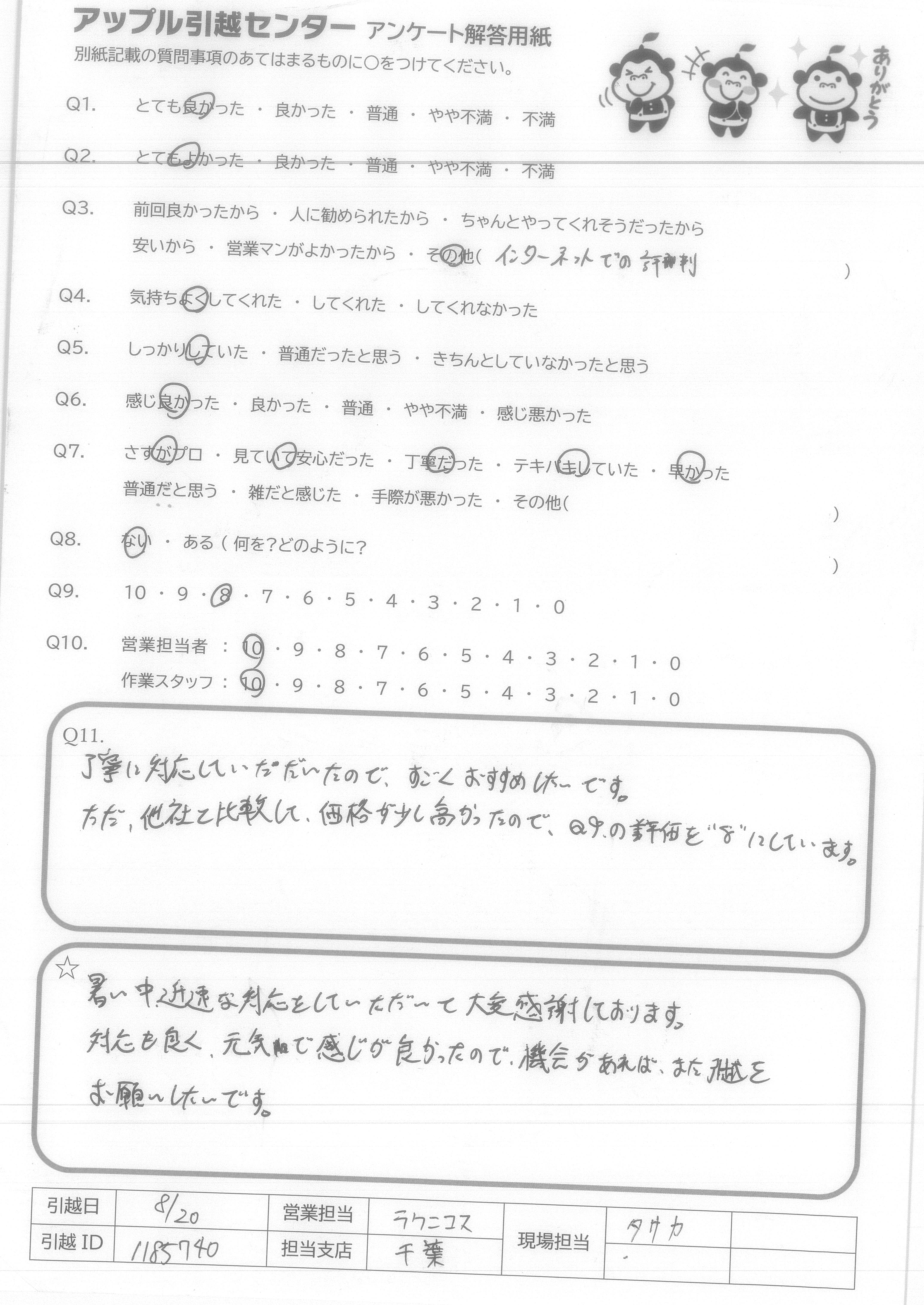 A.全体的に満足です。 アンケートですが、私のスマホOPPOですと、選択項目が選べないようですので、このあたり改善頂くと、よろしいかと思います。 また、娘が、レッスン先の先生の自宅でりんごり君のマークを見たことがあったようですが、何なのかがわからず、今回段ボールで判明したことを喜んでおりました。女子高生的にはウケてるようですので、ファミリー層に刺さる広告展開をされると営業拡大されるのではないでしょうか。私は、今回は単身分だけでしたので、比較サイトから入り、価格よりも口コミの評判を見た中で御社を選択していますが、結果選択は間違ってはいなかったと思っています。家族引っ越しは、会社負担で会社内の引越センターが選択しているので、法人営業活動も頑張っていただけると幸いです。 最後に、娘が、りんごり君をたいそう気に入ったようで、段ボールのマークも写メし、パンダより可愛いと言っておりましたので、是非ともぬいぐるみをお願いします。