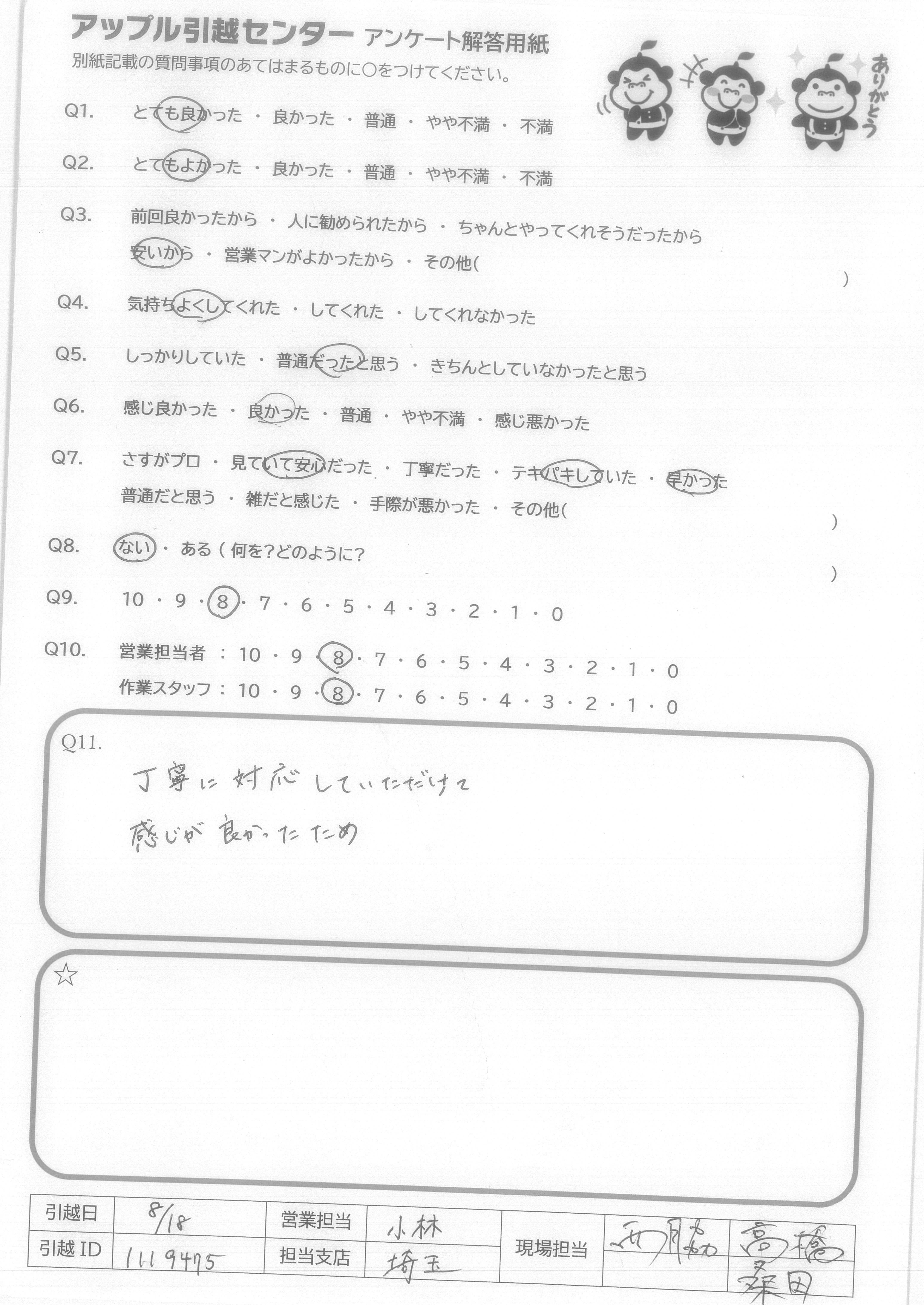 A.Q9は引越の重視するポイント次第。母の引っ越しはアートでマットなどオプションを何度かすすめられてきたがアップルさんは全くなかった。私は無い方が良いが、ある方が良い場合や料金を考えないならアートやさかいも視野に入る。 Q10は様々な対応してくてていたためにしているがフレンドリーな人で話しやすいか、 一切死後なしのような人を好むには別の方が合うかもと思う。