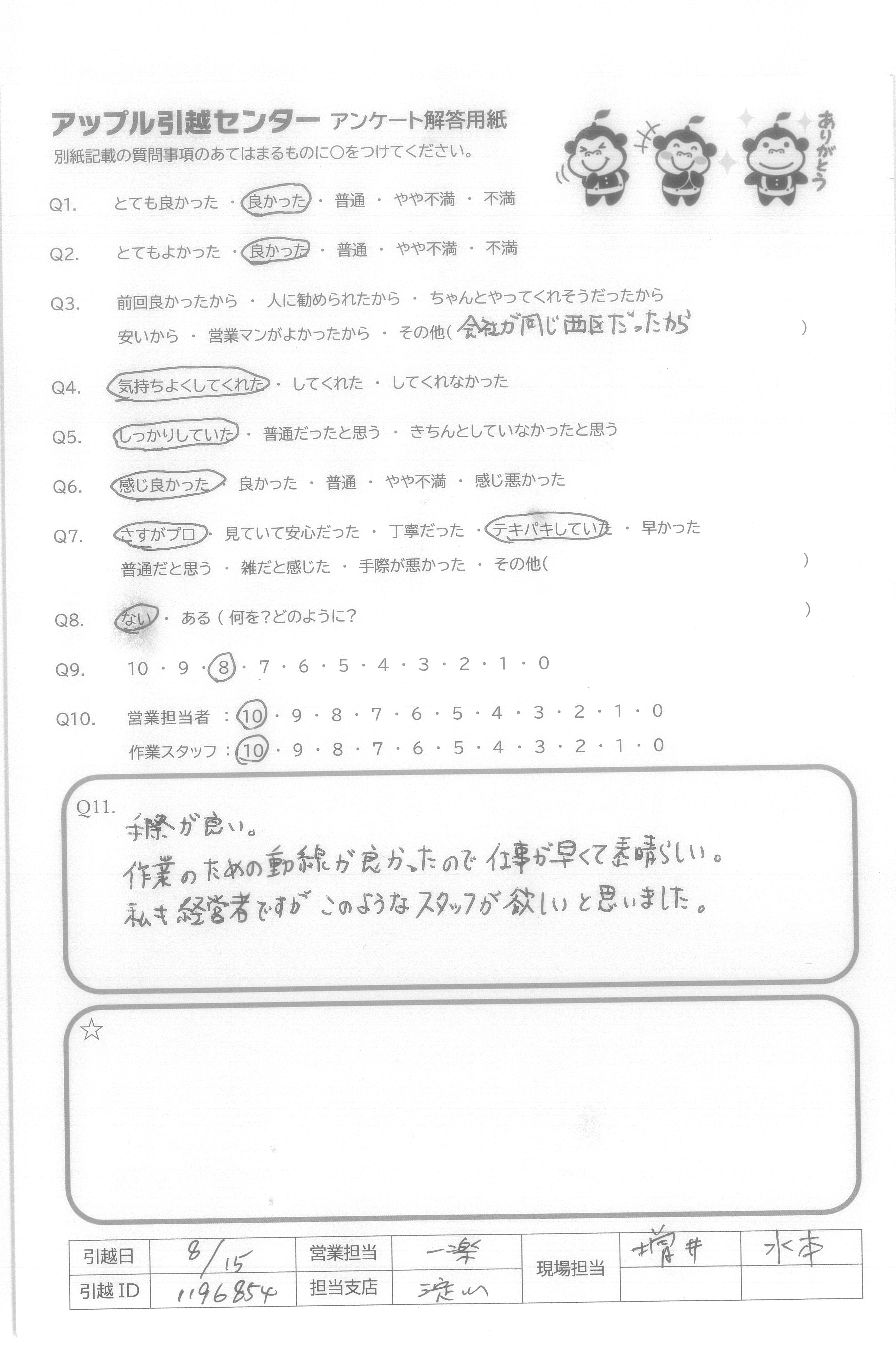 A.手際が良い。 作業のための動線が良かったので仕事が早くて素晴らしい。 私も経営者ですがこのようなスタッフが欲しいと思いました。