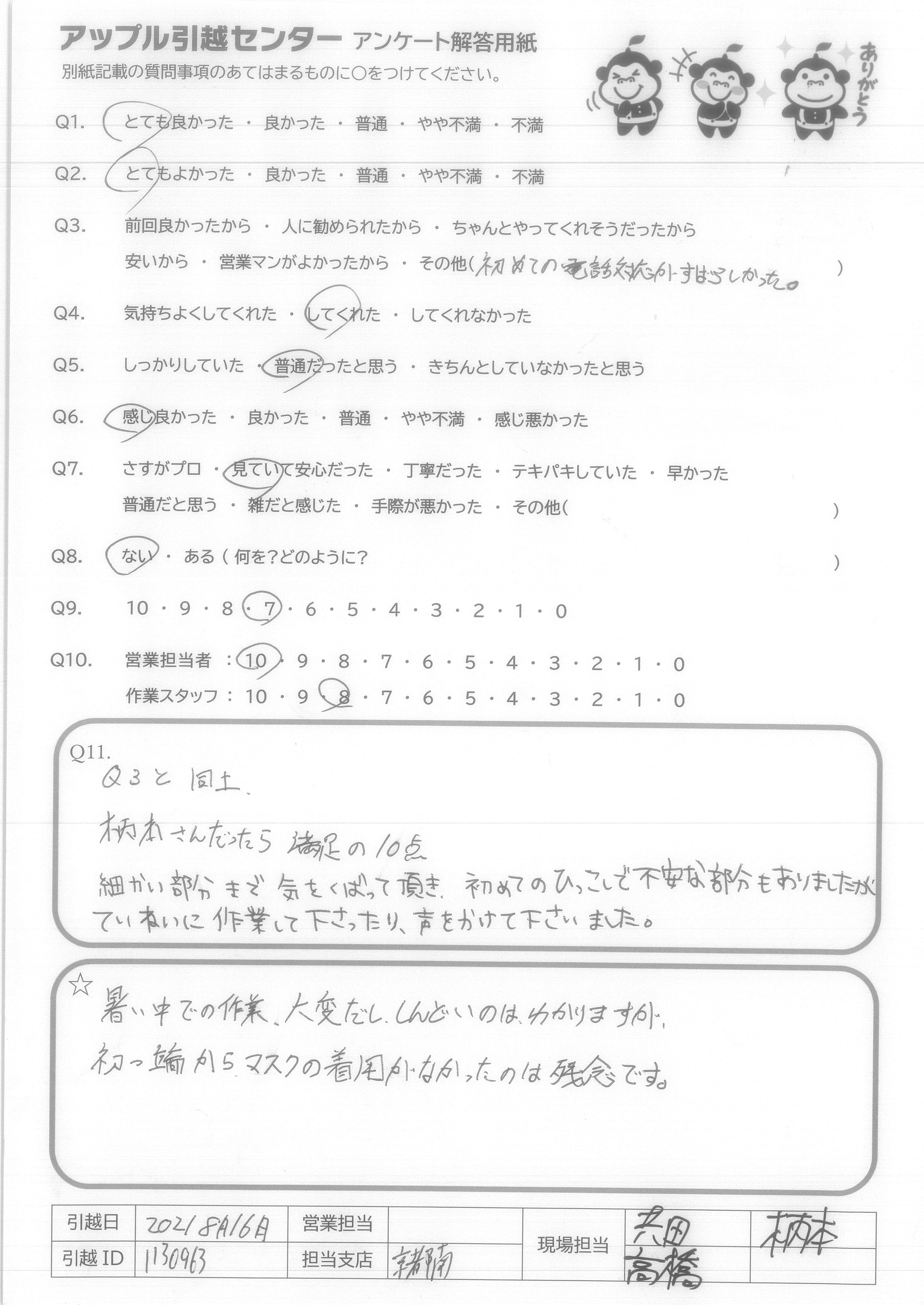 A.Q3と同上。 柄本さんだったら満足の10点 細かい部分まで気をくばって頂き、初めてのひっこしで不安な部分もありましたがていねいに作業して下さったり、声をかけて下さいました。