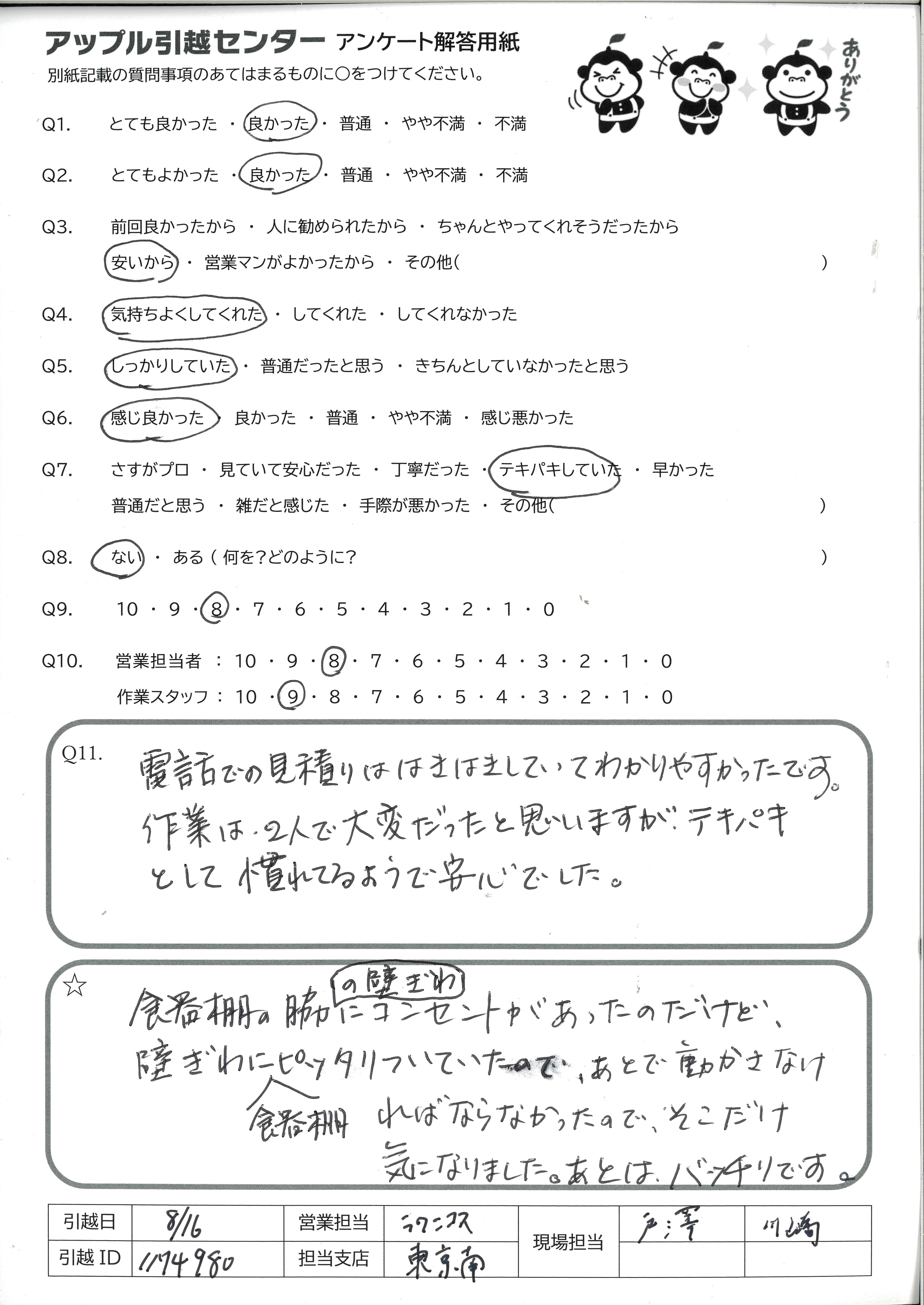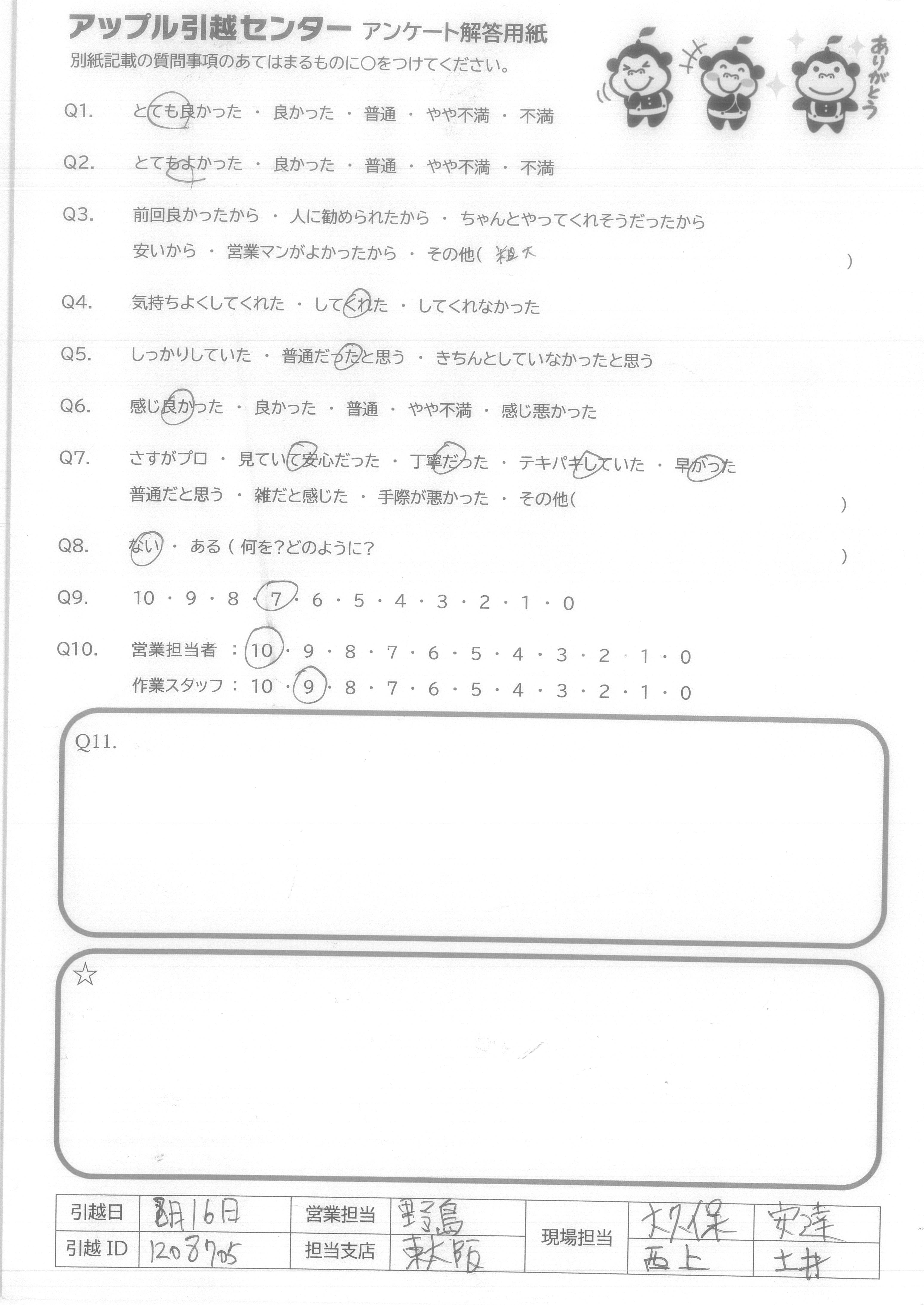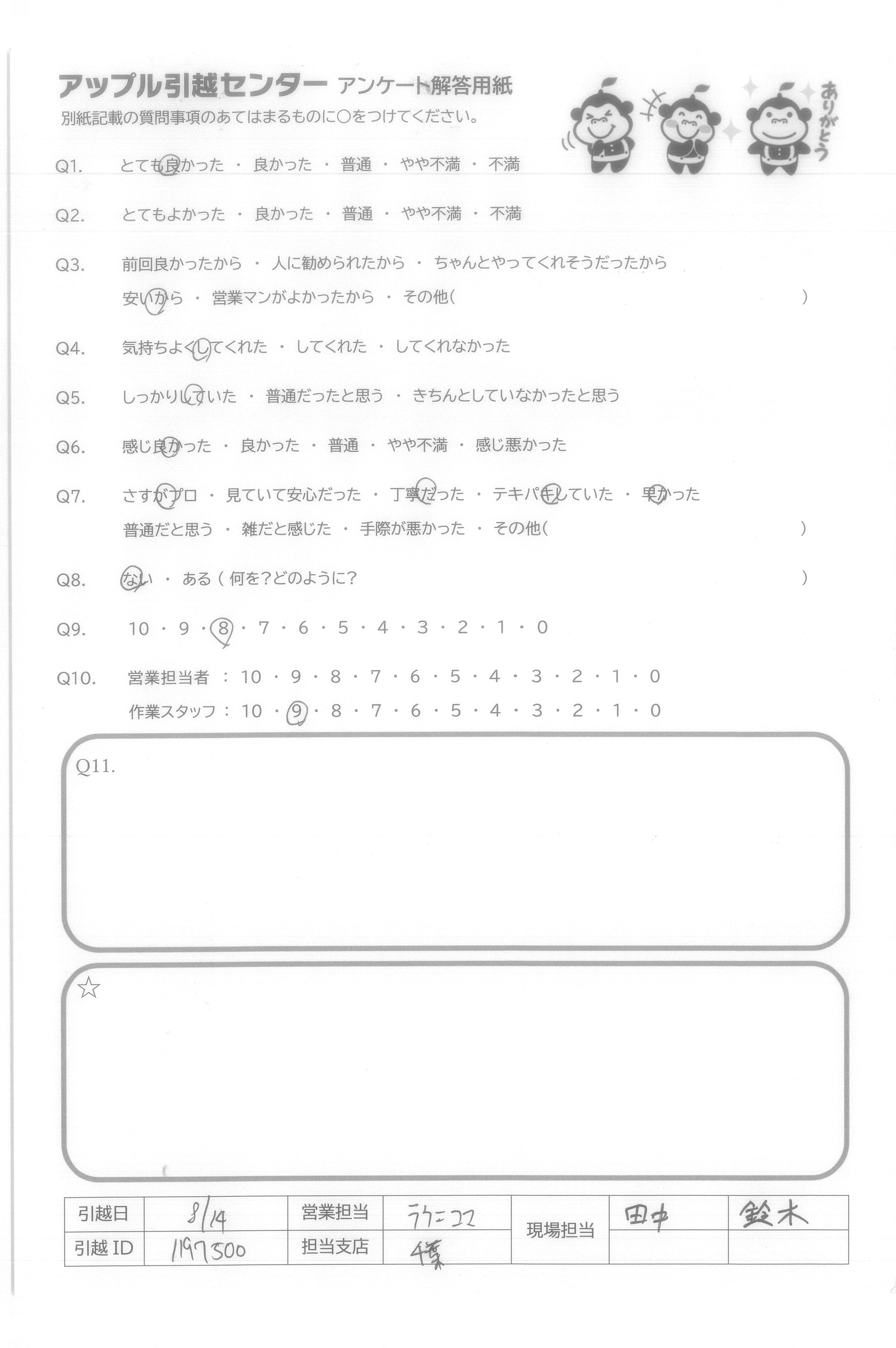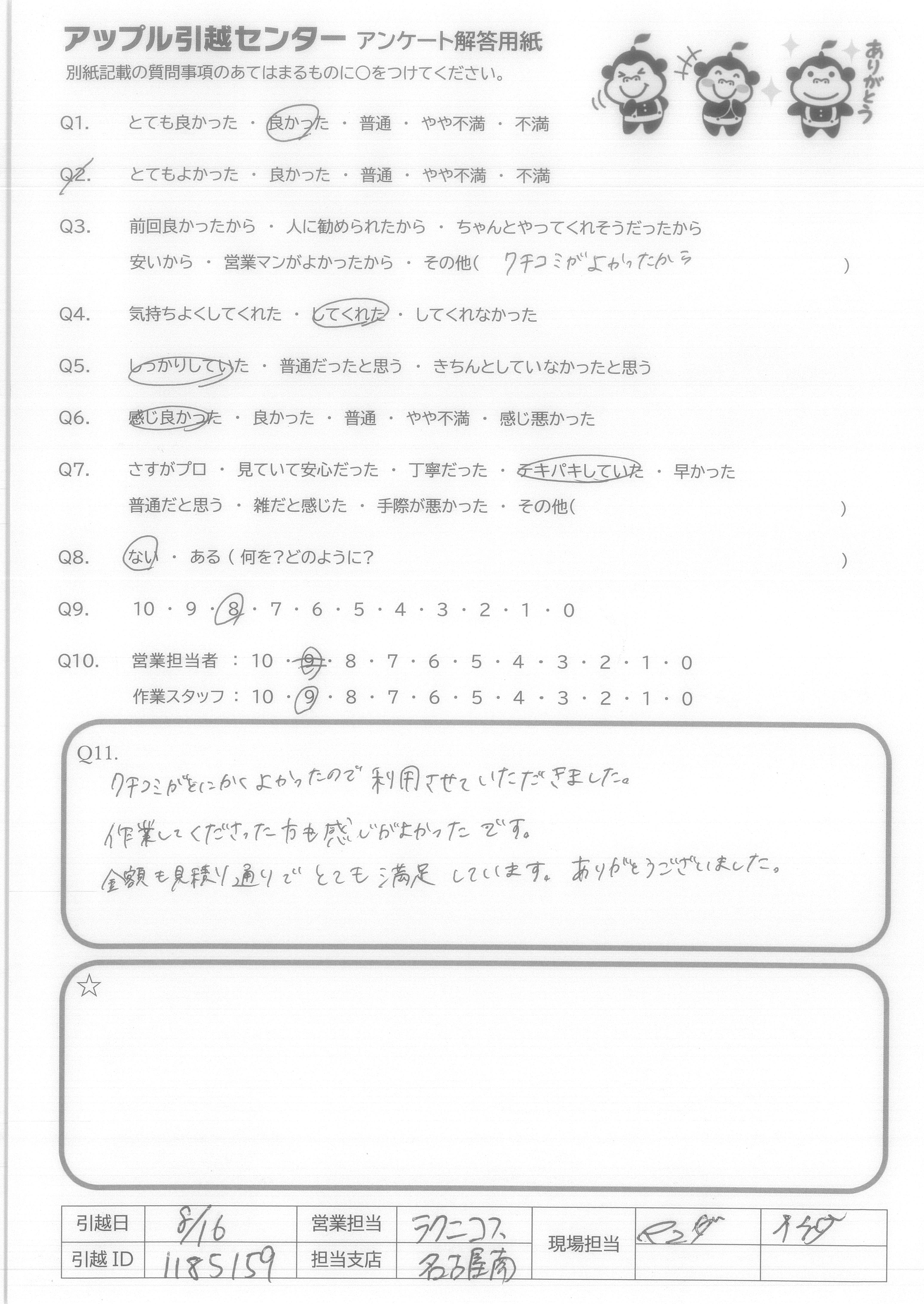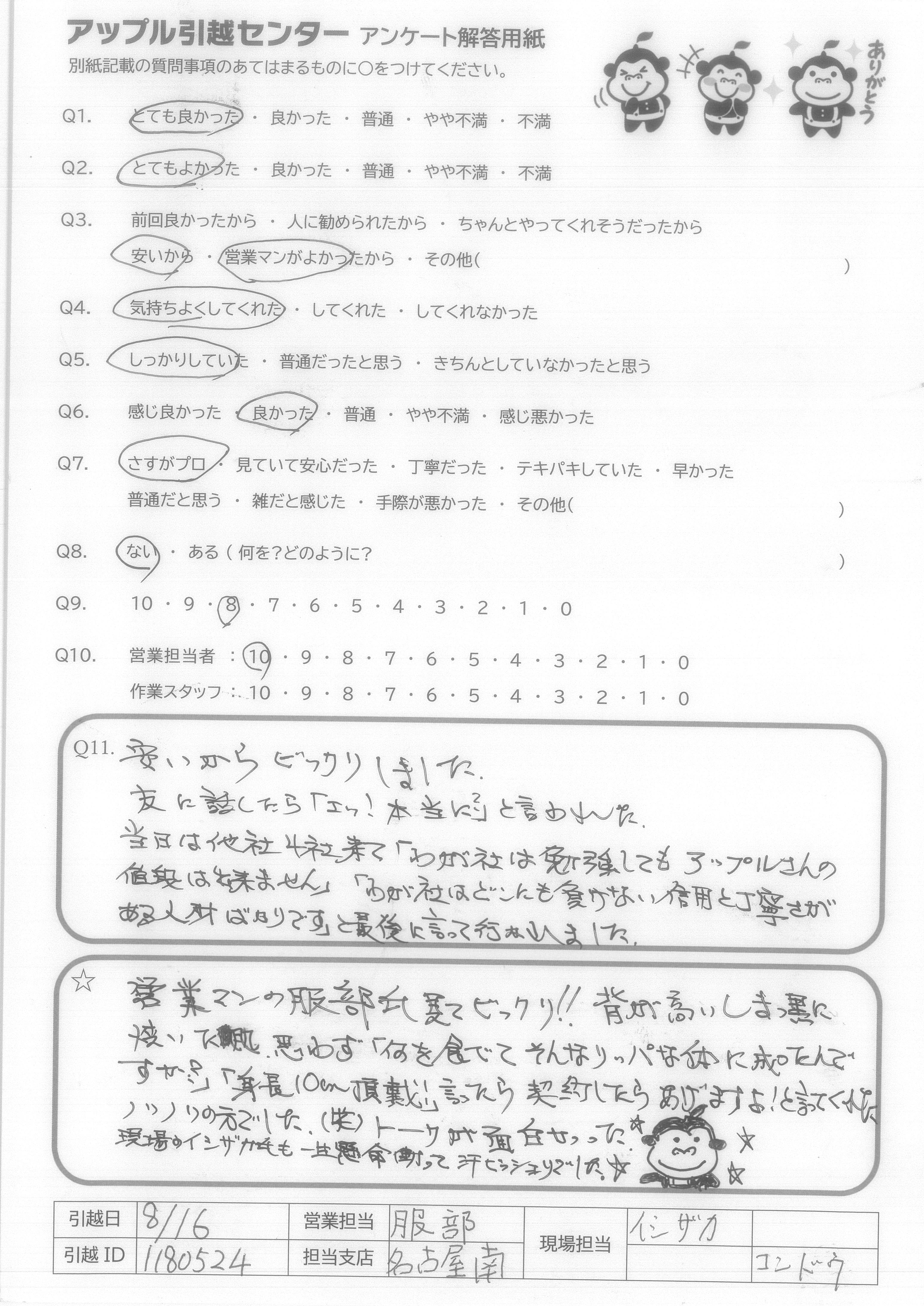 A.暑い中、重い引越荷物を運んでくださり、ありがとうございます。助かりました! 色々なサービスがあるのは魅力的なので、また機会がありましたらよろしくお願いいたします。