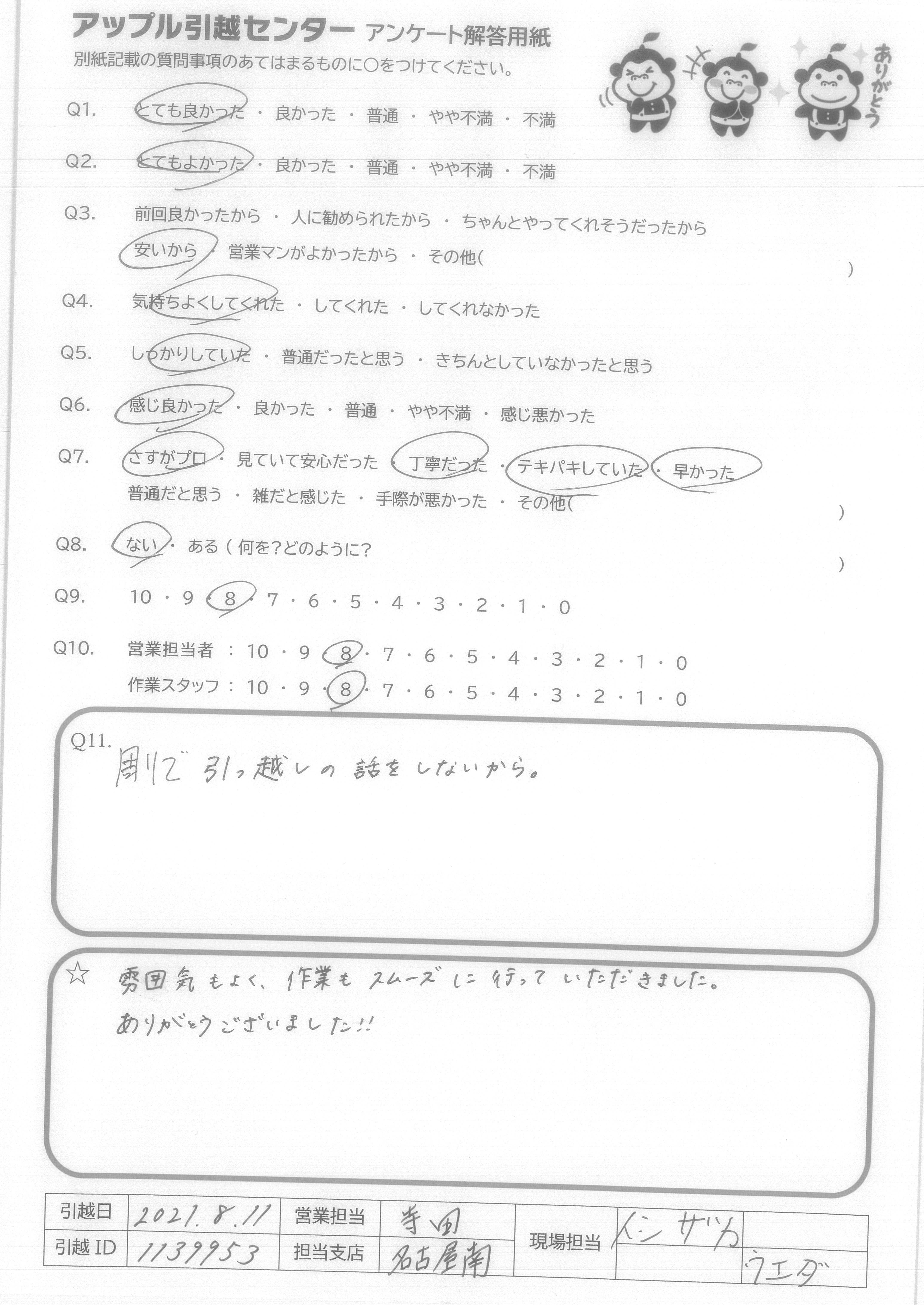 引越し日:2021年08月14日 エリア:愛知県名古屋市中村区