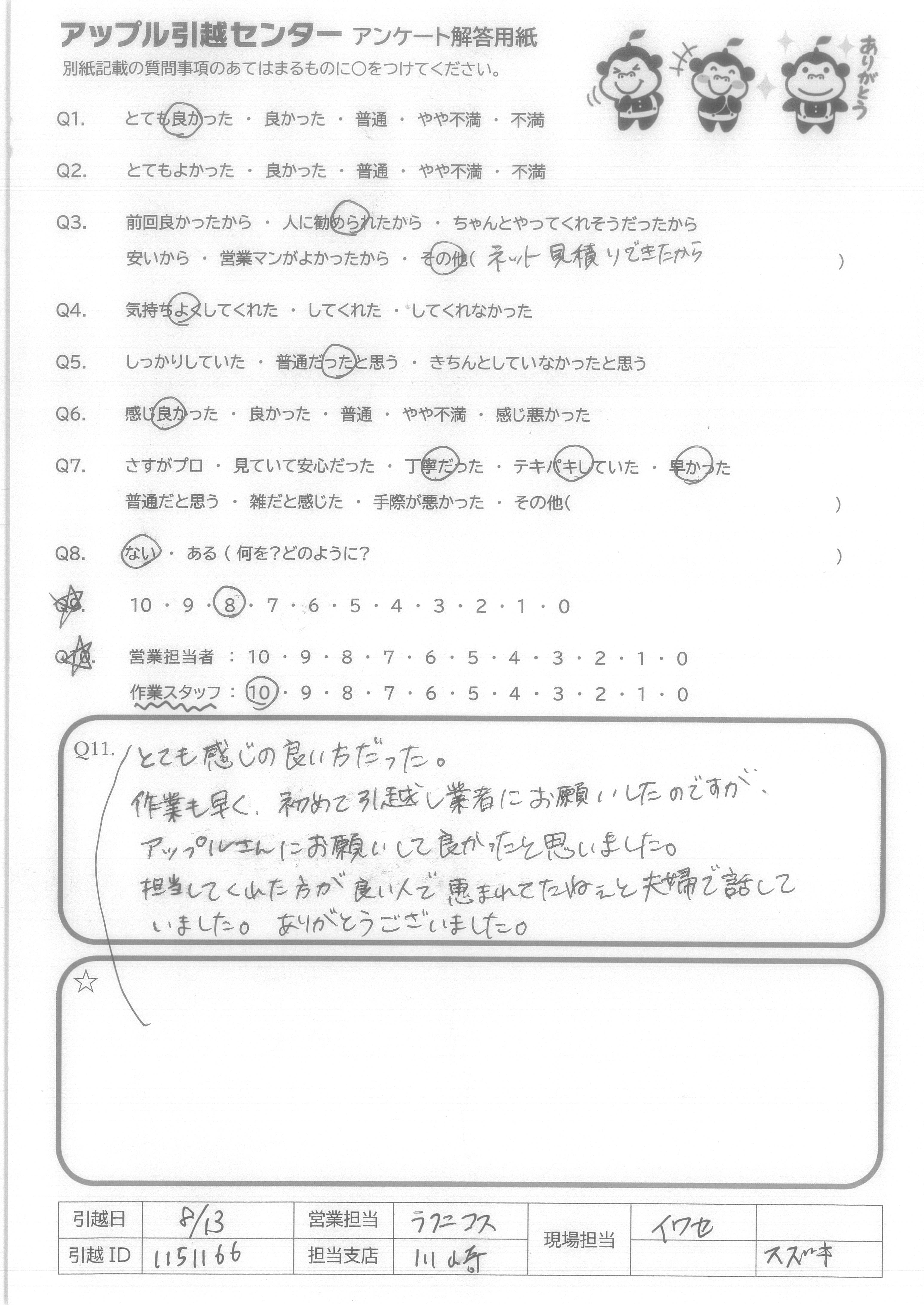 A.非常に感じが良く、とても気持ち良く引越することができました!本当にありがとうございました。!!