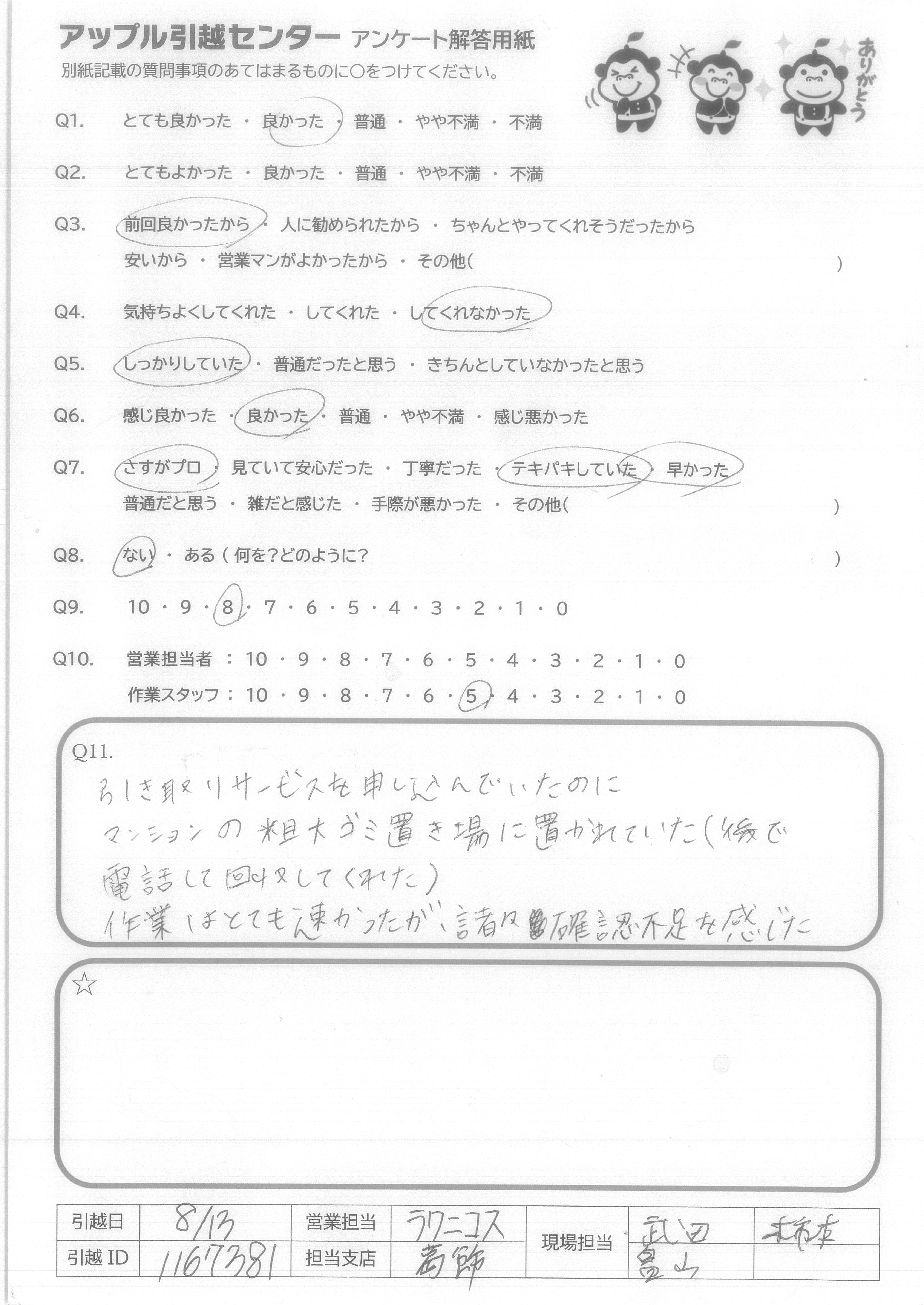 A.引き取りサービスを申し込んでいたのにマンションの粗大ゴミ置き場に置かれていた(後で電話して回収してくれた) 作業はとても速かったが、諸々確認不足を感じた。