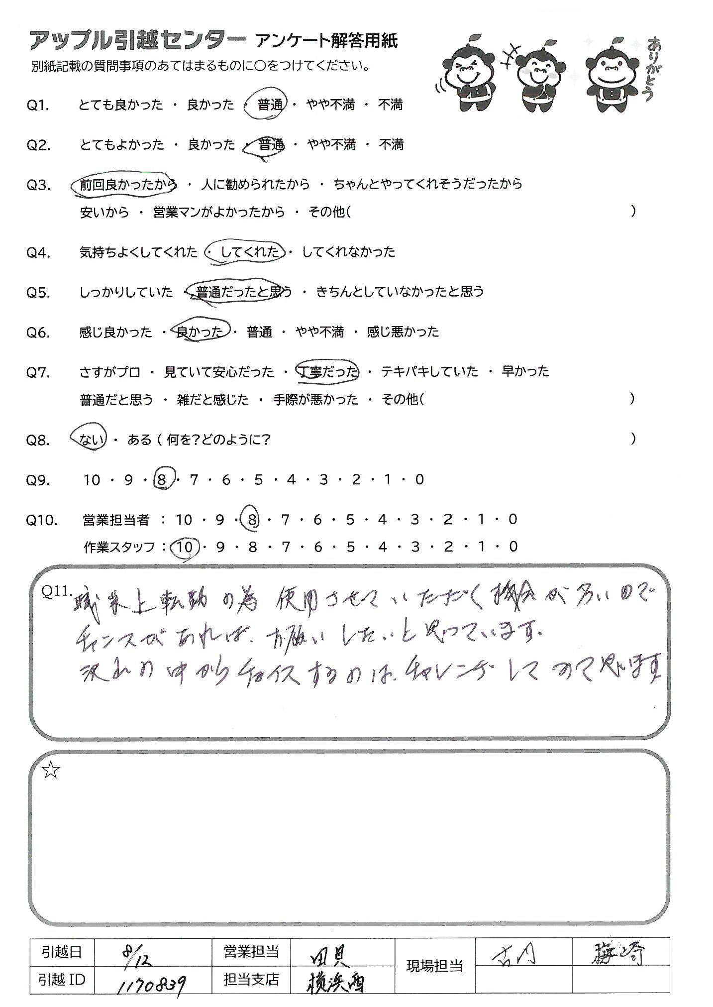 A.とても感じの良い方だった。 作業も早く、初めて引越し業者にお願いしたいのですが、 アップルさんにお願いして良かったと思いました。 担当してくれた方が良い人で恵まれてたねえと夫婦で話していました。ありがとうございました。