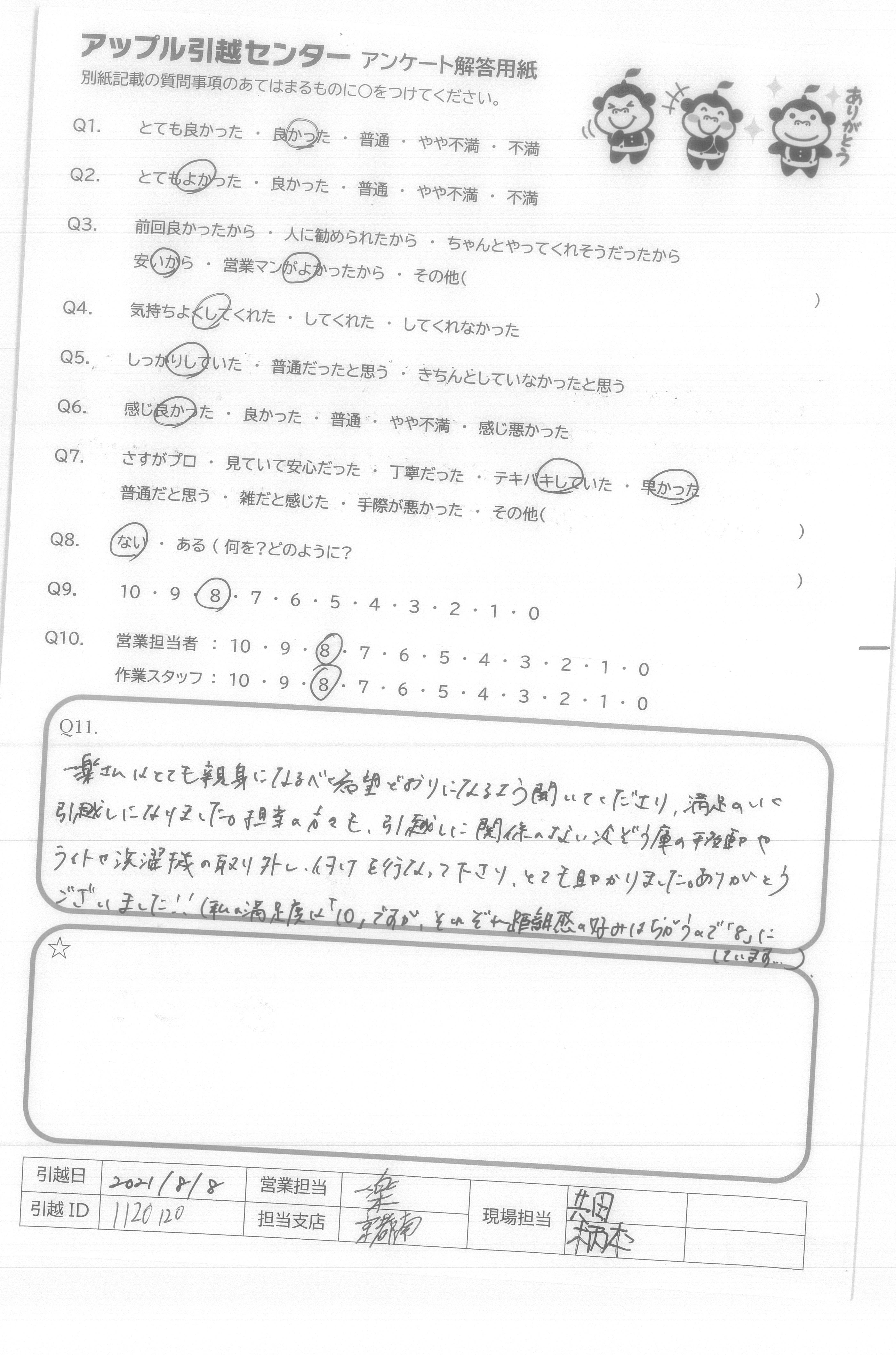 引越し日:2021年08月08日 エリア:大阪府大阪市旭区