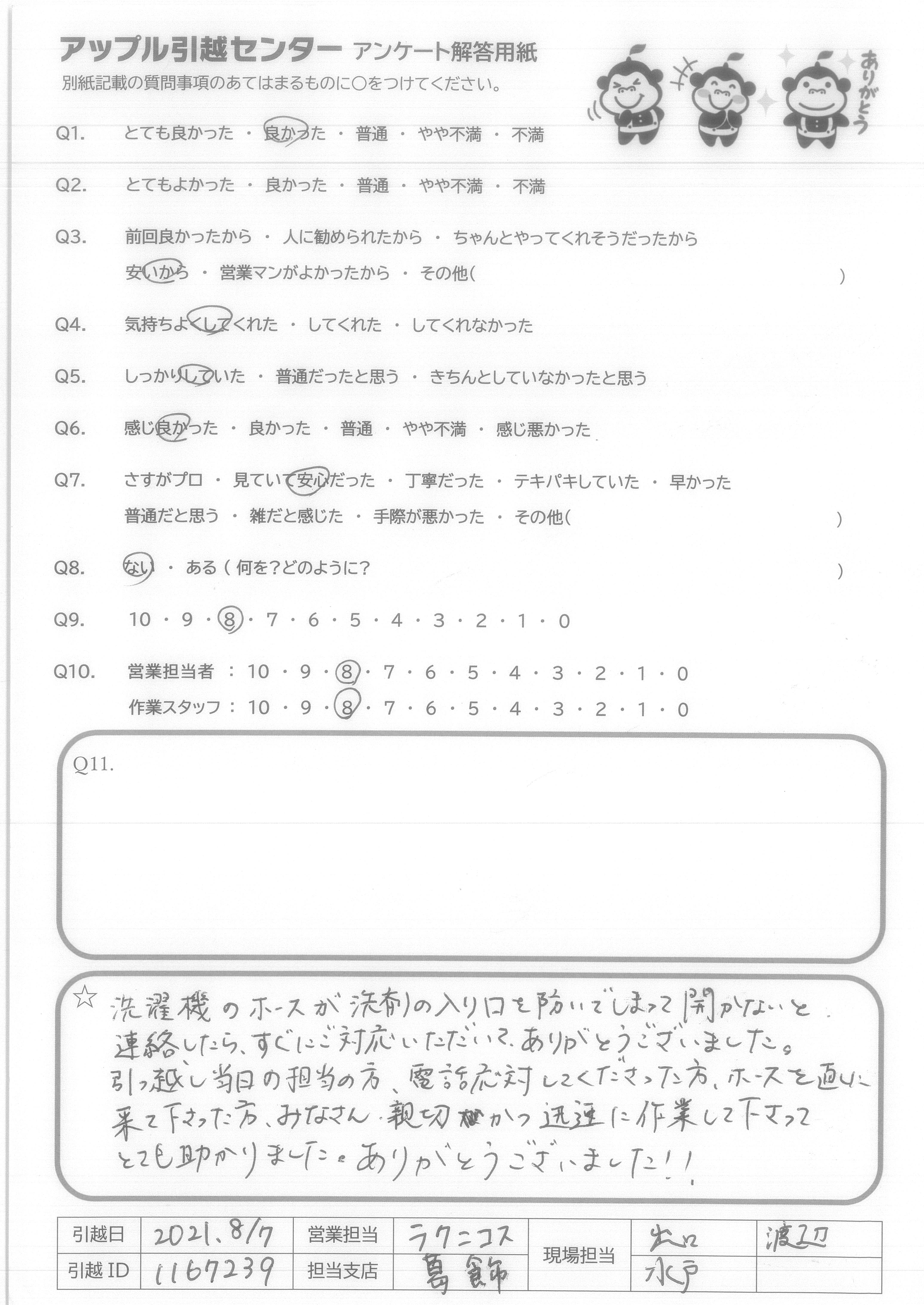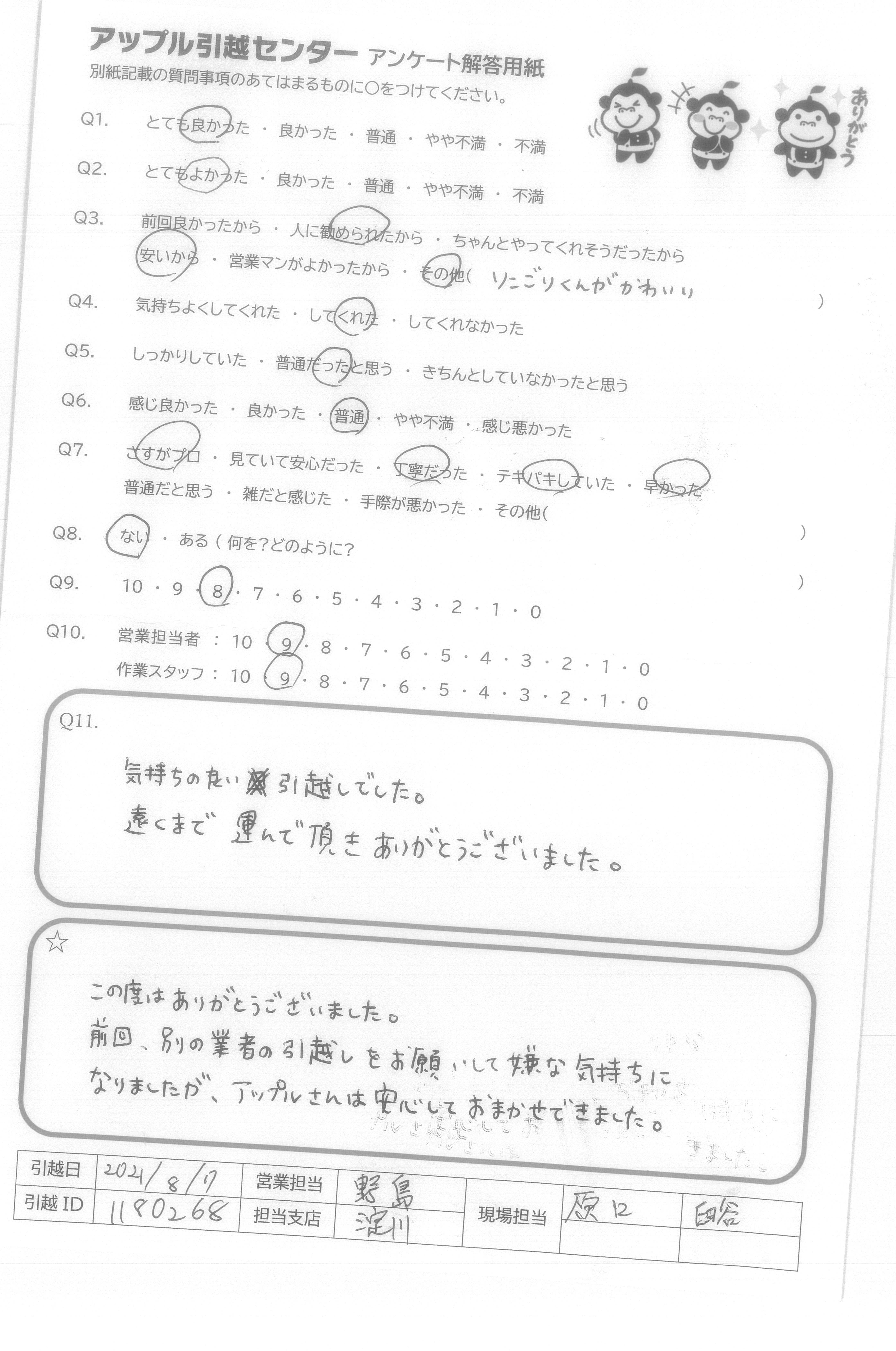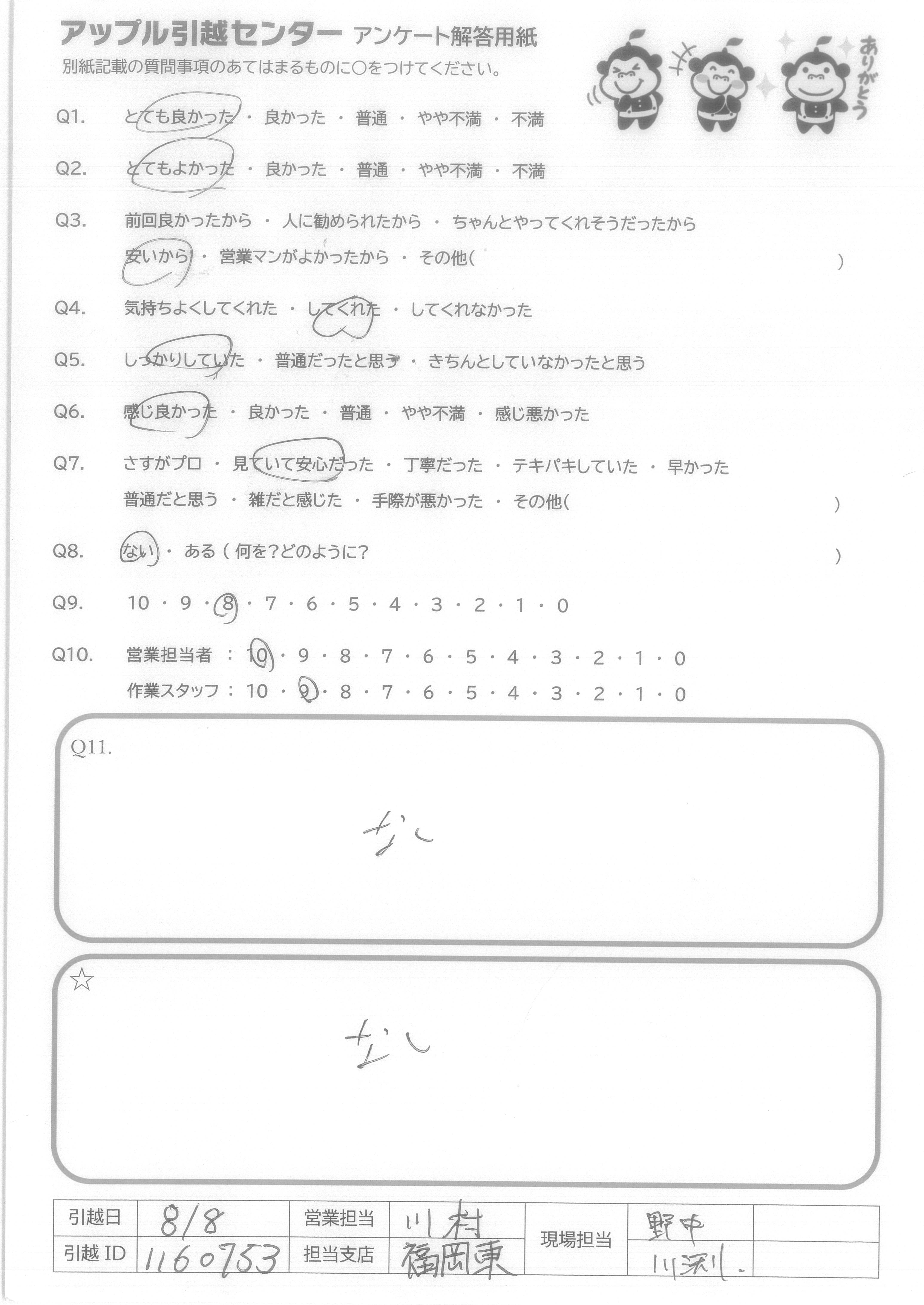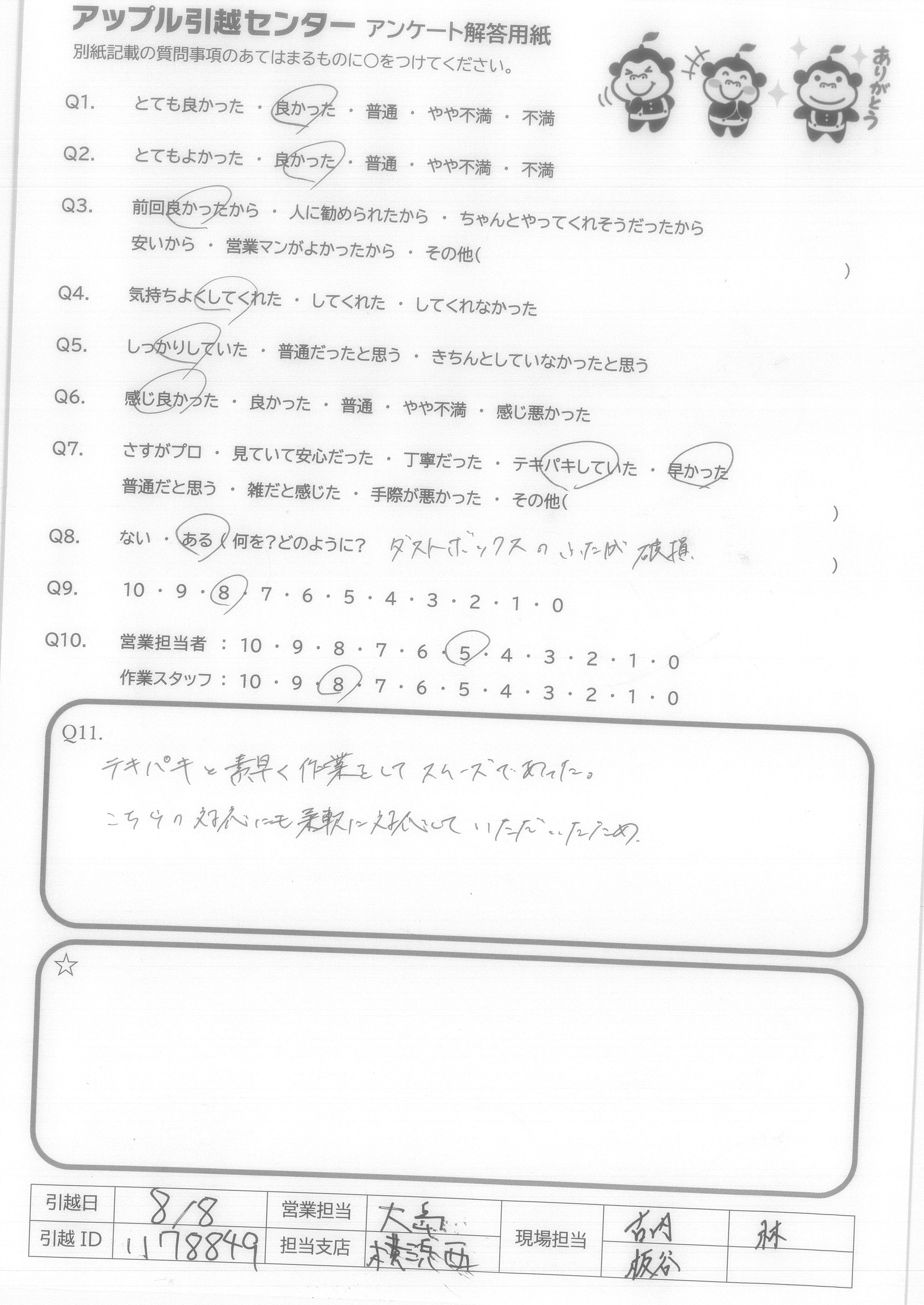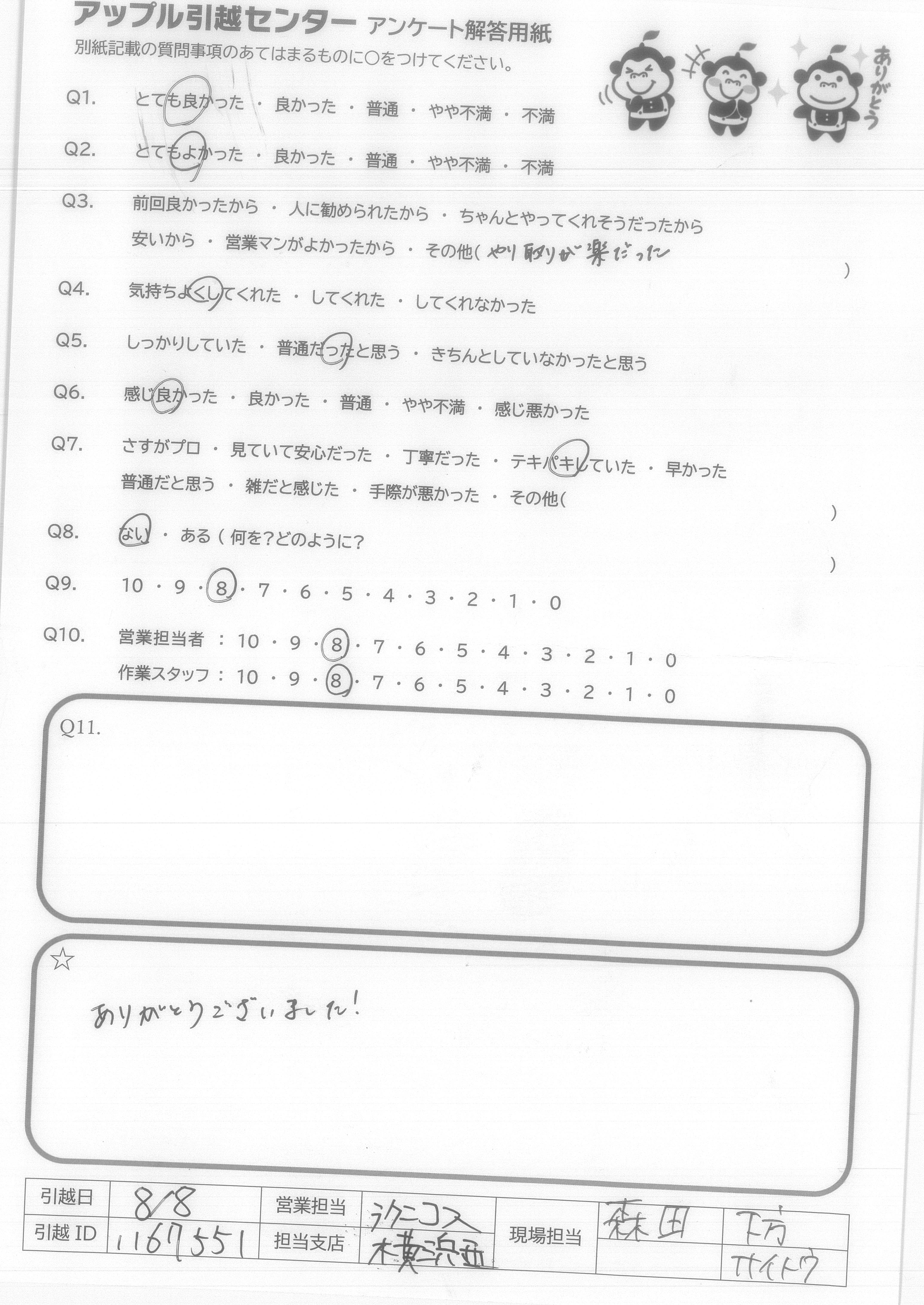 A.この度はありがとうございました。 前回、別の業者の引越しをお願いして嫌な気持ちになりましたが、アップルさんは安心しておまかせできました。