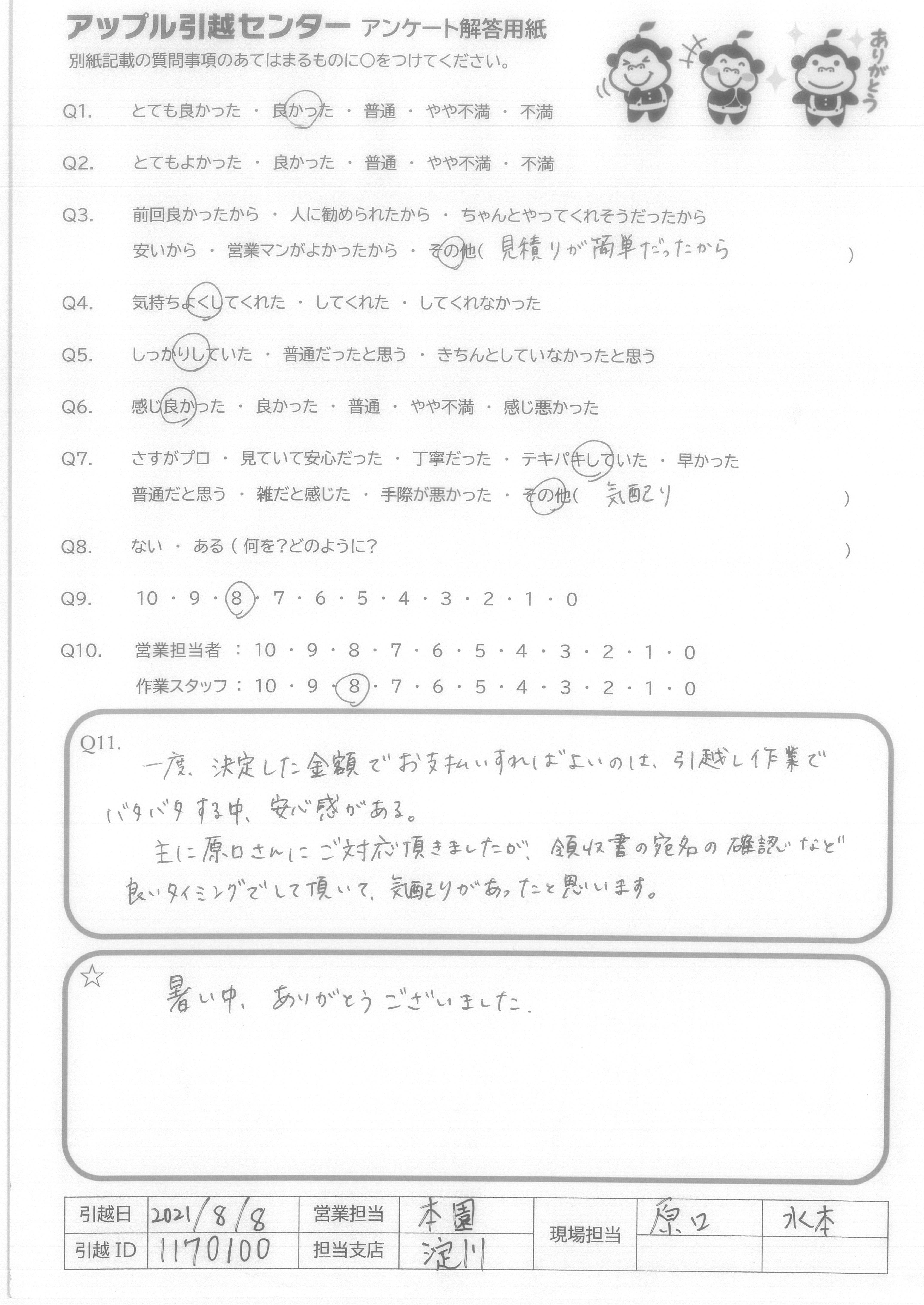 A.一度、決定した金額でお支払いすればよいのは、引越し作業でバタバタする中、安心感がある。 主に原口さんにご対応頂きましたが、領収書の宛名の確認など良いタイミングでして頂いて、気配りがあったと思います。