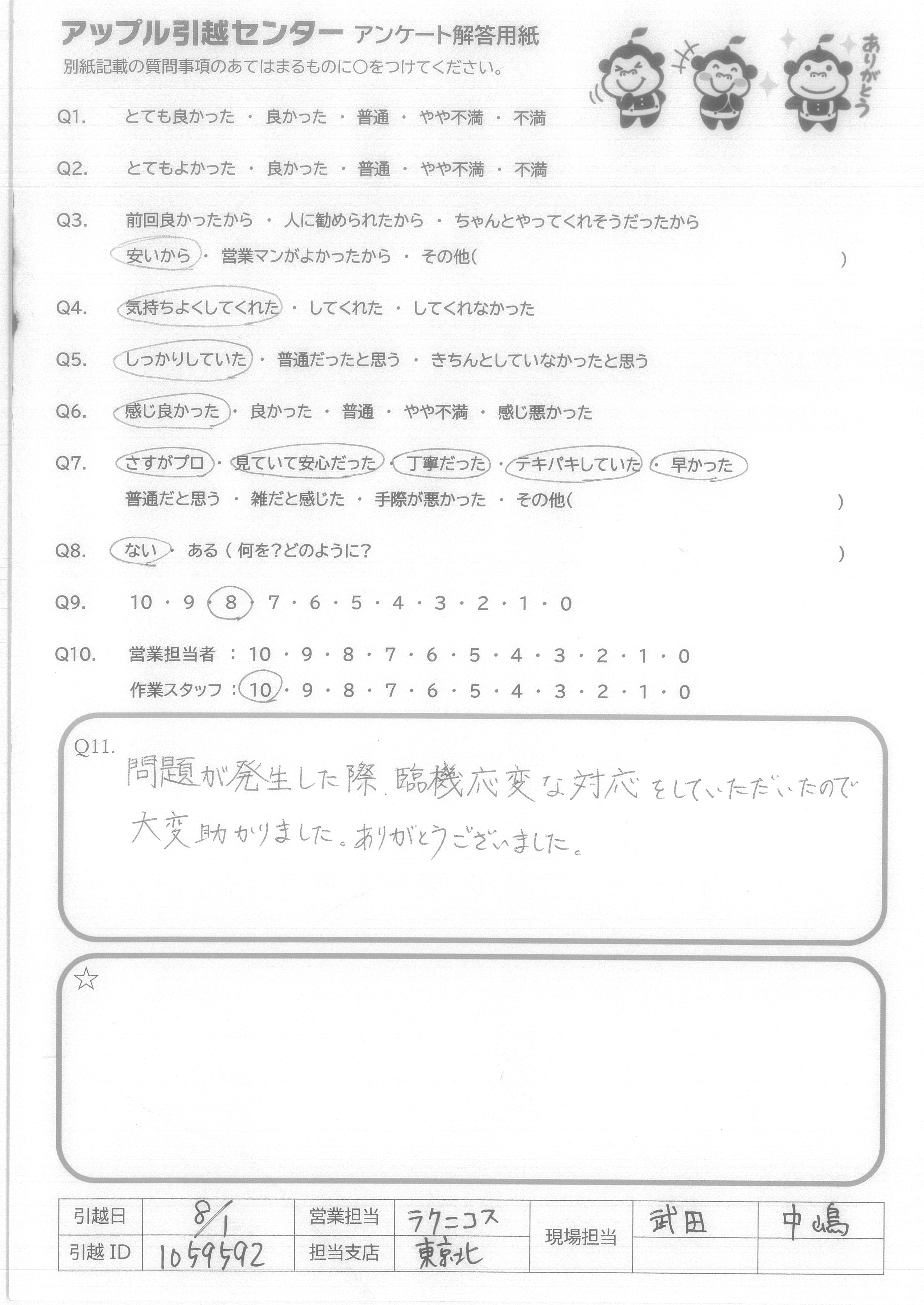 A.電話受付者はスピーディーで不満はありませんでした。 引っ越しスタッフについては、対応自体はスムーズでしたが、スタッフが引っ越し先を出発してから、引っ越し先に来られるまでの時間が長く、心配になった。