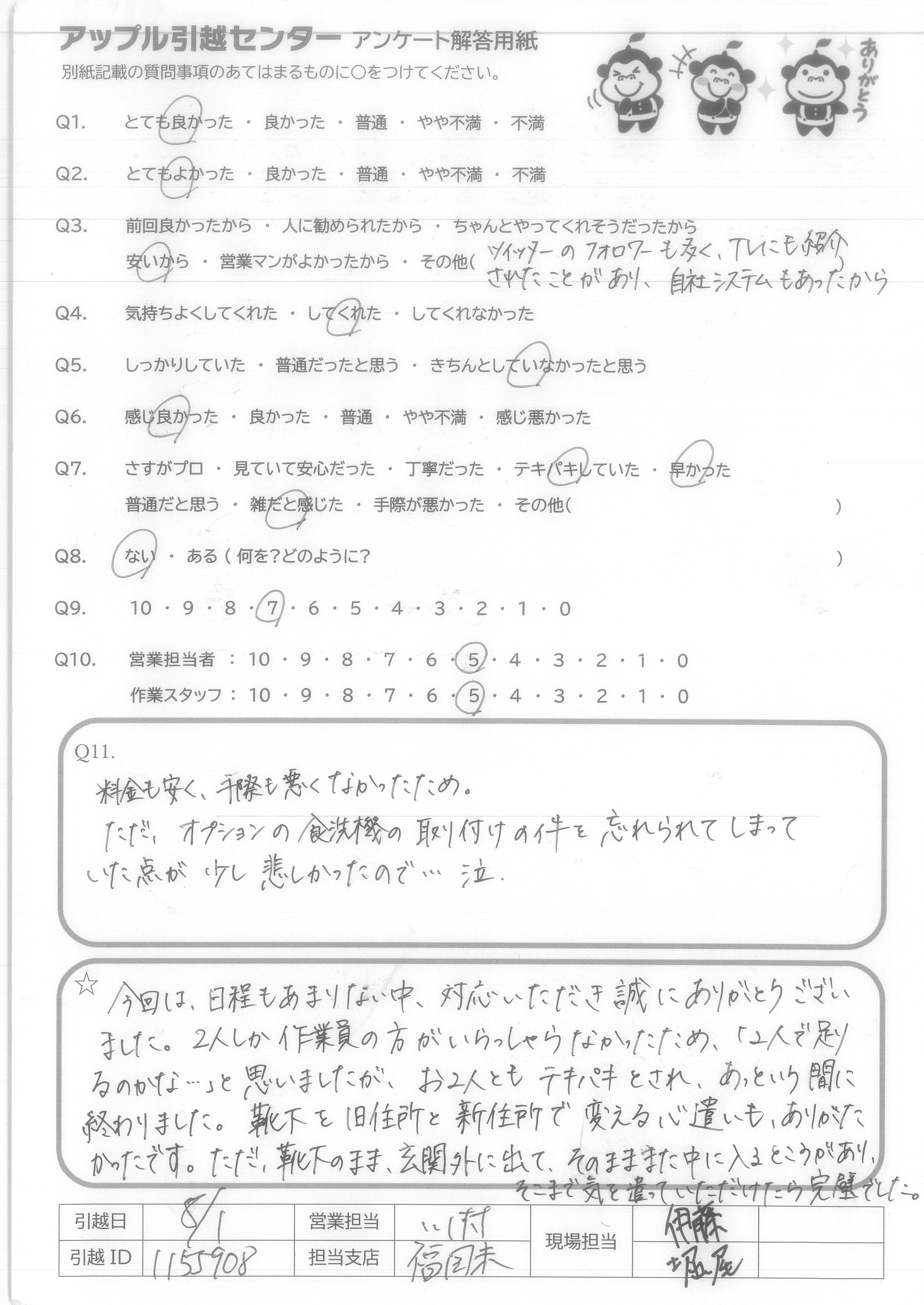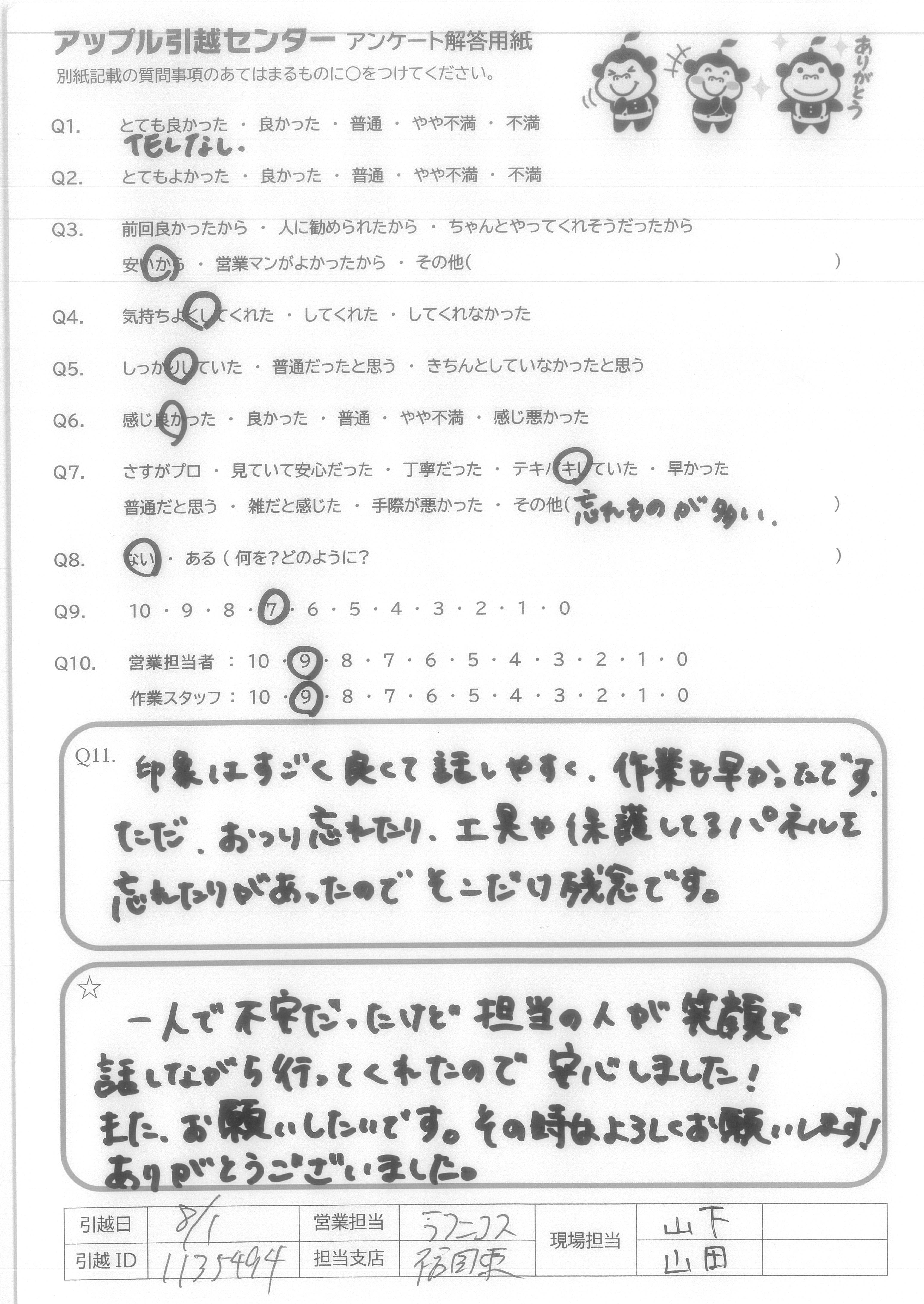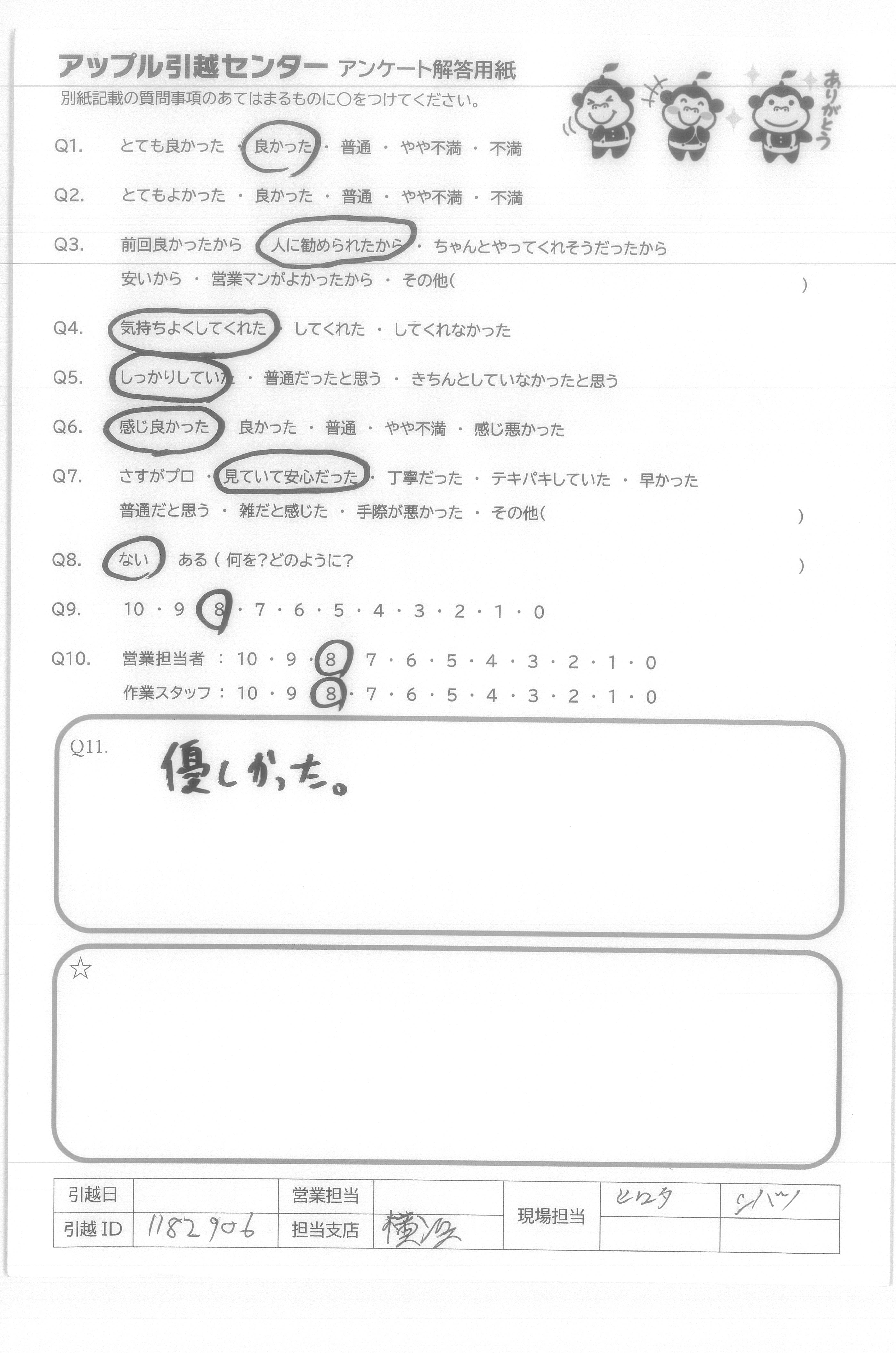 A.今回は、日程もあまりない中、対応いただき誠にありがとうございました。2人しか作業員の方がいらっしゃらなかったため、「2人で足りるのかな…」と思いましたが、お2人ともテキパキとされ、あっという間に終わりました。靴下を旧住所と新住所で変える心遣いも、ありがたかったです。ただ、靴下のまま、玄関外に出て、そのまままた仲に入るところがあり、そこまで気を使っていただけたら完璧でした。