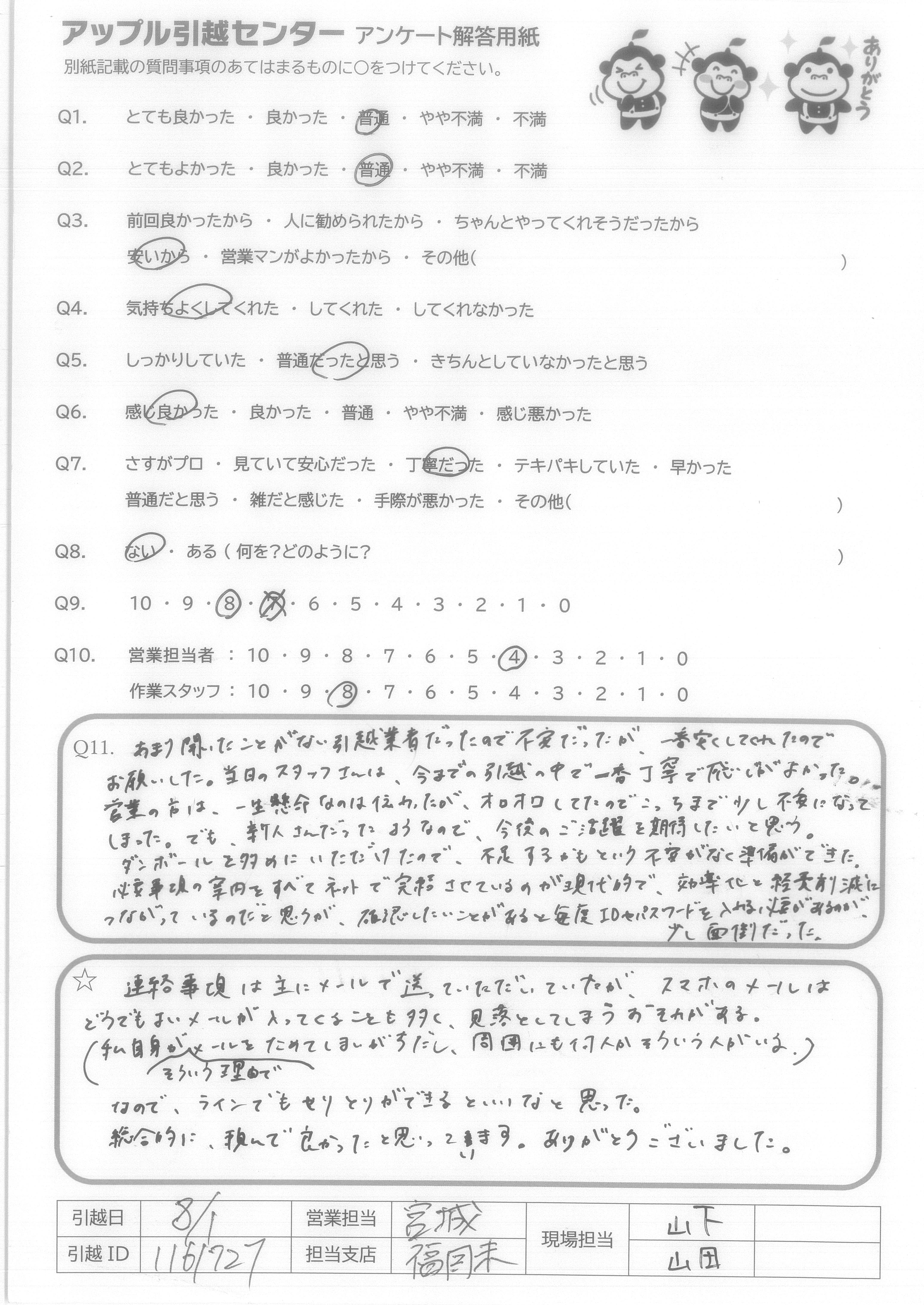 A.あまり聞いたことがない引越業者だったので不安だったが、一番安くしてくれたのでお願いした。当日のスタッフさんは、今までの引越の中で一番丁寧で感じがよかった。 営業の方は、一生懸命なのは伝わったが、オロオロしてたのでこっちまで少し不安になってしまった。でも、新人さんだったようなので、今後のご活躍を期待したいと思う。 ダンボールは多めにいただけたので、不足するかもという不安がなく準備ができた。必要事項の案内をすべてネットで完結させているのが現代的で、効率化と経費削減につながっているのだと思うが、確認したいことがあると毎度IDやパスワードを入れる必要があるのが少し面倒だった。