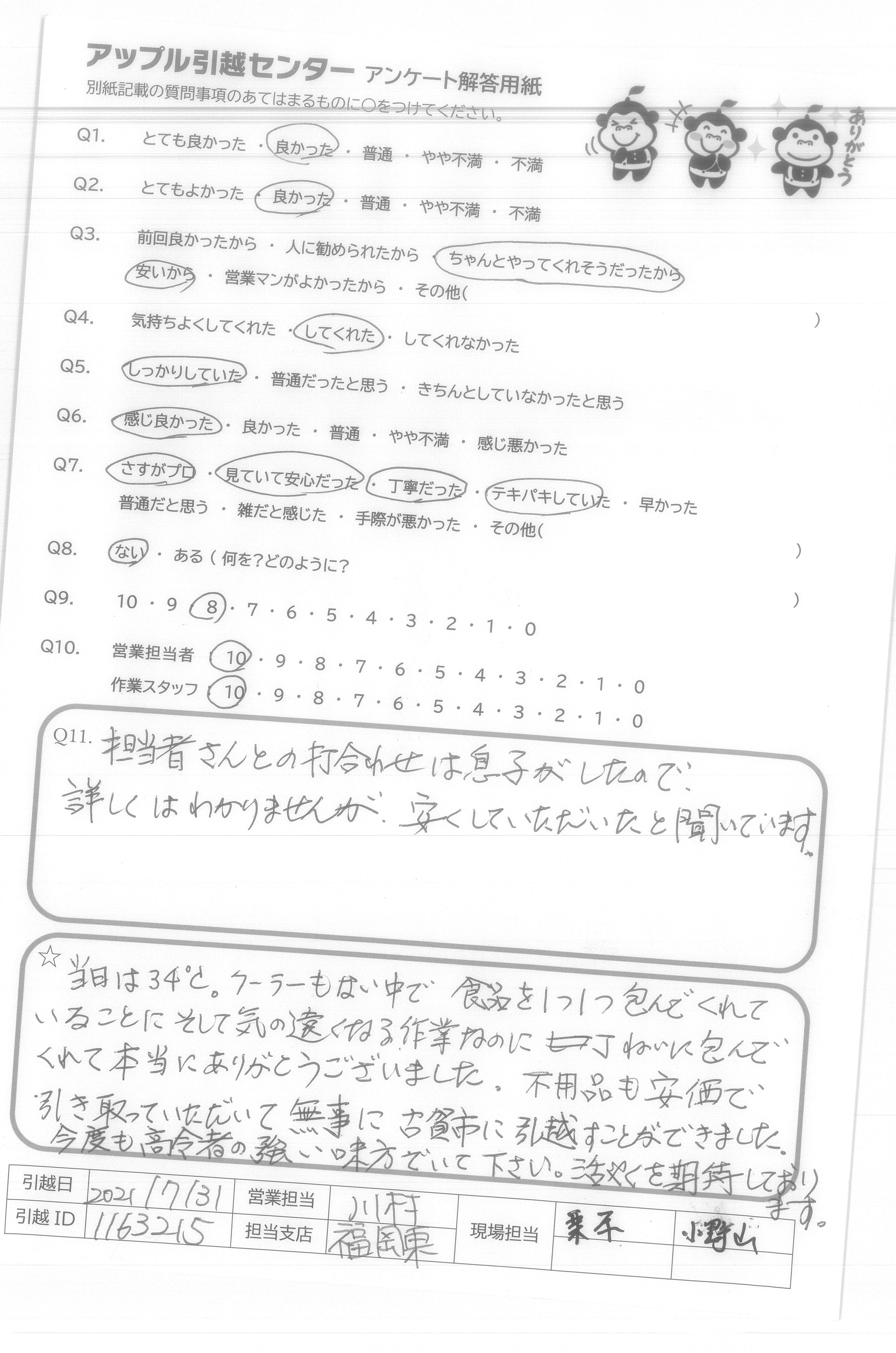 A.当日は34℃。クーラーもない中で食品を1つ1つ包んでくれていることにそして気の遠くなる作業なのに丁ねいに包んでくれて本当にありがとうございました。不用品も安価で引き取っていただいて無事に古賀市に引っ越すことができました。今度も高令者の強い味方でいて下さい。活やくを期待しております。