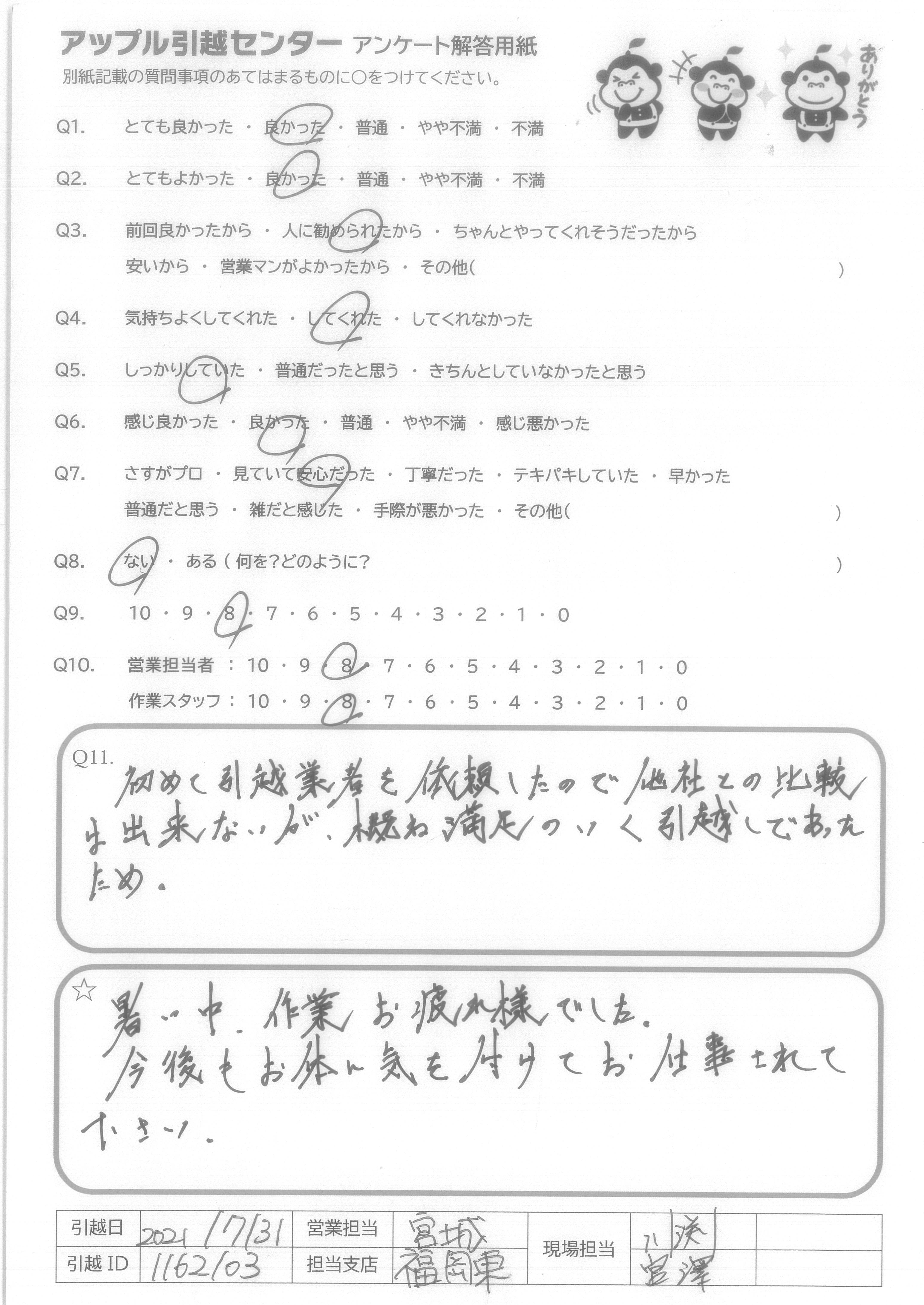 A.初めて引越業者を依頼したので他社との比較は出来ないが、概ね満足のいく引越しであったため。