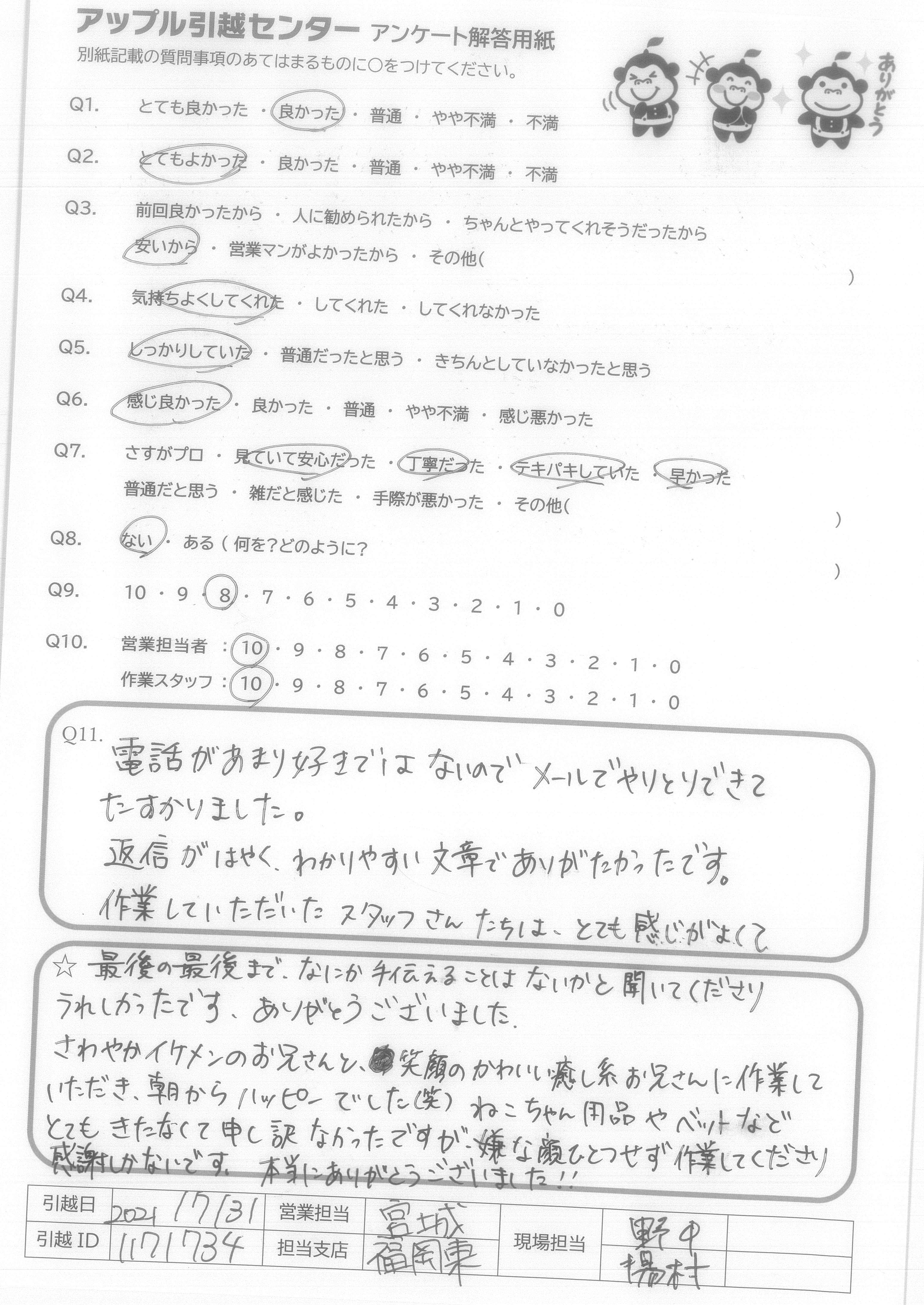A.最後の最後まで、なにか手伝えることはないかと聞いてくださりうれしかったです。ありがとうございました。 さわやかイケメンのお兄さんと、笑顔のかわいい癒し系お兄さんに作業していただき、朝からハッピーでした(笑)ねこちゃん用品やベットなどとてもきたなくて申し訳なかったですが、嫌な顔ひとつせず作業してくださり感謝しかないです。本当にありがとうございました!!