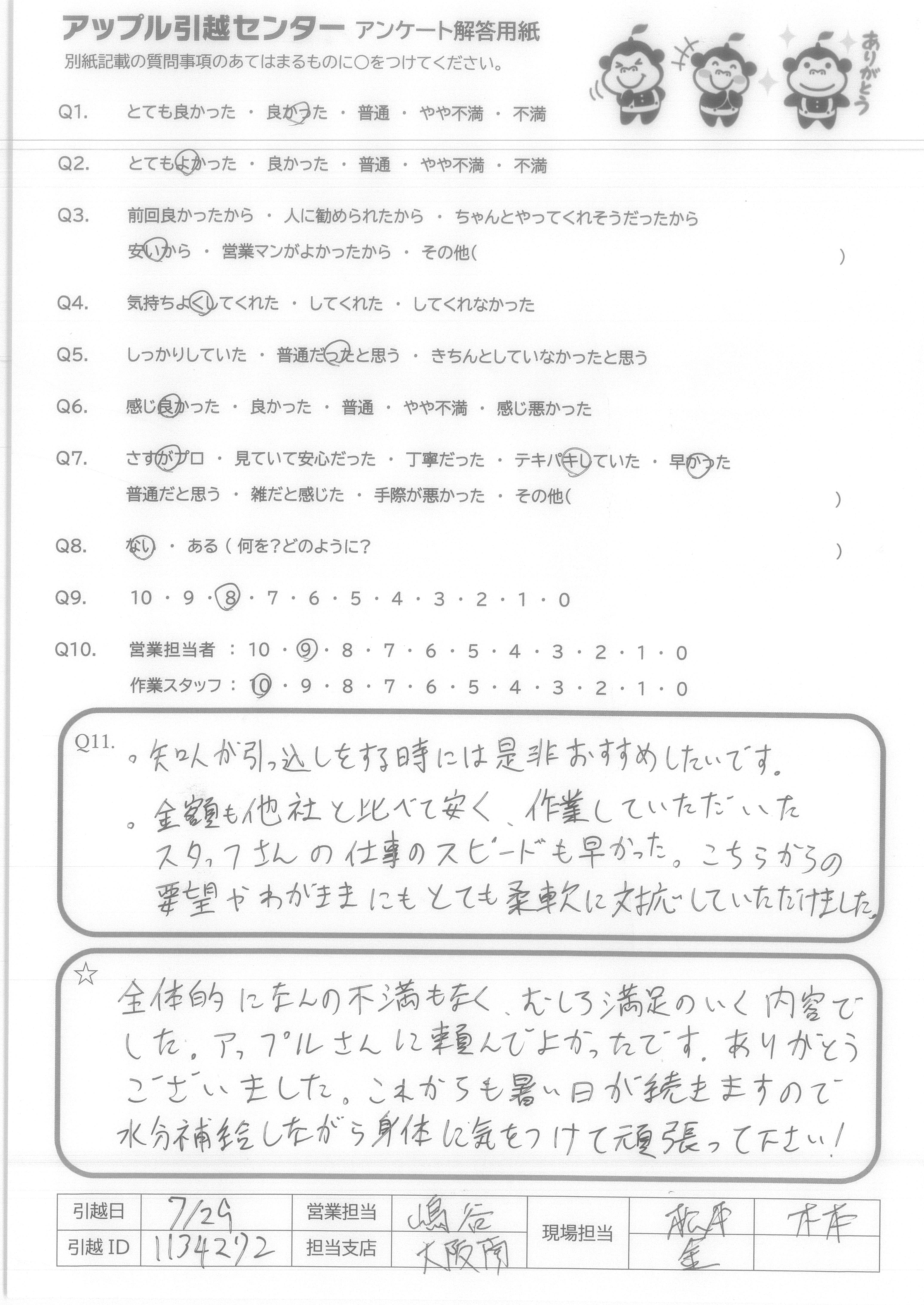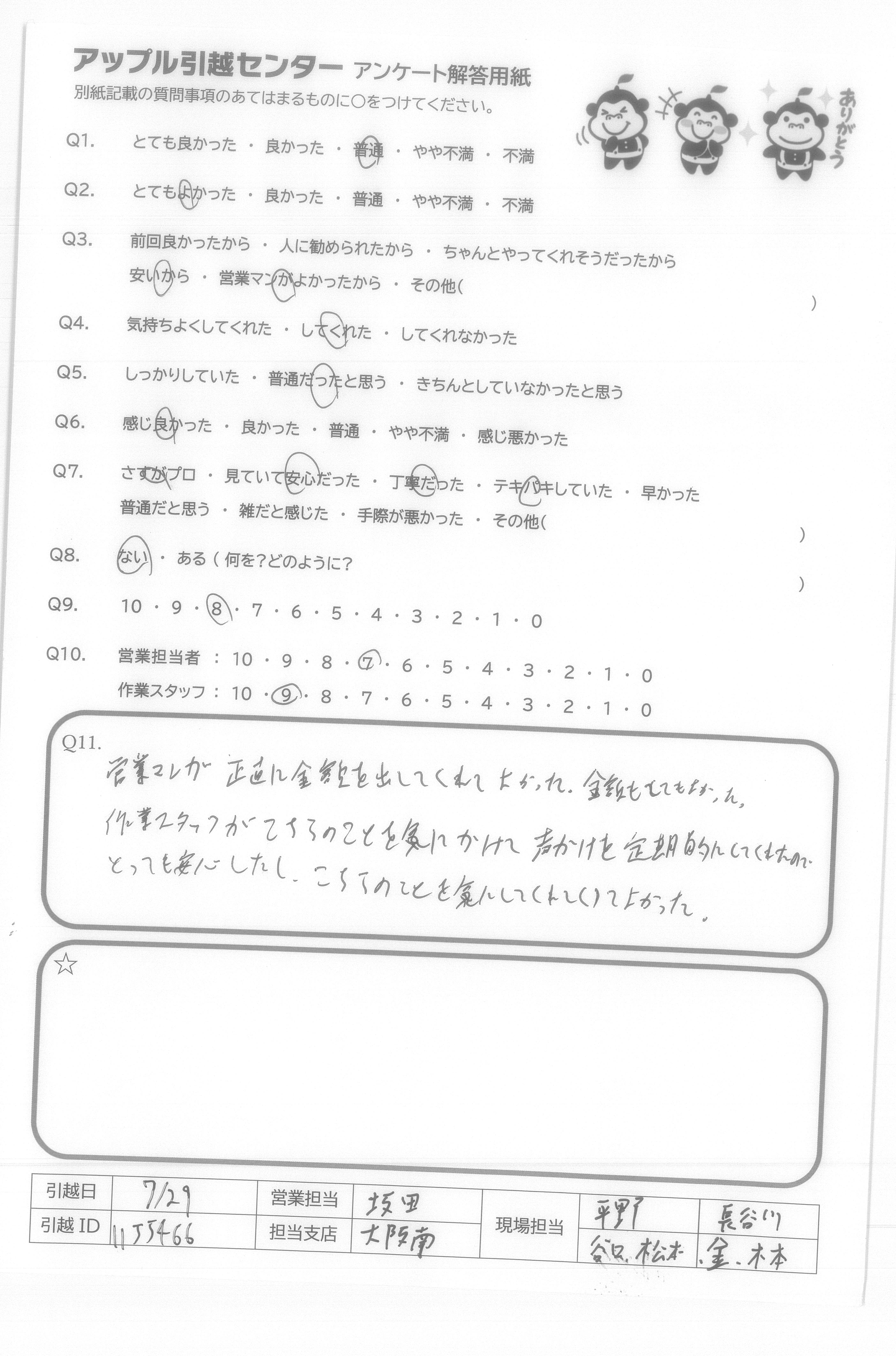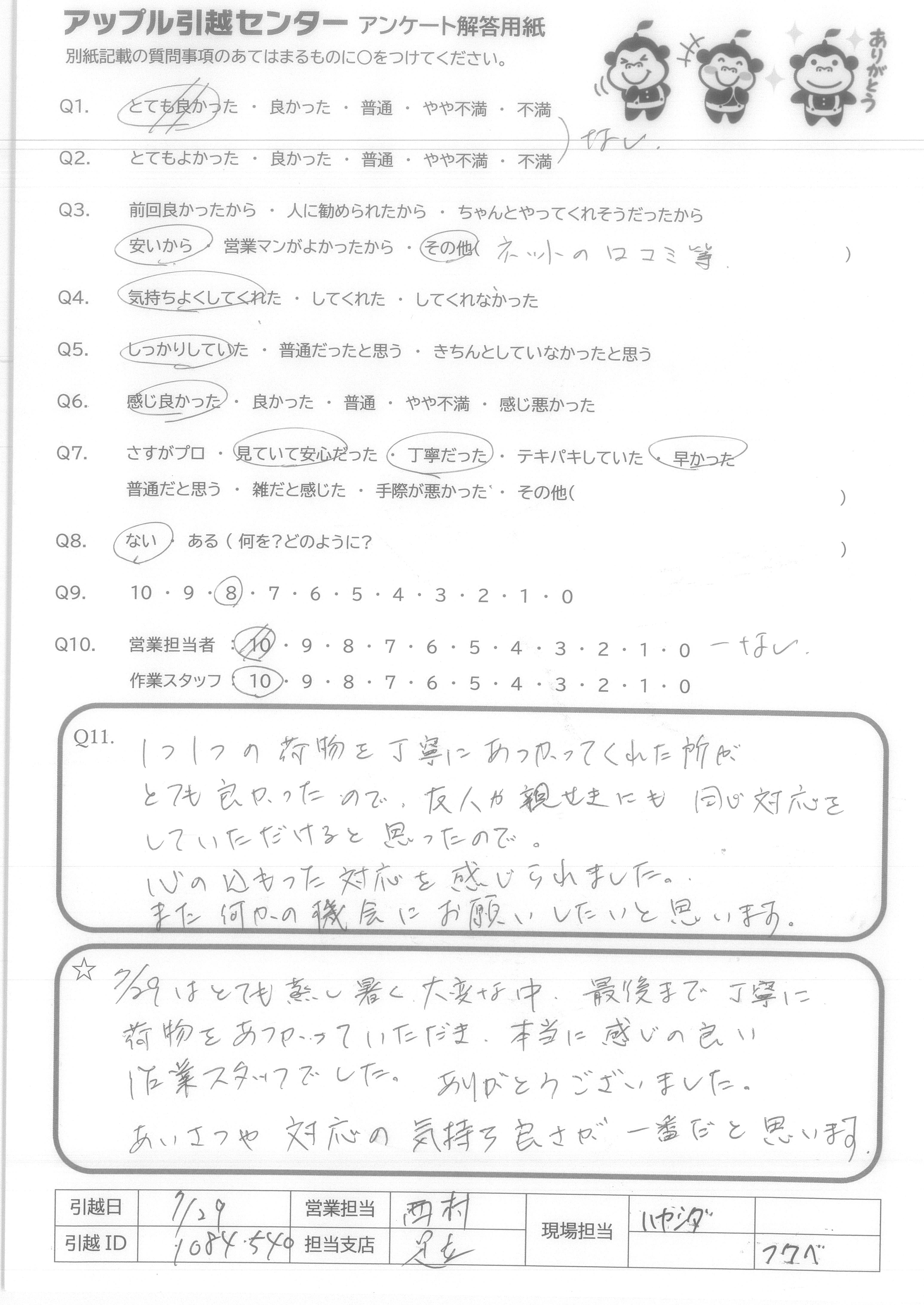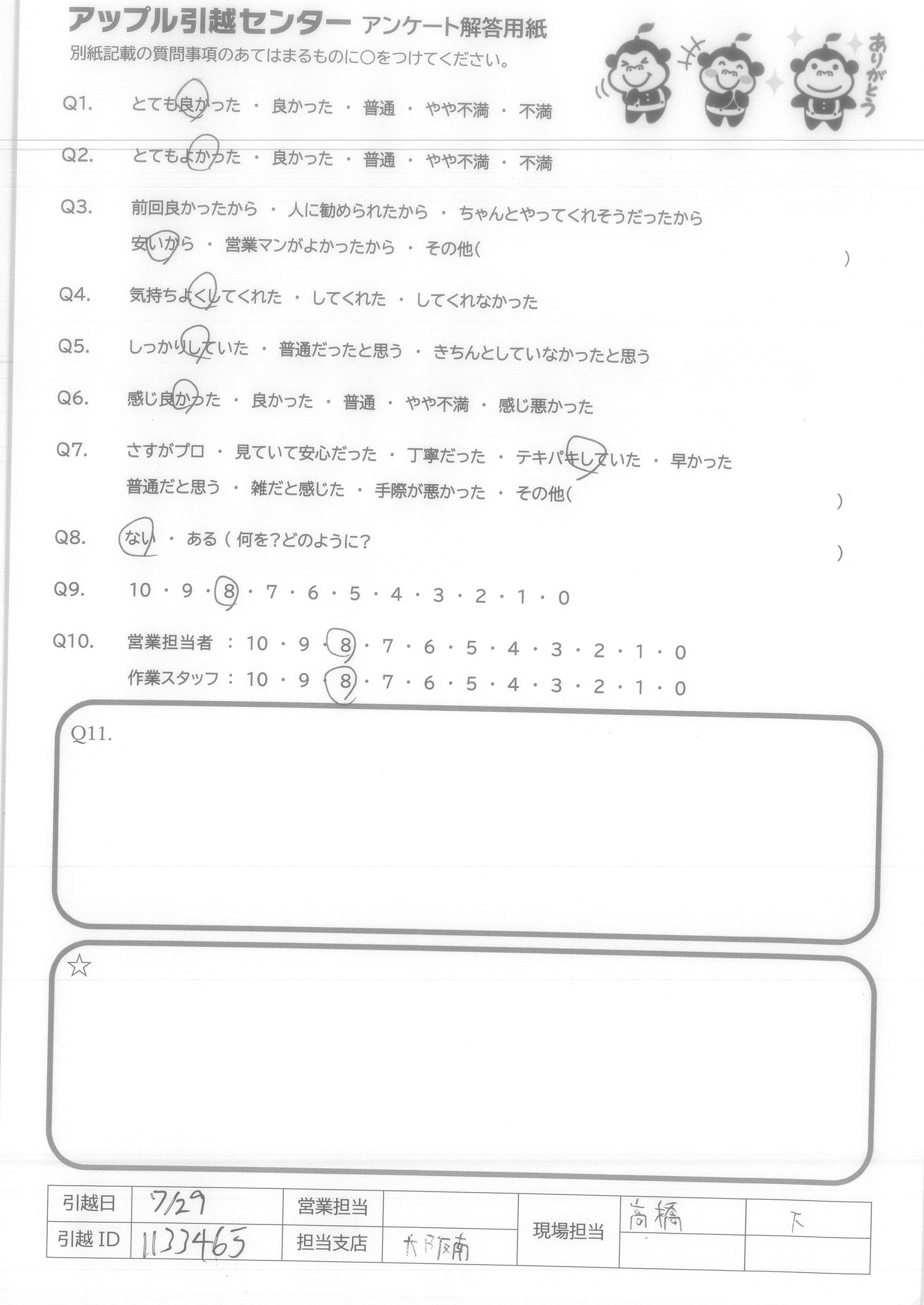 A.7/29はとても蒸し暑く、大変な中、最後まで丁寧に荷物をあつかっていただき、本当に感じの良い作業スタッフでした。ありがとうございました。あいさつや対応の気持ち良さが一番だと思います。