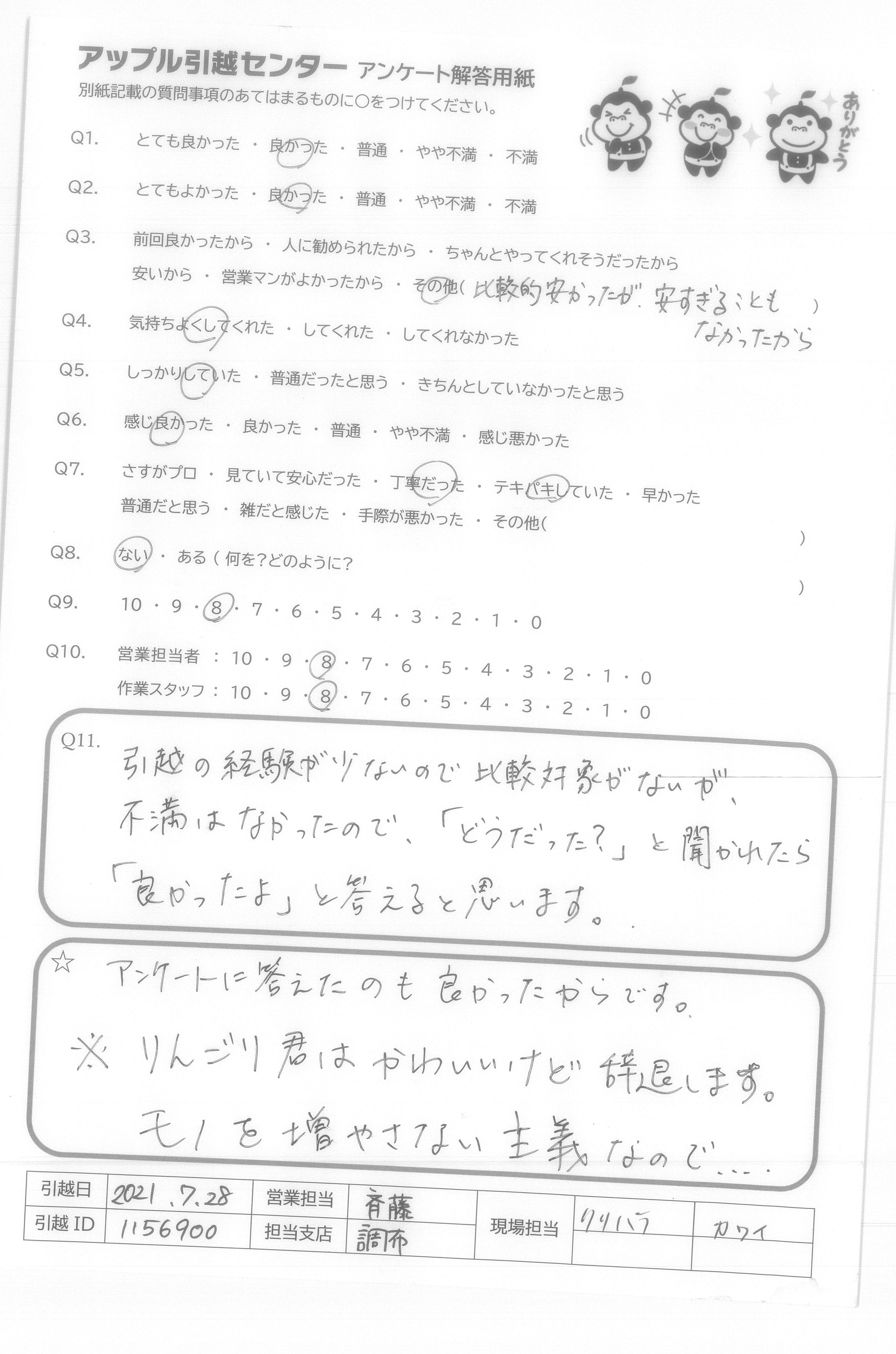 引越し日:2021年07月28日 エリア:東京都調布市